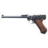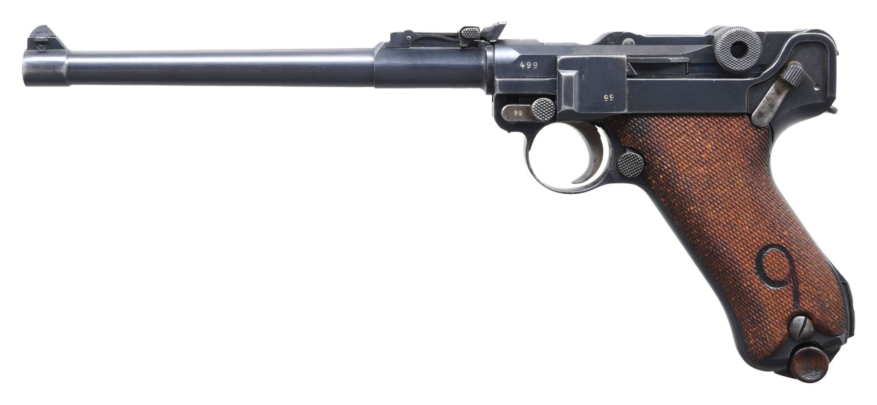 SEMI-AUTOMATIC PISTOL WITH FINE TUNE SIGHTS & RED "9" GRIPS. Cal. 9mm Luger. S# 499b. Bbl. 7 7/8". LP.08 semi-automatic pistol mfg. by DWM under contract for the Imperial German military in 1917. The bbl. extension is marked "1917" over the chamber, with DWM arsenal proofs marked on the right. Right side of the bbl. extension, bbl., and left side of the breechblock are marked with an Imperial German reichsadler proof. Metal components exhibit period arsenal applied rust blue finish overall, with some small parts including the takedown lever, trigger, safety lever, and ejector exhibiting a straw finish. Frame is mounted with 2-piece checkered wood grips, which are marked with black "9"s on either panel. While the red "9" marking was mandated during the period for only the C96 pistols to help eliminate the possibility of loading the wrong ammunition, it seems that there was some confusion at the armorer level, with some pistols, such as this example also exhibiting a distinctive "9" on the grip panels. Fine tune blade front sight, with V-notch tangent rear sight, graduated 1-8. All serialized parts are matching and include the frame, takedown lever, sideplate, trigger, safety lever & bar, hold-open latch, bbl., front sight, rear sight assembly, bbl. extension, trigger bar, breechblock, extractor, firing pin, toggles, as well as the grips. MAGS: 1 non-matching 8-rd. CONDITION: metal components retain the majority of their arsenal rust blue finish, exhibiting some spots of light to mild wear and thinning, with scattered spots of surface oxidation overall. Strawed parts show varying degrees of wear, with worn areas exhibiting a gray patina and scattered spots of age related discoloration. Very bright bore, exhibiting some light pitting, while retaining well defined rifling throughout. Grips show some smoothing, as well as some superficial marks from handling and storage, but otherwise remain sturdy and serviceable. PROVENANCE: the Estate Collection of Charles Wagner. (25-290/MLW). CURIO. $1,200-2,000.