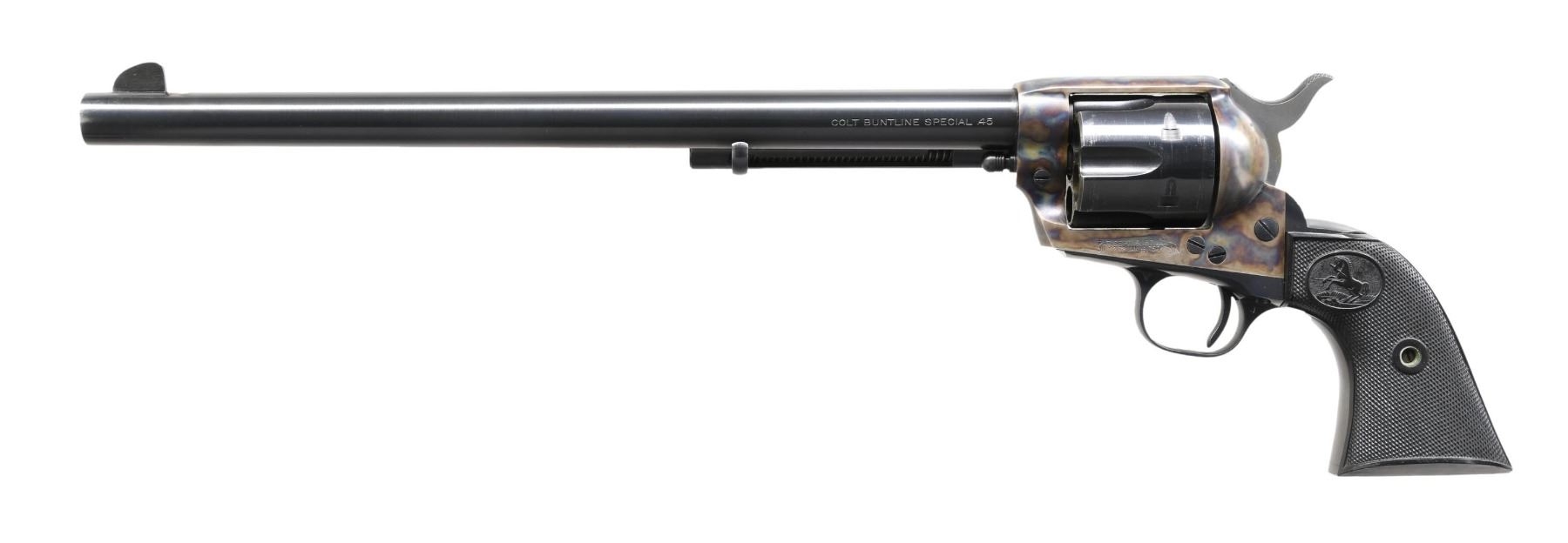 Cal. 45. S# 18890SA. Bbl. 12". Buntline Special single action revolver, mfg. by Colt in 1958. Left side of the bbl. is marked "COLT BUNTLINE SPECIAL .45", with Colt's mfg. information marked across the top. Underside of bbl. is marked "BB1436". Left side of the frame is marked with Colt's patent information, followed by the Rampant Colt logo. Frame and loading gate exhibit a case color hardened finish, with remaining metal components exhibiting a blue finish overall. Frame is mounted with 2-piece Colt checkered black plastic grips. Blade front sight, with frame notched rear sight. Matching numbers are present on the frame, grip straps (left side, beneath grip panel), and the grips, which are inscribed "890" on the interior of the panels. Matching assembly # "882" is present on the frame, loading gate, and cyl. CONDITION: very good, with metal components retaining bountiful amounts of their original factory finishes overall, exhibiting mild wear on the cyl. and left side of the bbl. at the muzzle, with some scattered spots of hardened grease and some superficial handling marks overall. Frame retains vibrant case color hardening, with some freckling present on the top strap. Mirror bore, exhibiting what appears to be some grease while retaining well-defined rifling throughout. Grips are very good overall. (24-5675/MLW). CURIO. $1,750-2,500.