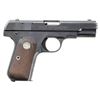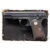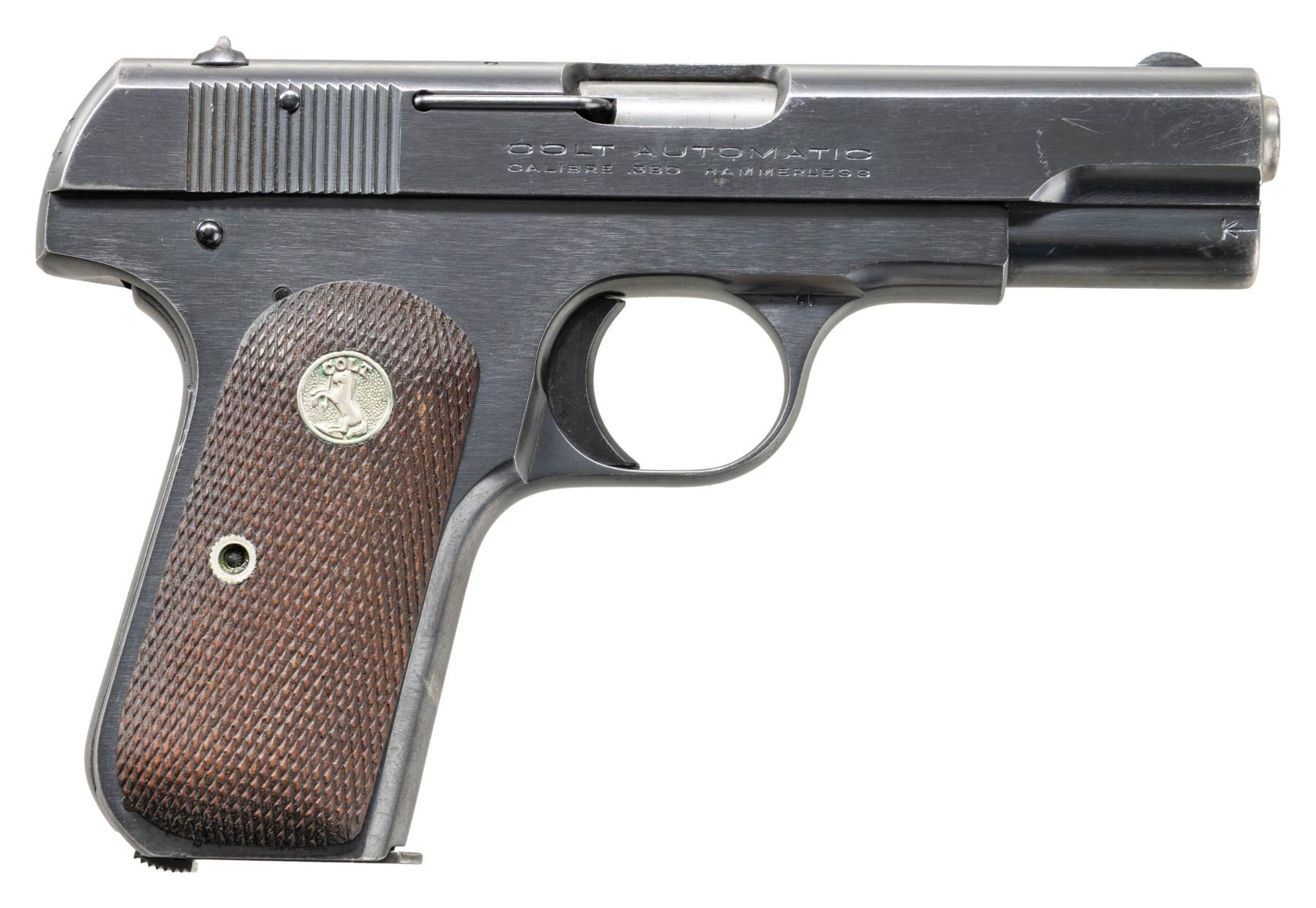 PISTOL WITH MATCHING FACTORY BOX. Cal. 380 ACP. S# 86118. Bbl. 3 3/4". Model 1908 Hammerless semi-automatic pistol mfg. by Colt. Left side of the slide is marked with Colt's 2-line mfg. and patent information, followed by the Rampant Colt logo, with "COLT AUTOMATIC/ CALIBRE .380 HAMMERLESS" marked on the right. Metal components exhibit a polished blue finish overall, save for on the chamber area of the bbl., which is polished in-the-white. Frame is mounted with 2-piece Colt silver medallion checkered wood grips. Half-moon blade front sight with dovetailed U-notch rear sight. Slide matches the frame via the full S# (on the interior). MAGS: 1 dual-tone 7-rd, and 1 unmarked blued 8-rd. UNATTACHED ACCESSORIES: matching factory box containing a wax paper disassembly & parts list guide and a later production "Handling the Handgun" pamphlet. CONDITION: metal components retain the vast majority of their original factory blue finish, showing some light to mild edge wear, scattered light superficial handling marks, as well as some pinprick spots of light surface oxidation/pitting. Bore exhibits streaks of consistent mild pitting along the edges of the lands, while retaining well defined rifling throughout. Proper manual mechanics. Grips show some light smoothing, but otherwise remain sound. Box shows exterior wear with losses to the exterior of edges, as well as tearing to the lid, but otherwise remains sound. (25-5369/MLW). CURIO. $500-800.