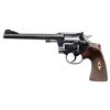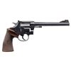 DOUBLE ACTION REVOLVER WITH KING SIGHTS. Cal. 357 Mag. S# 325950. Bbl. 7 1/2". Officer's Model heavy bbl. double action revolver mfg. by Colt in 1910 (serialized in sequence with the Army Special Model). Left side of the custom replacement bbl. is engraved "OFFICERS MODEL/ HEAVY BARREL" between 2 large Maltese crosses. Left side of the frame is marked with the Rampant Colt logo. Metal components exhibit a blue finish overall, save for on the sides of the bbl., which are polished in-the-white. Frame is mounted with 2-piece custom oversized checkered wood thumbrest grips, with the left panel exhibiting an apparent diamond bone inlay at the screw escutcheon. King red synthetic beaded blade front sight with integral reflector and King adj. square notch rear sight. Grip straps and front face of trigger feature custom checkering. Matching S#s are present on the frame and cyl. crane. CONDITION: metal components retain the majority of their original blue finish, showing some light to mild edge wear, some scattered superficial handling marks, as well as some scattered spots of light surface oxidation overall. Mirror bore, retaining well defined rifling throughout. Proper manual mechanics. Grips show some scattered superficial handling marks, with a chip present on the rear edge of the butt of both panels. Right panel exhibits a large chip on the underside at the trigger guard, with a crack present along the edge of the back strap. Left panel exhibits a small crack at the rear grip strap area. A very attractive and well made custom Colt Officers Model revolver. (25-5441/MLW). CURIO. $1,200-1,800.