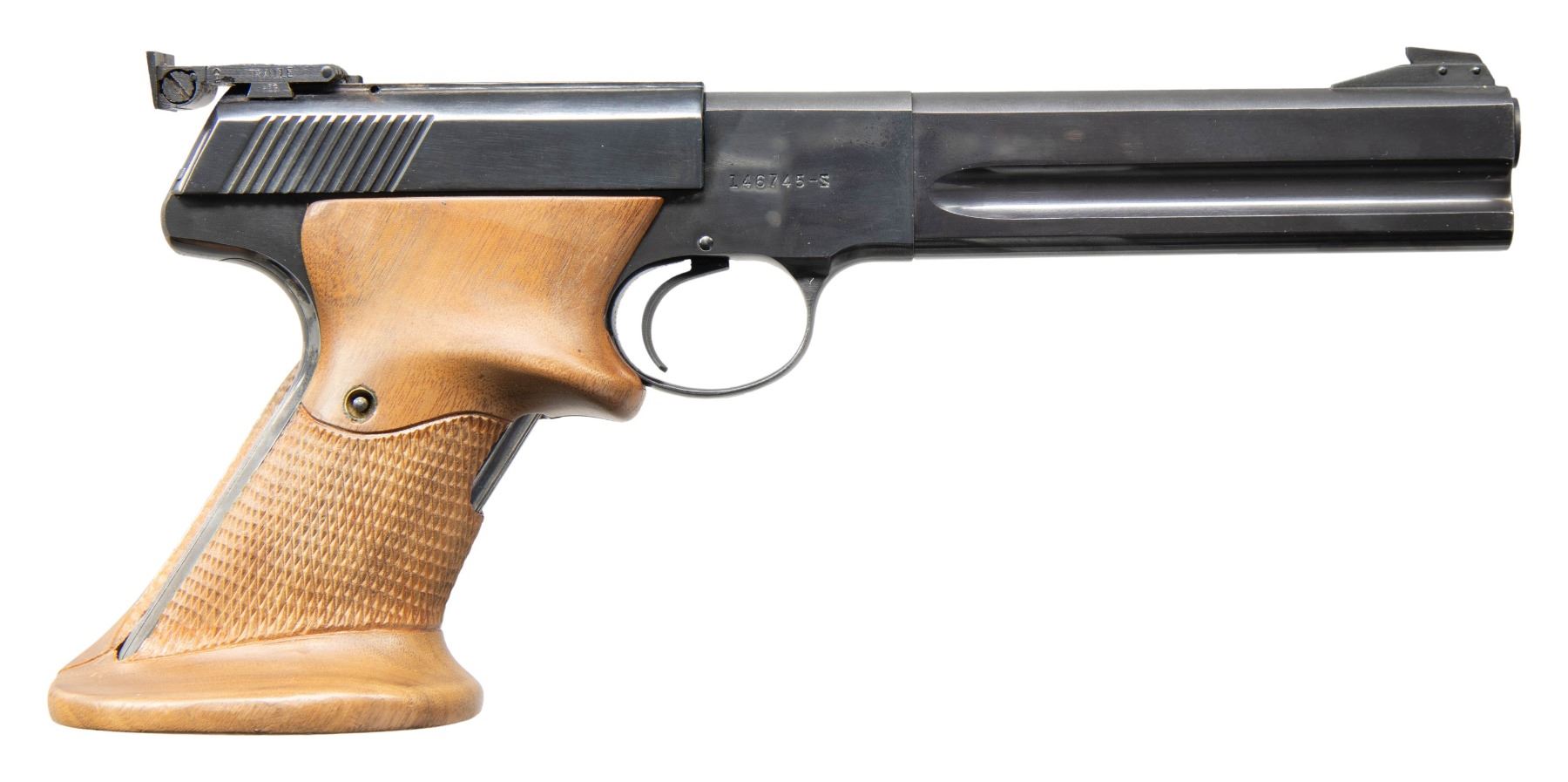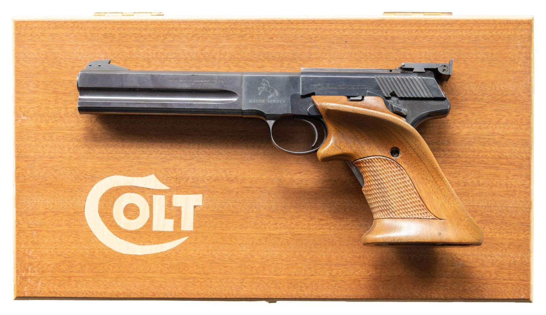 TARGET SEMI-AUTOMATIC PISTOL WITH CUSTOM CASE. Cal. 22 LR. S# 146745-S. Bbl. 6". 1 of the first 1,000 Third Series Woodsman Match Target semi-automatic pistols mfg. by Colt in 1955. These first 1,000 Match Target pistols were serialized in sequence with the 2nd Series, with Colt then skipping to S# 160001-S after this initial batch. This example is marked with Colt's 2-line mfg. and patent information on the left side of the bbl. Left side of the frame is marked with the Rampant Colt logo above "MATCH TARGET", with the S# marked on the right. Left side of the slide is marked "COLT", followed by "AUTOMATIC/ CAL. 22 LONG RIFLE". Metal components exhibit a polished blue finish overall, with the top strap of frame and bbl. exhibiting a matte blue finish. Frame is mounted with 2-piece aftermarket checkered wood grips, featuring a thumbrest on the left panel and a flare at the butt on the right panel. Ramped patridge blade front sight with dovetailed adj. square notch rear sight marked "TRIANGLE/ HEG" on the right side. MAGS: 1 10-rd. UNATTACHED ACCESSORIES: custom wood case marked with the stylized "COLT" logo on the lid. Case features a foam interior and a 40-rd. wood cartridge block. Case contains an original manual, with a printed sheet detailing the variations of the Woodsman Match Target pistol. CONDITION: metal components retain the majority of their original factory blue finish, exhibiting some light edge wear and scattered superficial handling marks, with the grip straps exhibiting areas of wear and thinning fading to gray patina. Near mirror bore, exhibiting some light pitting, while retaining well defined rifling throughout. Proper manual mechanics. Grips show some superficial marks and minor impressions from handling and storage, but otherwise remain sound. Case shows some light exterior wear, but otherwise remains sturdy and serviceable. (25-6100/MLW). CURIO. $700-1,100.