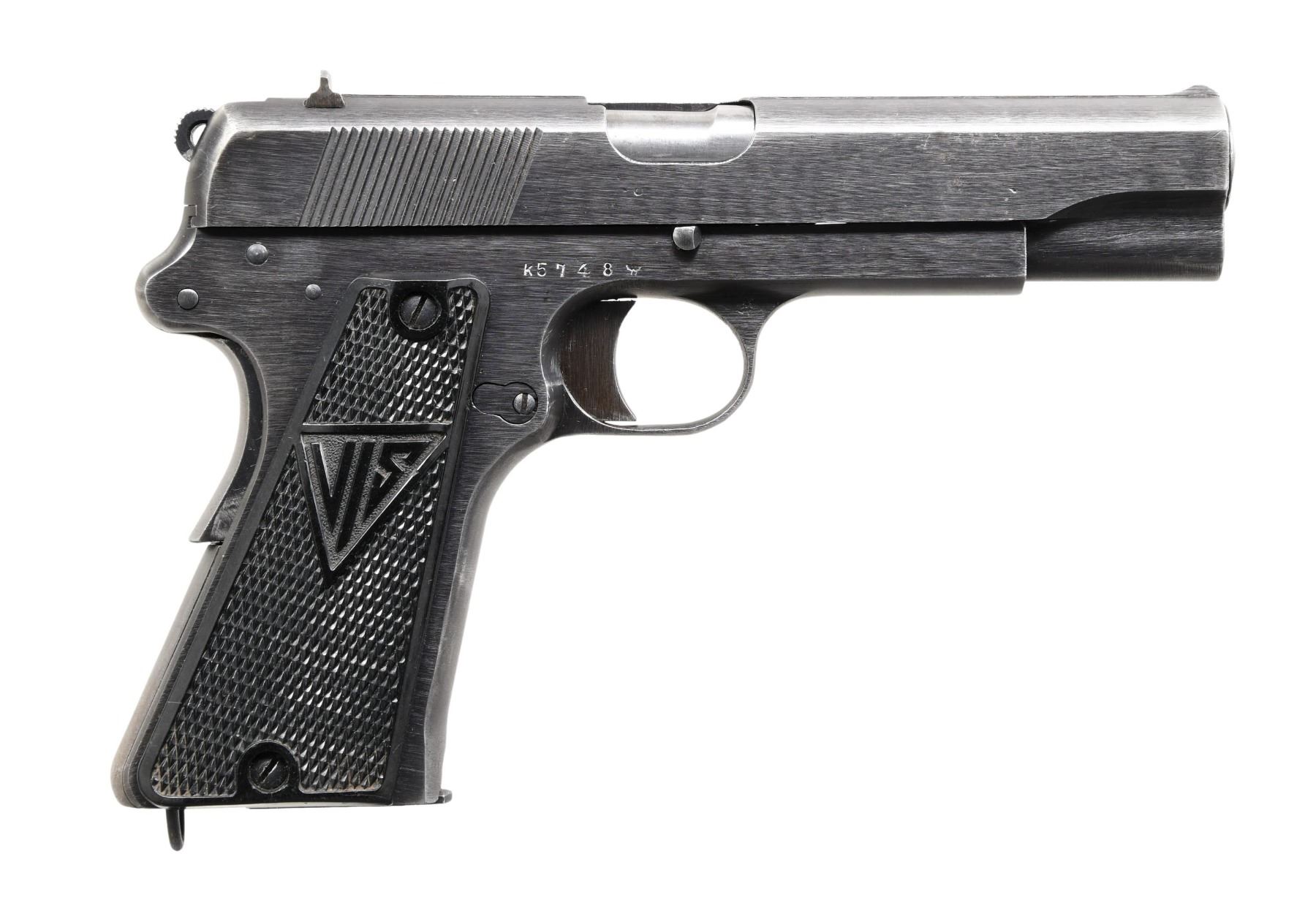 PISTOL. Cal. 9x19mm. S# K5748. Bbl. 4 5/8". Vis.35 semi-automatic pistol mfg. in Poland at the Radom arsenal while under German occupation during WWII. Left side of slide is marked "F.B. RADOM VIS Mod.35.Pat.Nr15567", followed by an eagle firing proof and Eagle/623 proof, above an Eagle/WaA77 proof, and the German designation "P.35(P.)". Left side of frame is stamped with an Eagle/WaA77 proof, with an Eagle/77 proof stamped on the right. Metal components exhibit a blue finish overall, save for on the bbl., which is polished in-the-white. Frame is mounted with 2-piece checkered black plastic grips, with "FB" marked on the left panel and "VIS" marked on the right. Matte rib with blade front sight and V-notch rear sight. All serialized parts are matching and include the frame, slide, and bbl. MAGS: one 8-rd. CONDITION: very good, with metal components retaining the majority of their original arsenal blue finish, exhibiting light to mild edge wear, some superficial handling marks, as well as a couple of small spots of light pitting on the right side of the slide. Grip straps exhibit areas of wear and thinning that show through to a gray patina. Near mirror bore, exhibiting very light pitting while retaining well-defined rifling throughout. Grips show some light smoothing, as well as some scattered nicks and marks from handling and storage, but otherwise remain sturdy and serviceable. PROVENANCE: from the estate collection of Charles Wagner. (24-4641/MLW). CURIO. $1,200-1,800.