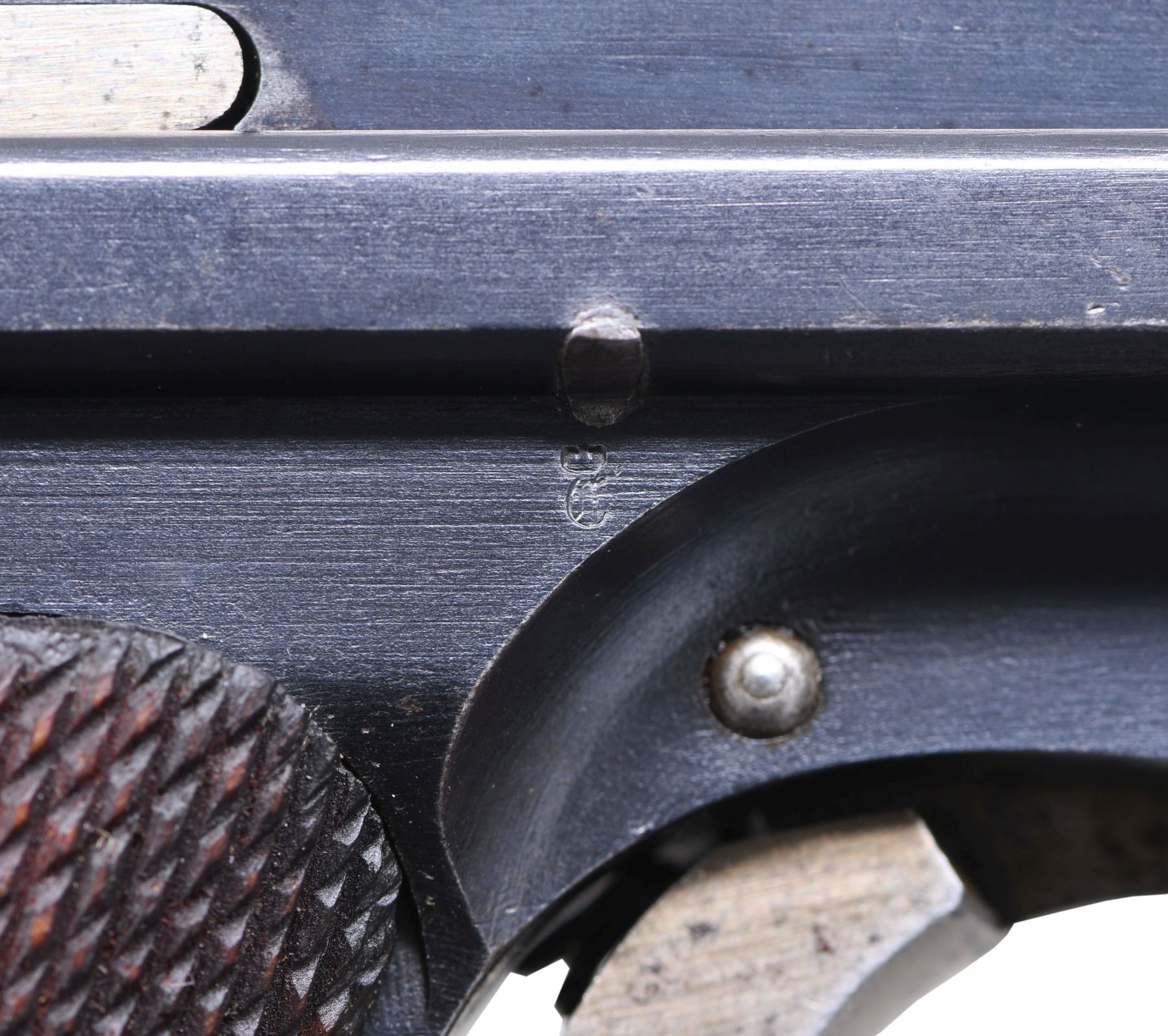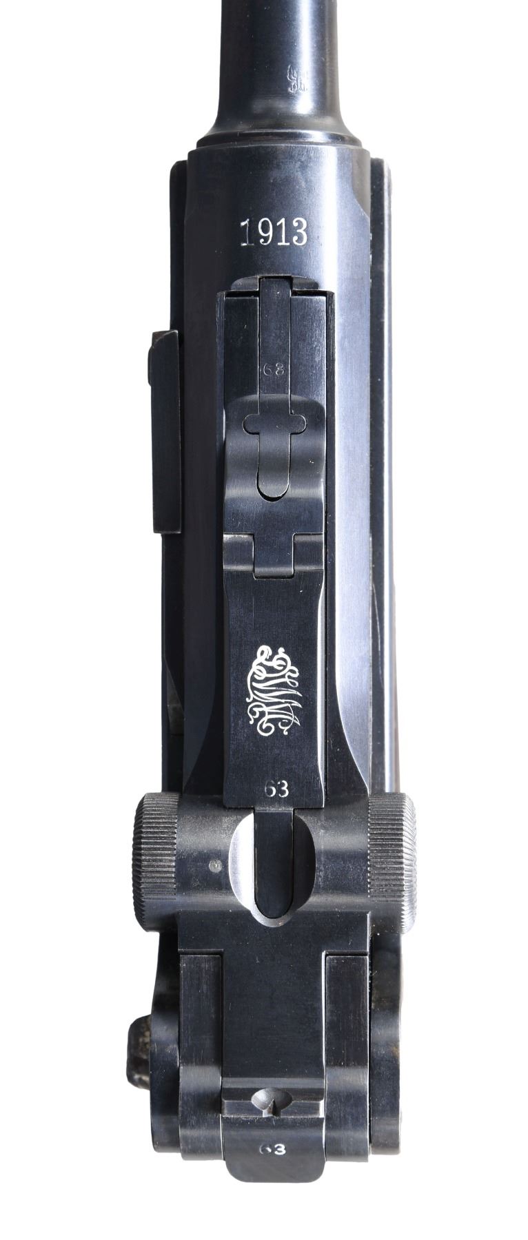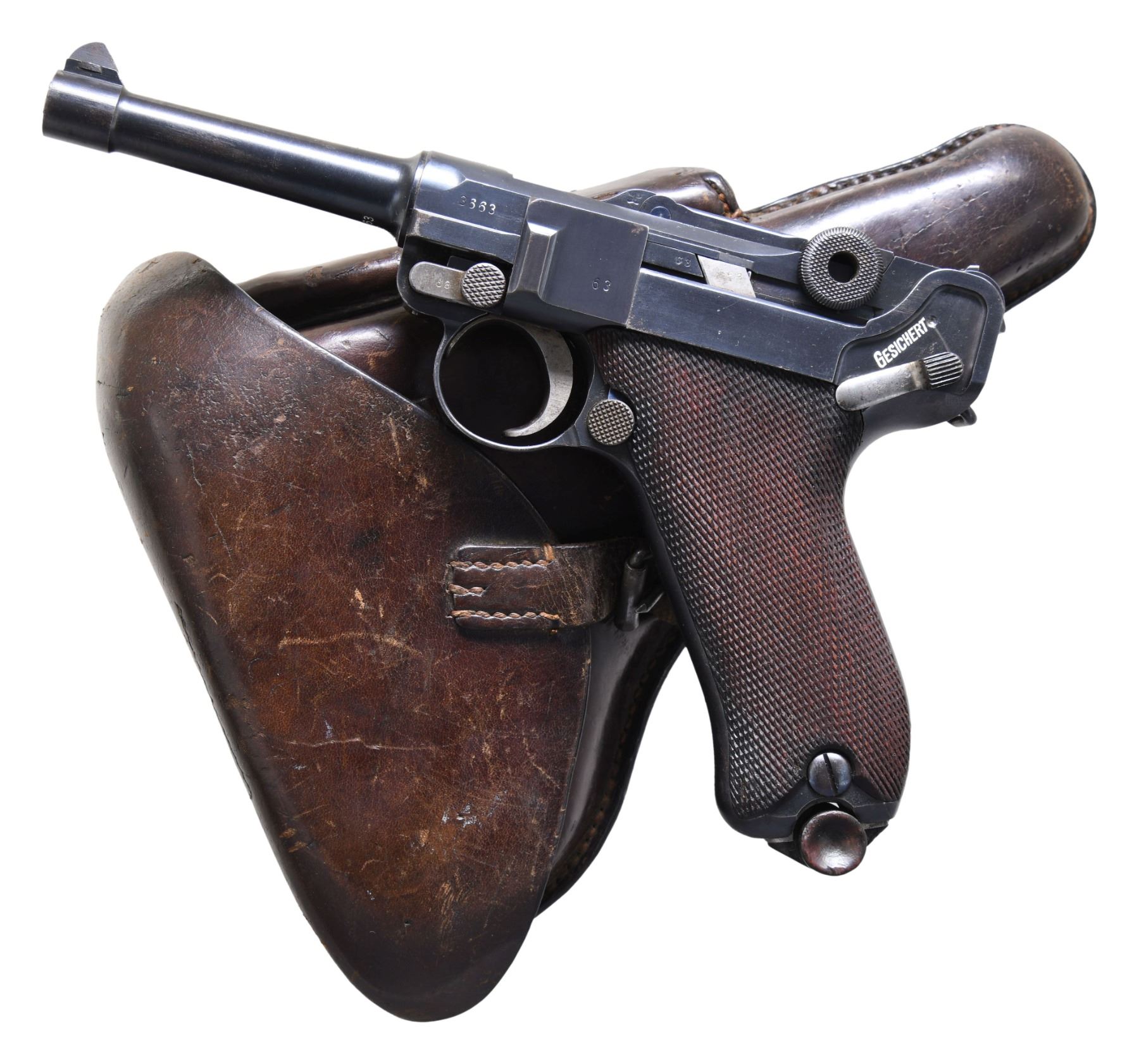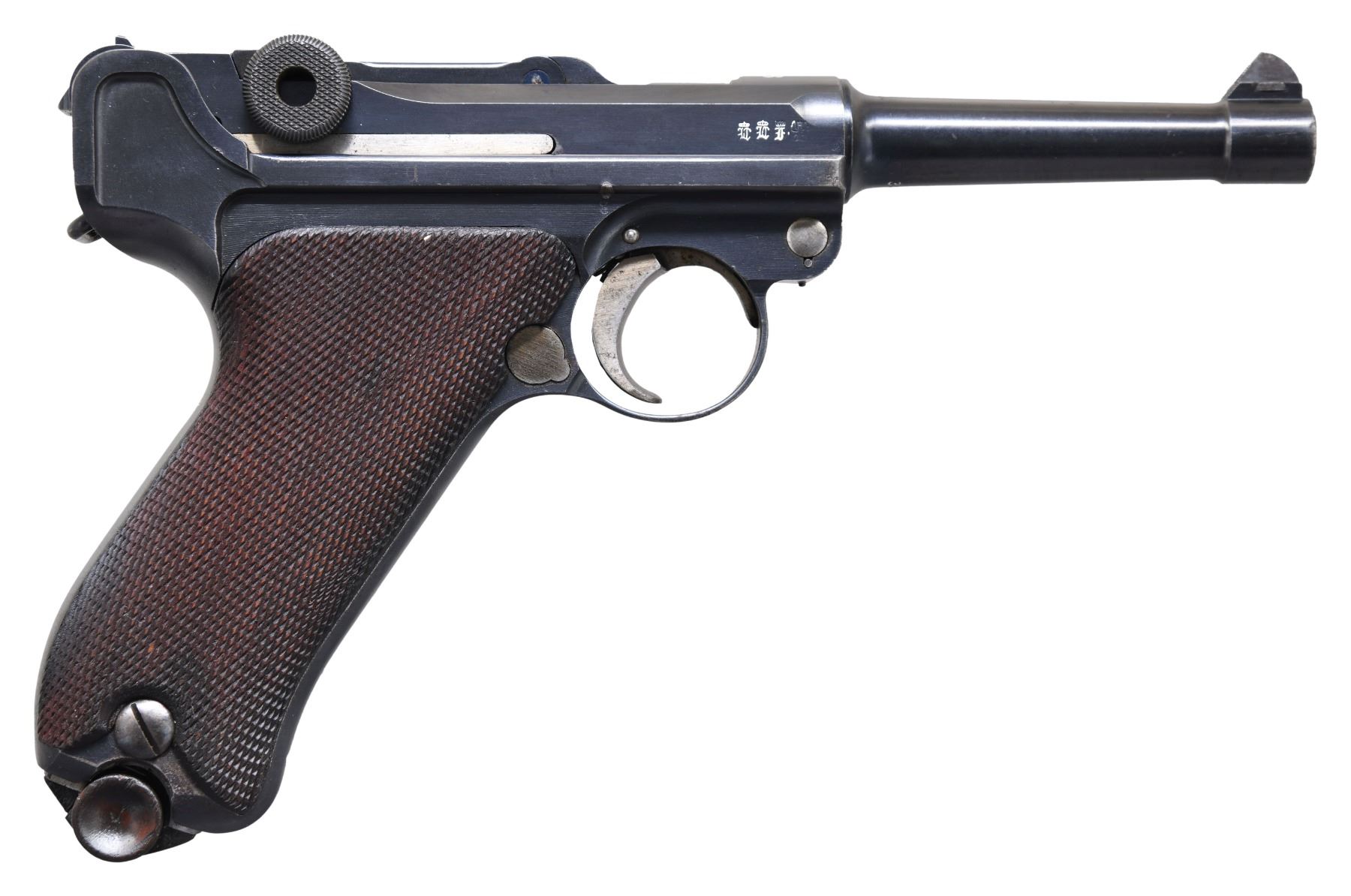 LUGER SEMI-AUTOMATIC PISTOL WITH HOLSTER. Cal. 9mm Luger. S# 3663a. Bbl. 4". P.08 Luger semi-automatic pistol mfg. by DWM in 1913 for the Imperial German military. The bbl. extension is marked "1913" over the chamber, with DWM arsenal proofs marked on the right. Toggle is marked with the intertwined "DWM" monogram. Right side of the frame exhibits a small circular incision above a small arsenal proof (also present on the hold-open latch), indicating that this example was at one time returned to the arsenal and retrofitted with a hold-open device. Metal components exhibit what appears to be a period reapplied blue finish (most likely applied at the arsenal at the time of alteration), with some small parts exhibiting either a straw or nitre blue finish. Frame is mounted with 2-piece checkered wood grips. Standard blade front sight, with V-notch rear sight. All serialized parts are matching and include the frame, takedown lever, sideplate, trigger, safety lever & bar, hold-open latch, bbl., bbl. extension, trigger bar, breechblock, extractor, firing pin, toggles, as well as the grips. MAGS: 1 non-matching wood bottom 8-rd. UNATTACHED ACCESSORIES: brown leather holster. Interior of closure flap is stamped "FRANZCOBAU/ BERLIN/ 1913", "1108", as well as with an illegible boxed ink stamp. CONDITION: very good, with metal components retaining bountiful amounts of their period arsenal blue finish, exhibiting some spots of light to mild wear and thinning that show through to gray patina, some scattered superficial handling marks, as well as some scattered small spots of dark surface oxidation overall. Frame exhibits areas of what appears to be light pitting beneath the bluing on the grip straps and trigger guard. Strawed parts show areas of wear and thinning, with worn areas exhibiting scattered spots of surface oxidation and age related discoloration. Grip screws show some wear and thinning that shows through to gray patina, with some spots of surface oxidation. Bright bore, exhibiting some light pitting, while retaining well defined rifling throughout. Grips are very good, showing some mild smoothing, as well as some scattered nicks and marks to the diamonds. Wood mag. bottom is broken, with the broken forward section remaining in the mag. body. Holster remains malleable, exhibiting wear, scattered superficial marks from handling and storage, as well as some light to mild age related cracking and crazing. A very attractive example of a 1913 production P.08 Luger mfg. by DWM. (24-6892/MLW). CURIO. $1,200-1,800.