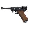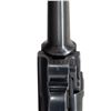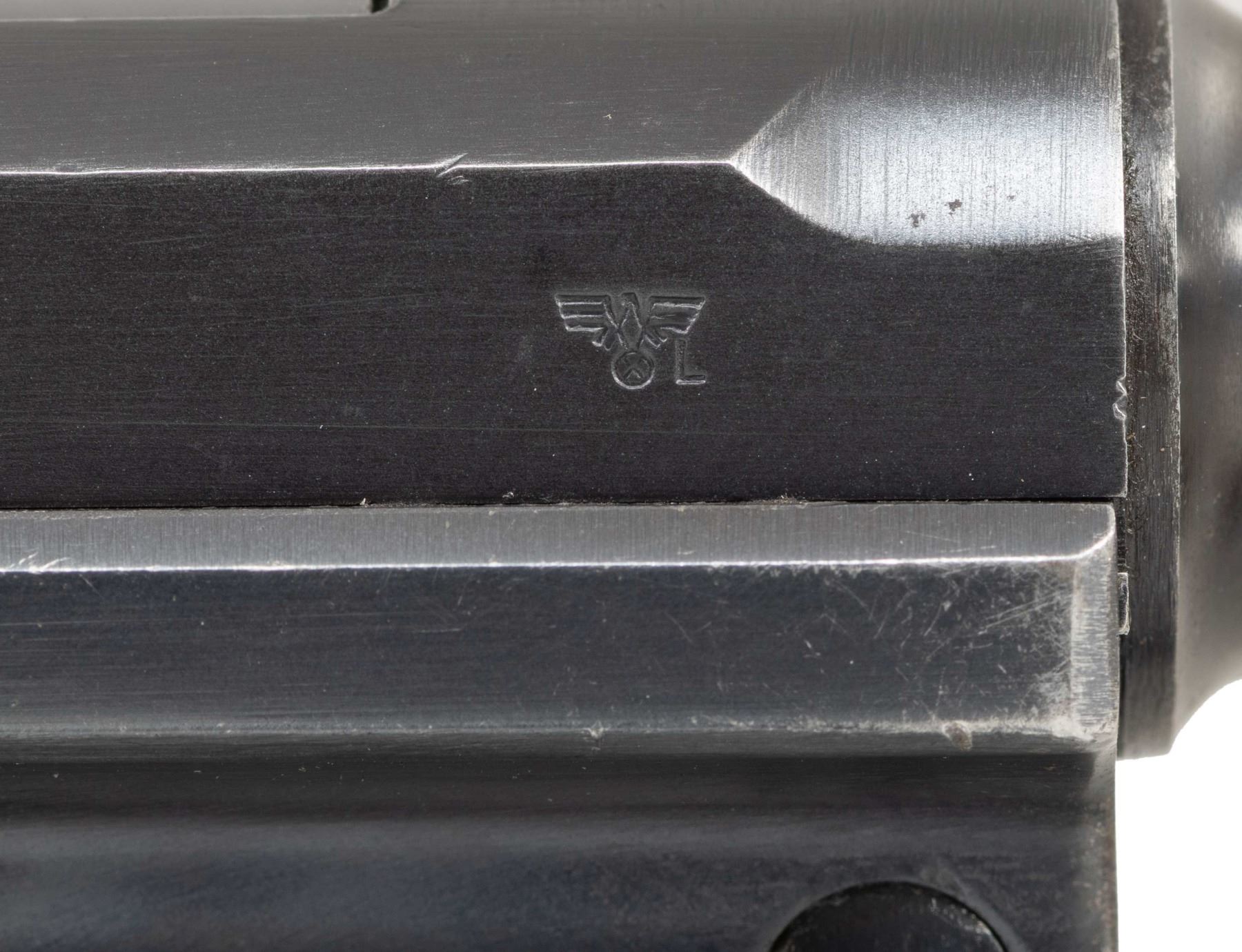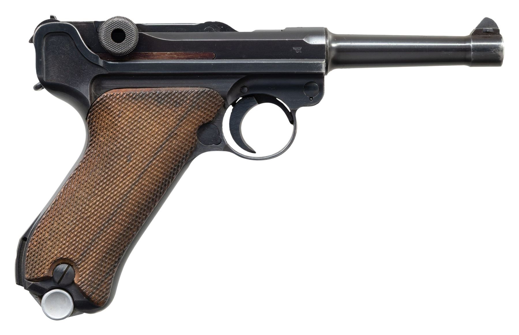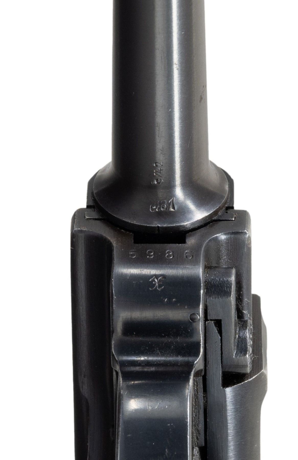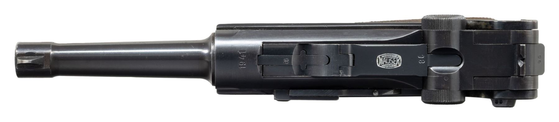 MARKED P.08 LUGER. Cal. 9mm Luger. S# 5986x. Bbl. 3 15/16". P.08 Luger semi-automatic pistol mfg. by Mauser in 1941 for German police use. The top of the bbl. extension is marked with the 4-digit year of mfg. "1941", with an Eagle/N commercial nitro proof (repeated on left side of breechblock) and the S# marked on the left, and a German police Eagle/L proof marked on the right. Left side of the unnumbered bbl. is marked with a Mauser Eagle/63 proof, with Mauser's "S/42" code marked on the underside. Toggle is marked with the Mauser banner logo. Metal components exhibit a salt blue finish overall. Frame is mounted with 2-piece checkered wood grips. Left side of bbl. extension is fitted with a Schiwy safety. Standard dovetailed blade front sight and fixed V-notch rear sight. Nearly all serialized parts are matching and include the frame, takedown lever, sideplate, trigger, safety lever & bar, bbl. extension, trigger bar, breechblock, extractor, firing pin, toggles, as well as the rear toggle pin. Hold-open latch is numbered "80". Grips are unnumbered, but exhibit Mauser Eagle/655 proofs. MAGS: 1 blued matching 8-rd. with aluminum plug marked "1/ 5986/ x". CONDITION: metal components retain the majority of their original salt blue finish, exhibiting some spots / small areas of wear and thinning fading to gray patina (primarily on edges). Mirror bore, exhibiting some small scattered spots of very light pitting, while retaining strong rifling throughout. Proper manual mechanics. Grips show some light smoothing, as well as a few scattered nicks to the diamonds, but otherwise remain very good overall. (25-6574/MLW). CURIO. $1,000-1,500.