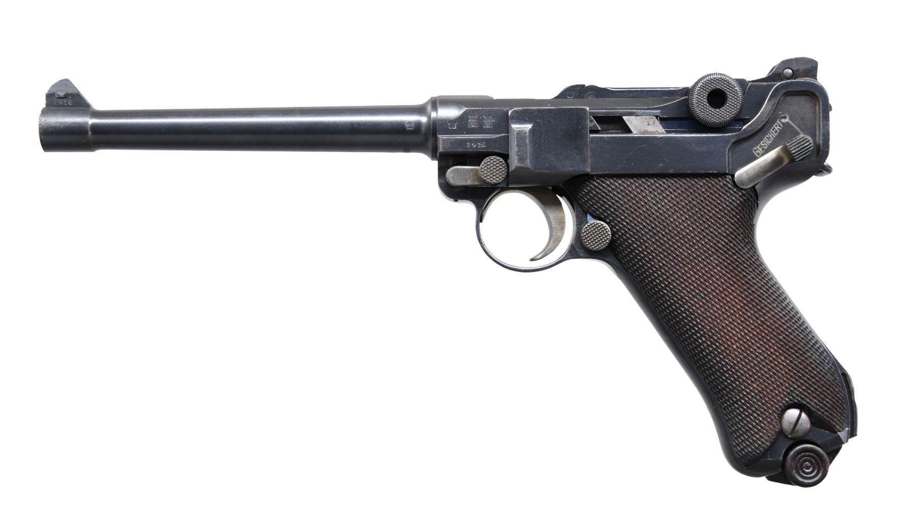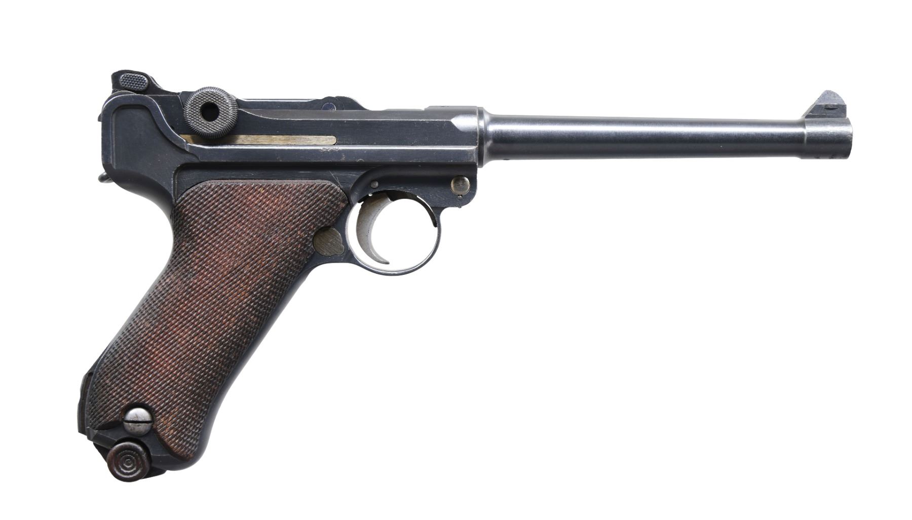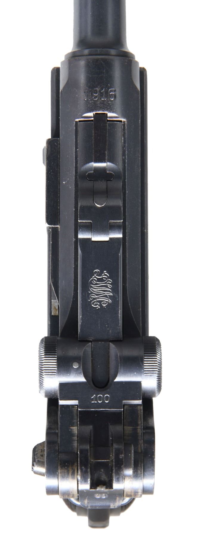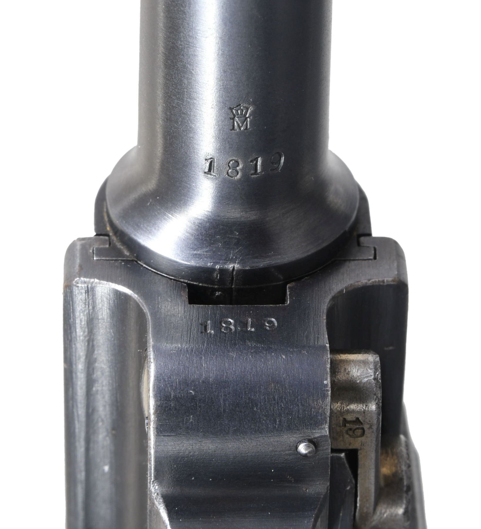 SEMI-AUTOMATIC PISTOL. Cal. 9mm Luger. S# 1819. Bbl. 6". Model 1914 Navy Luger mfg. by DWM for the Imperial German Kriegsmarine in 1916. The bbl. extension is marked "1916" over the chamber, with Imperial naval crown and Crown/M proofs marked on the left. Toggle is marked with the intertwined "DWM" monogram. Left side of the frame and front sight block are marked "1916". Metal components exhibit what appears to be a period reapplied rust blue finish, with some small parts being strawed. Frame is mounted with 2-piece checkered wood grips. Blade front sight, with adj. rear sight graduated 100-200. All serialized parts are matching and include the frame, takedown lever, sideplate, safety lever & bar, bbl., bbl. extension, trigger bar, breechblock, and toggles. Grips are unnumbered. MAGS: 1 8-rd. naval proofed (S# 2219). CONDITION: metal components retain the majority of their period reapplied blue finish, exhibiting some spots of mild wear and thinning, with some scattered spots of mild pitting present overall. Strawed parts retain the majority of their original finish, exhibiting some wear and thinning, with scattered spots of age related discoloration. Mirror bore, exhibiting strong rifling throughout. Grips show some smoothing, as well as a couple of nicks and marks from handling and storage, but otherwise remain sturdy and serviceable. (24-6757/MLW). CURIO. $2,500-4,000.