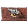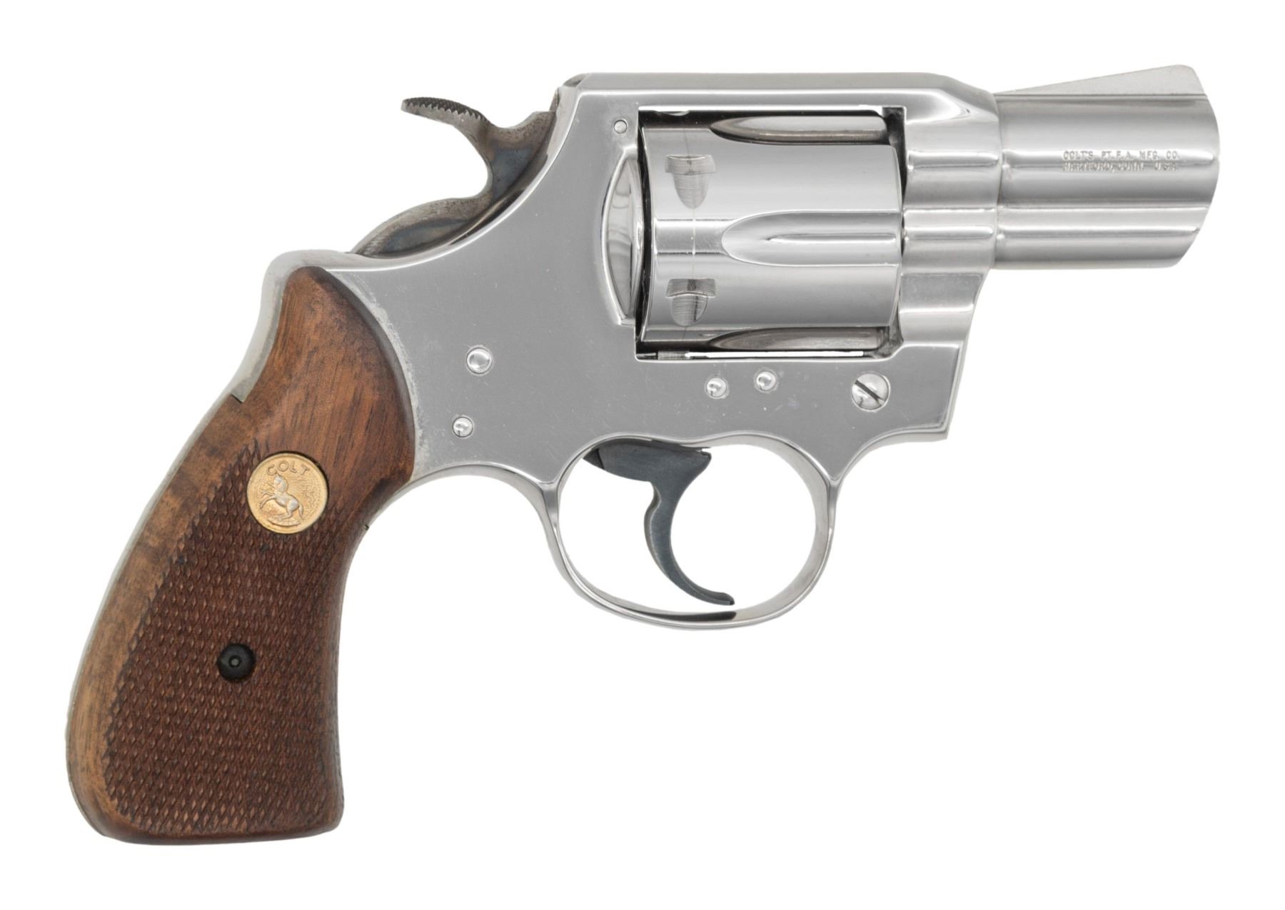 ACTION REVOLVER WITH FACTORY BOX. Cal. 357 Magnum. S# L78974. Bbl. 2 1/8". Lawman Mk III double action revolver mfg. by Colt in 1978. Left side of the bbl. is marked "LAWMAN MK III/ .357 MAGNUM CTG", with Colt's 2-line address marked on the right. Left side of the frame is marked with the Rampant Colt logo, as well as with Colt's "VP" proof. Metal components exhibit a nickel plated finish overall, save for on the trigger, which is blued, and the hammer, which exhibits a case color hardened finish. Frame is mounted with 2-piece Colt gold medallion checkered wood grips. Fixed ramp blade front sight, with square frame notched rear sight. UNATTACHED ACCESSORIES: factory box and styrofoam insert. CONDITION: metal components retain bountiful amounts of their original factory finishes, exhibiting some superficial handling marks, with a few small spots of bubbling and flaking present on the left side of the frame. Mirror bore, exhibiting a thin layer of grease, while retaining well defined rifling throughout. Grips show a few superficial marks from handling and storage, but are otherwise very good overall. Box shows moderate wear, with the end flap with the end label being absent. (25-1240/MLW). MODERN. $600-1,000.