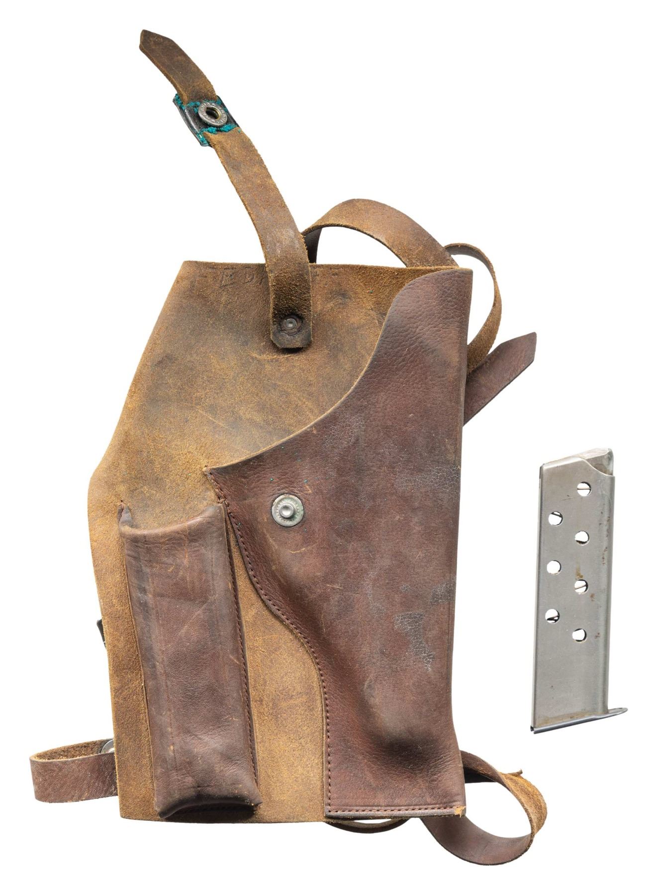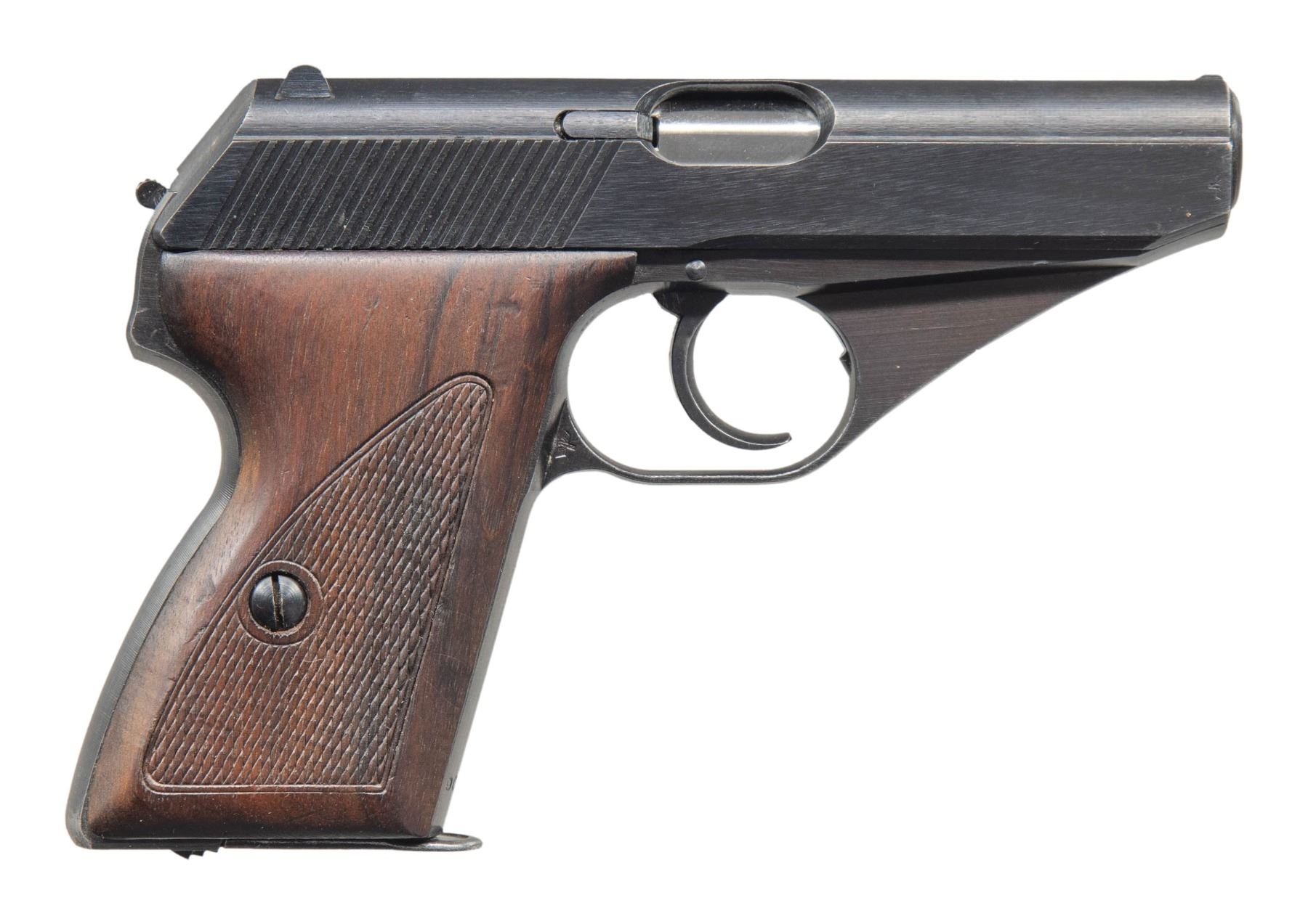 PISTOL WITH HOLSTER. Cal. 7.65mm. S# 908200. Bbl. 3 5/16". HSc semi-automatic pistol mfg. by Mauser for police use. Left side of the slide is marked with the Mauser banner logo, followed by "Mauser-Werke A.G. Oberndorf a.N./ Mod. HSc (3-lines) Kal. 7,65mm". Left side of the rear trigger guard web is marked with a German police Eagle/L proof, with an Eagle/N commercial nitro proof marked on the right. Metal components exhibit a blue finish overall, save for on the bbl., which is polished in-the-white. Frame is mounted with 2-piece flat checkered wood grips. Slide features a full length sight groove with an integral blade front sight and dovetailed U-notch rear sight. Matching numbers are present on the frame and slide. Bbl. is mismatched via "233". MAGS: 2 8-rd. UNATTACHED ACCESSORIES: custom period brown leather shoulder holster, lightly marked with what appears to read "FEDROFF" on the front in black ink. CONDITION: metal components retain the vast majority of their original arsenal blue finish, exhibiting some spots of light edge wear, some scattered superficial handling marks, as well as some scattered spots of light surface oxidation and pitting on the right side of the slide. Mirror bore, retaining well defined rifling throughout. Proper manual mechanics. Grips are very good, showing some minor superficial marks and impressions. Holster remains malleable, exhibiting some scattered handling marks and spots of crazing overall. (25-5622/MLW). CURIO. $500-800.