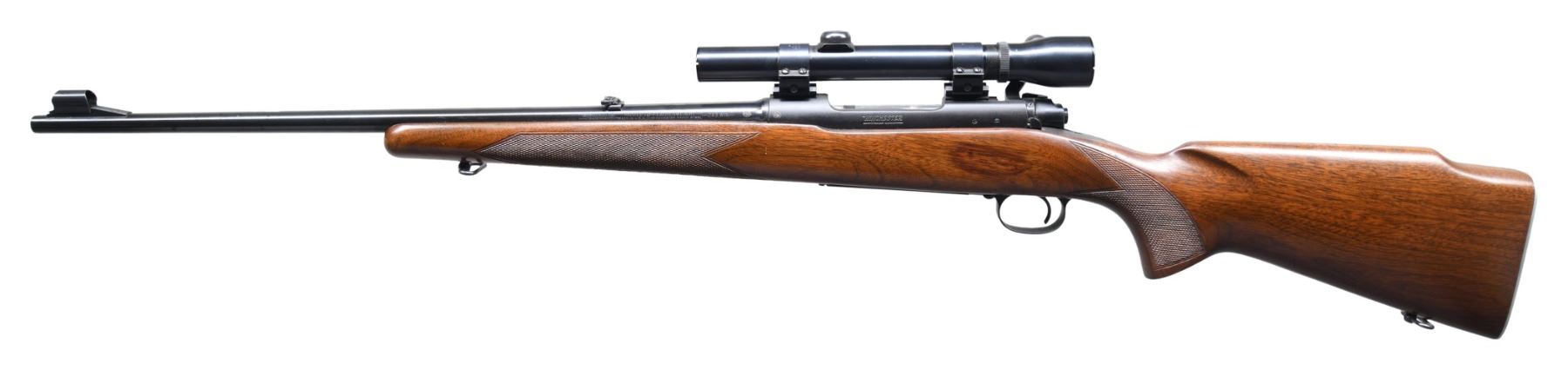 BOLT ACTION RIFLE. Cal. 243 Win. S# 361413. Bbl. 22". Model 70 Featherweight bolt action rifle mfg. by Winchester in 1956. Left side of the bbl. exhibits the Winchester trademark logo, followed by standard factory markings denoting the model and cal. designations. Receiver exhibits a dull blue finish, with the bbl., bolt handle, and bolt shroud exhibiting a standard blue finish. Bolt is polished in-the-white. Aluminum trigger guard exhibits a black anodized finish, with the aluminum floorplate exhibiting a blue anodized finish. 1-piece checkered wood Monte Carlo pistol grip buttstock, with checkered aluminum buttplate. Ramped, hooded, and aluminum beaded blade front sight, with flip-up U-notch rear sight. Receiver is mounted with a set of Weaver detachable scope rings, fitted with a Weaver K3 60-B scope. CONDITION: metal components retain the vast majority of their original factory blue finish, exhibiting some small spots of discoloration and light surface oxidation on the bbl. Bolt knob and handle show light to mild thinning that shows through to gray patina. Mirror bore, exhibiting well defined rifling throughout. Stock shows some superficial marks from handling and storage, but otherwise remains very good overall. Scope retains a clear and sharp optic. PROVENANCE: Estate of Russell Dickerman. (25-1946/MLW). CURIO. $800-1,200.