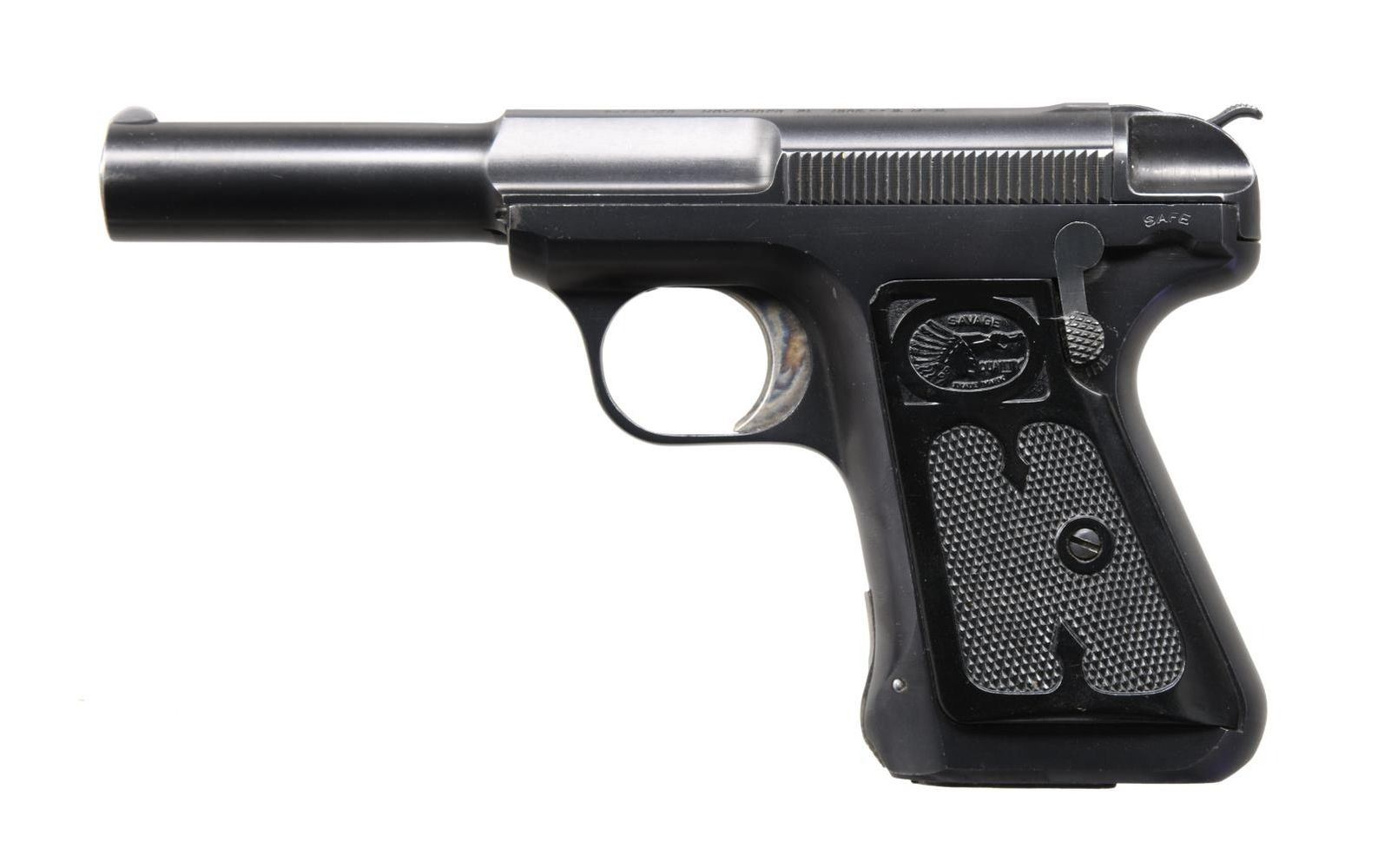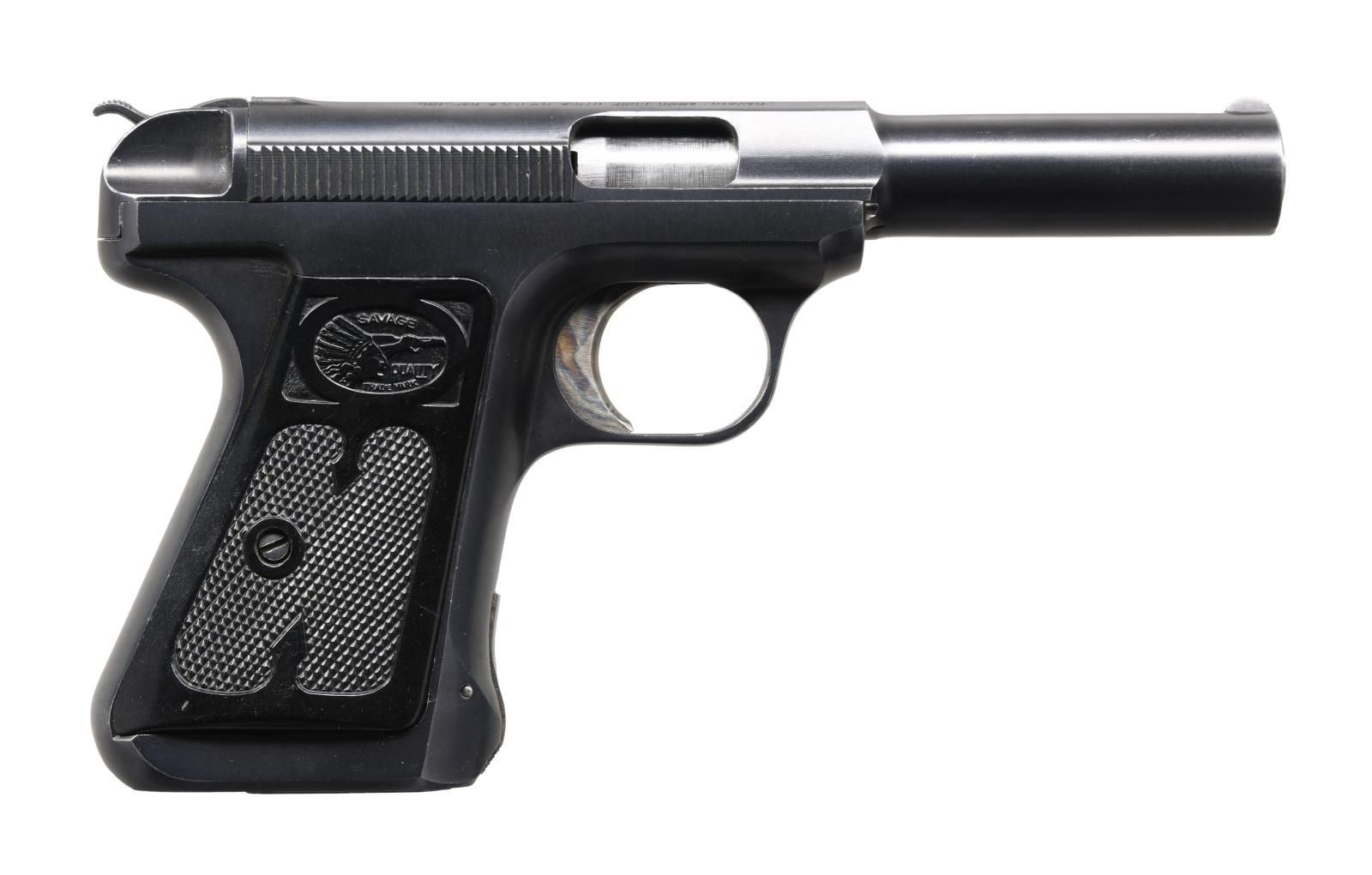 Cal. 380 ACP. S# 21635B. Bbl. 4 1/4". Model 1917 semi-automatic pistol mfg. by Savage Arms Company. The top of the slide is marked with Savage's mfg. and patent information, as well as with the cal. designation. Metal components exhibit a blued finish, with the trigger exhibiting a case color hardened finish. Frame is mounted with 2 piece Savage checkered hard rubber grips. Blade front sight with frame square notch rear sight. MAGS: 1 9-rd. CONDITION: metal components retain bountiful amounts of their original factory blue finish, exhibiting a few small spots of minor wear and thinning, as well as a few superficial handling marks overall. Trigger retains strong and vibrant case coloring. Brilliant mirror bore, exhibiting sharp and well defined rifling throughout. Grips show some light smoothing and a few scattered marks from handling and storage, but otherwise are very good overall. A very nice example of a Savage Model 1917 pistol. (23-5165/MLW). CURIO. $600-900.