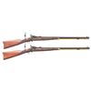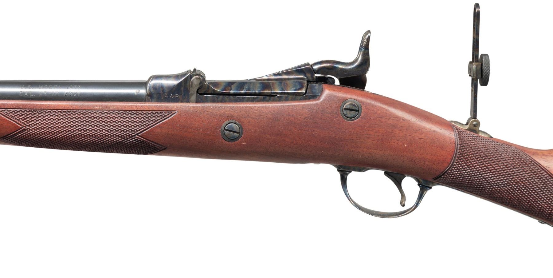 RICHARDSON MODEL 1873 OFFICER'S MODEL TRAPDOOR SINGLE SHOT RIFLES WITH FACTORY SHIPPING BOXES. Cal. 45-70. S# (1):7468. (2): 7469. Bbls. 26". Sequential pair of Model 1873 Trapdoor Officer's Model single shot rifles produced by Harrington & Richardson to commemorate H&R's centennial. Left side of the bbls. are marked "U.S. MODEL 1873/ CAL. 45-70 GOVT.", followed by "P", with H&R's mfg. information marked on the right. Left side of the breech section of the receivers are marked "H&R", with the S#s marked on the right. Top of breechblocks are marked "U.S./ MODEL/ 1873". Right side of the bbl. bands are marked "U". The lockplates are marked with a patriotic eagle followed by "U.S./ SPRINGFIELD" surmounted by foliate scroll engraving, which extends to the side of the hammers, top of the breech sections of the receiver, areas of the breechblocks, upper receiver tangs, upper buttplate tangs, trigger guard bows, as well as the top of the bbl. bands. Receivers, breechblocks, hammers, lockplates, rear sight assemblies, trigger guards, and buttplates exhibit a case colored finish, with the bbls. and bbl. bands exhibiting a blue finish. 1-piece single band fastened checkered wood straight grip buttstocks with engraved pewter tipped nose caps. Underside of stocks are stamped with an encircled "P" cartouche on the toeline. Brass beaded dovetailed blade front sights with Vernier style tang mounted aperture rear sights. Each rifle is complete with its hardwood non-ferrous metal tipped cleaning rod. UNATTACHED ACCESSORIES: original factory shipping boxes (matching via a handwritten S# on one end label) containing factory styrofoam inserts and factory manuals. 1 box retains its brass commemorative oval plaque marked "OFFICER'S MODEL/ SPRINGFIELD RIFLE/ Harrington & Richardson Centennial/ 1871-1971". CONDITION: rifles retain the vast majority of their original factory finishes, showing no signs of prior use, exhibiting some scattered spots/areas of light to mild surface oxidation that is predominately on the buttplates and bbl. bands. Case colored parts/components retain virtually all of their original vibrant factory finish. Mirror bores, retaining well defined rifling throughout. Proper manual mechanics. Stocks are excellent overall, exhibiting few minute superficial handling marks. Boxes show general overall wear, with some minor tearing at end flap edges. 1 box shows several holes, with the other missing one of its short side end flaps, but both otherwise remains sound. A very attractive pair of sequentially serialized H&R centennial Model 1873 Officer's Model Trapdoor rifles. (25-5599&25-5600/MLW). BOTH CURIO. $1,000-2,000.