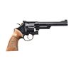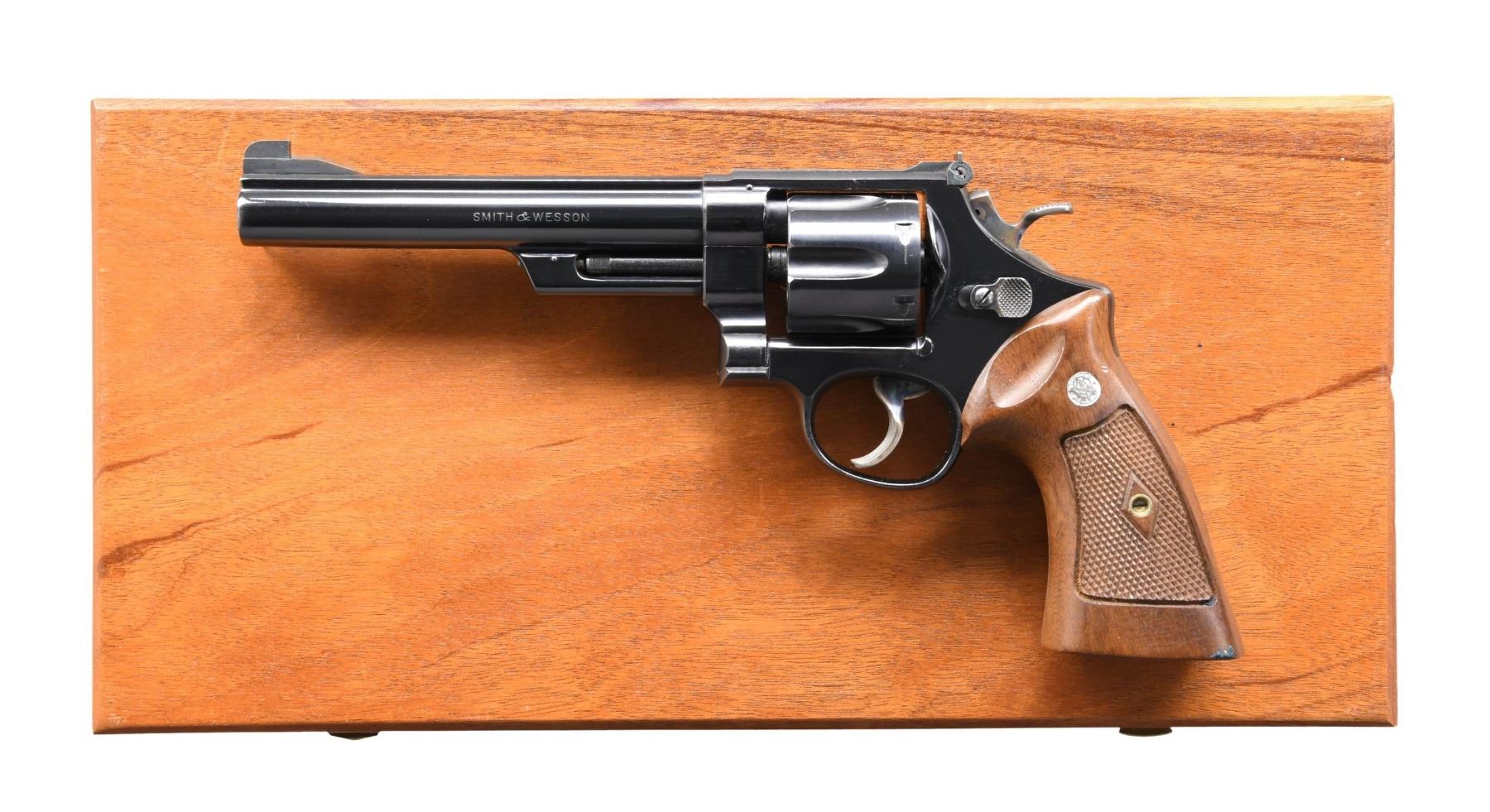 REVOLVER WITH DISPLAY CASE. Cal. 45. S# S166171. Bbl. 6 1/2". Model 1955 double action revolver, mfg. by Smith & Wesson, circa. 1956-1957. Left side of the bbl. is marked "SMITH & WESSON", with "45 CAL. MODEL 1955" marked on the right. Right side of the frame is marked with the S&W trademark logo, followed by S&W's mfg. information. Metal components exhibit a blue finish overall, save for on the trigger and hammer, which exhibit a case color hardened finish. Frame is mounted with 2-piece S&W medallion checkered wood grips. Ramped blade front sight, with adj. square notch rear sight. Matching numbers are present on the frame, cyl., ejector, and bbl. Matching assembly #s are present on the frame and cyl. crane. UNATTACHED ACCESSORIES: wood display case, containing four moon clips, disassembly tool, as well as a cleaning rod. CONDITION: metal components retain bountiful amounts of their original factory blue finish, exhibiting light to mild edge wear, some superficial handling marks, as well as a few minute spots of surface oxidation. Right side of the muzzle exhibits a small, concentrated area of wear that shows through to gray patina. Trigger and hammer retain strong case color hardening. Mirror bore, exhibiting a few small spots of pitting/oxidation towards the muzzle while retaining well-defined rifling throughout. Grips are very good, showing a few scattered marks and minor impressions overall. Case shows some light to mild exterior wear from handling and storage, but otherwise remains sturdy and serviceable. (24-5645/MLW). CURIO. $1,200-1,800.