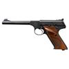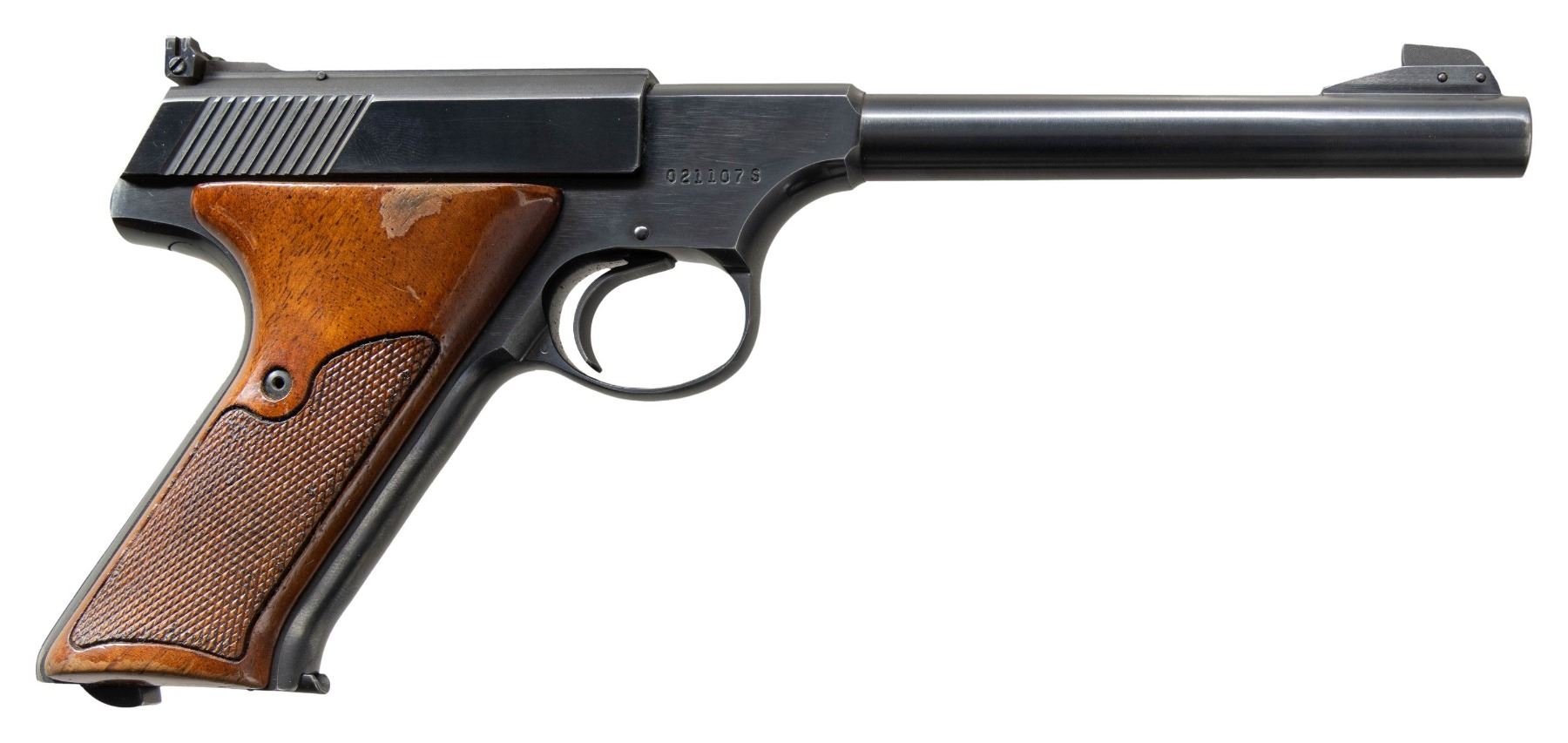 PISTOL. Cal. 22 LR. S# 021107S. Bbl. 6". Third Series Woodsman semi-automatic pistol mfg. by Colt in 1970. Left side of the bbl. is marked with Colt's single line address, with the Rampant Colt logo above "WOODSMAN" marked on the left side of the frame at the chamber area. Left side of the slide is marked "COLT", followed by the cal. designation. Metal components exhibit a blue finish overall. Frame is mounted with 2-piece checkered wood thumbrest grips and features a heel mag. release. Pinned ramped blade front sight and adj. square notch rear sight. MAGS: 1 10-rd. CONDITION: metal components retain the majority of their original factory blue finish, showing light edge wear and some mild wear on the edges of the muzzle. Bottom right corner of rear grip strap shows an area of wear fading to gray patina. Mirror bore, retaining well defined rifling throughout. Grips show some finish wear, as well as some scattered marks and minor impressions from handling and storage, but otherwise remain sound. (25-5205/MLW). CURIO. $900-1,500.