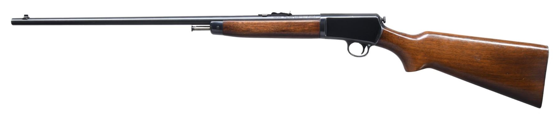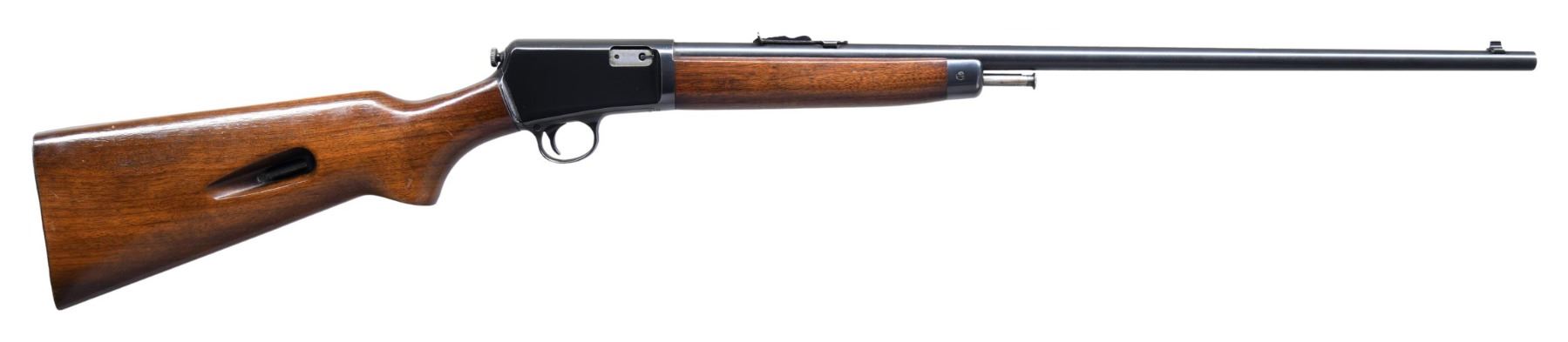 Cal. 22 LR. S# 142627. Bbl. 23". Model 63 semi-automatic rifle mfg. by Winchester in 1956. Left side of the bbl. exhibits standard factory markings denoting the model and cal. designations. Metal components exhibit a blue finish overall, save for on the bolt and plunger bar, which are polished in-the-white. Plain wood pistol grip buttstock, with plain wood forend. Buttstock appears to have had varnish added at one time. Dovetailed aluminum beaded blade front sight, with dovetailed U-notch rear sight. Matching numbers are present on the upper and lower assemblies. CONDITION: metal components retain the vast majority of their original factory blue finish, exhibiting few spots of light wear and thinning, with some scattered superficial handling marks present overall. Mirror bore, exhibiting well defined rifling throughout. Wood furniture shows some scattered superficial marks from handling and storage, with some scattered small spots of flaking present on the butt. (25-2039/MLW). CURIO. $600-900.