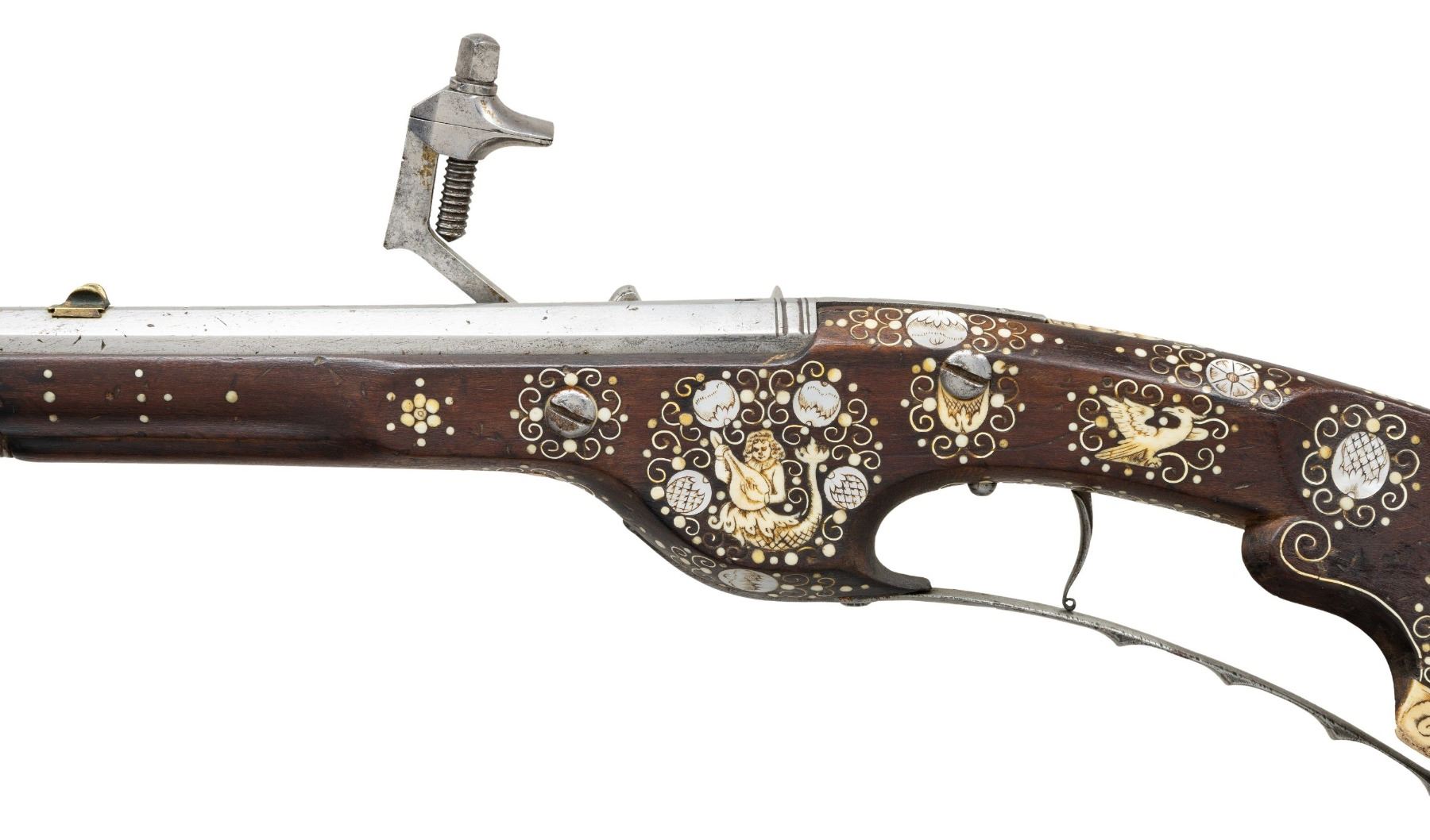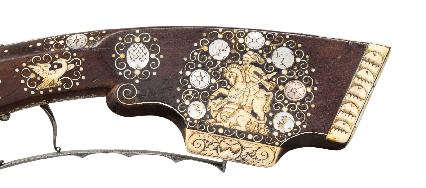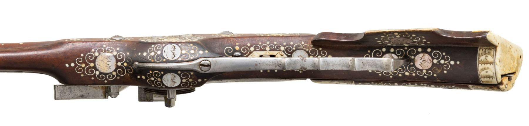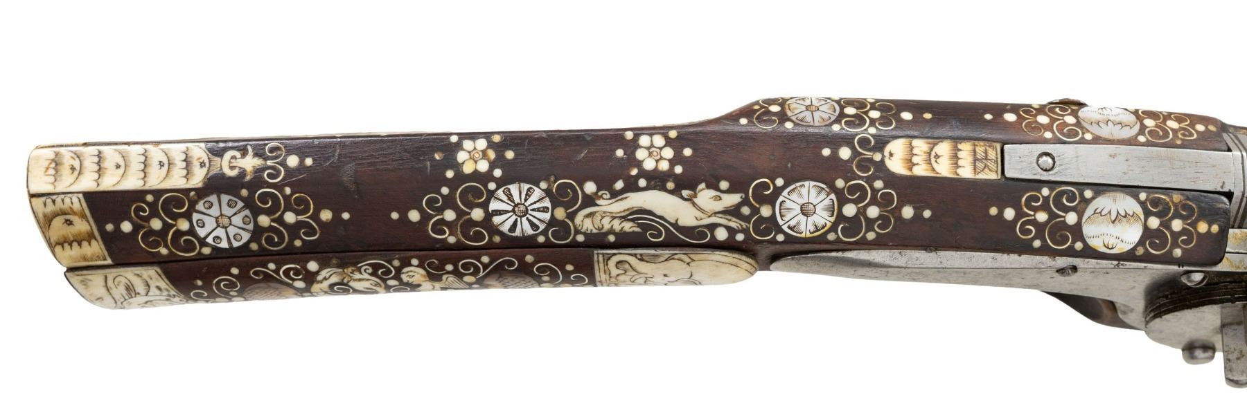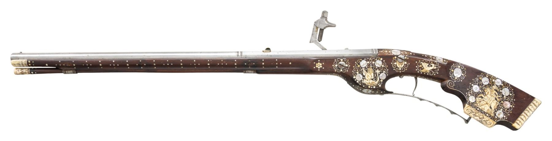 Cal. 60. S# NSN. Essentially a pistol/carbine the petronel was meant to be used while on horseback and fired with the short butt resting on one's chest. This example has 21" half round half octagon barrel with brass rear sight and poincon at breech with the initials "HS". Small size wheellock with sliding pan cover is undecorated. Newer European walnut stock extends to muzzle with scrimmed bone cap and is pinned to barrel. Down turned grip has bone buttplate and is built with small right hand cheekpiece. Stock is nicely embellished with intricate inlays of bone depicting mermaids, birds, griffins, dogs and an elephant surrounded by dots of decorated Mother of Pearl within small bone scroll background. A large inlay on face of cheekpiece depicts a knight on horseback slaying a dragon. A patchbox on right side has matching dovetailed cover. UNATTACHED ACCESSORIES: invoice for this piece dated 2013 including duty and shipping in the amount of about $24,000 Euros. CONDITION: good. Metal showing considerable cleaning to silver gray with some scattered pitting on barrel and overall pitting on lock. Stock retains nearly all of its original finish with artificial aging and staining. Inlays are beautifully done and nicely darkened. Bore is dark and pitted. It appears that lock is operable; not tested. (01-26936/MGM). ANTIQUE. $8,000-12,000.