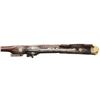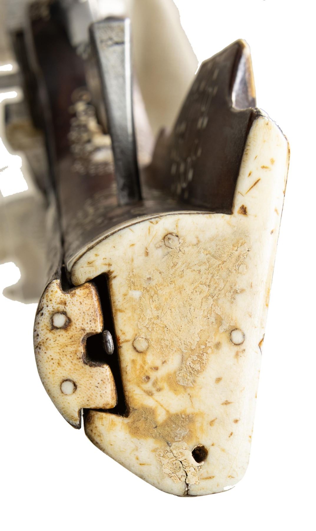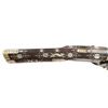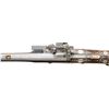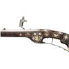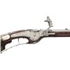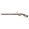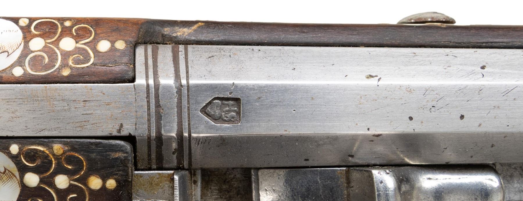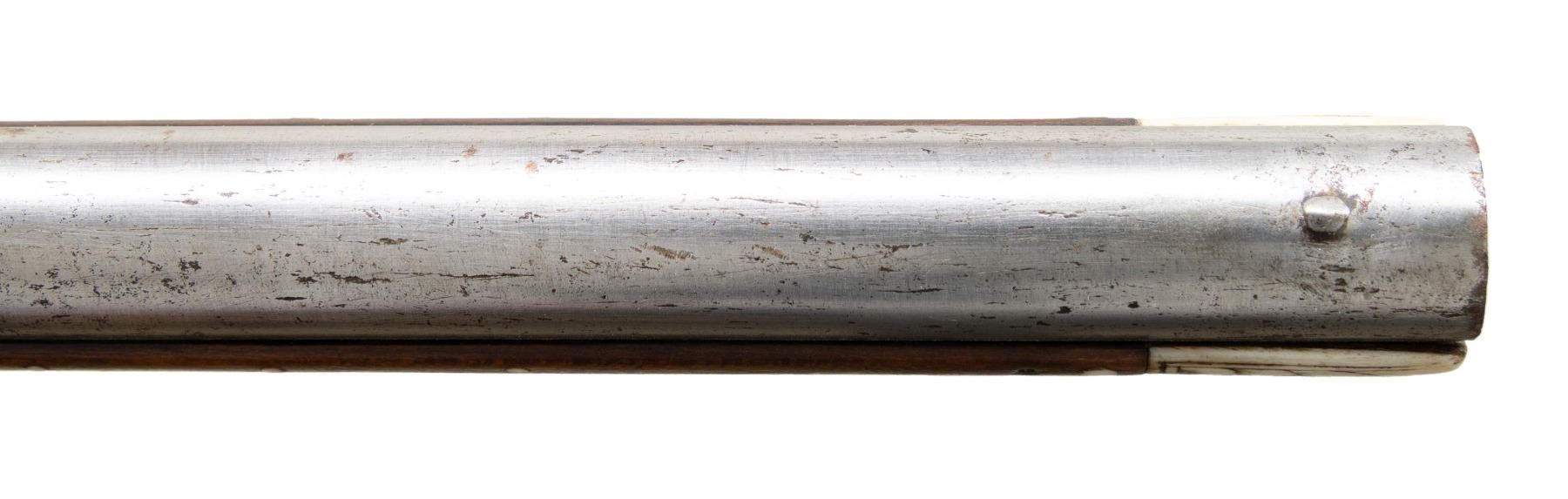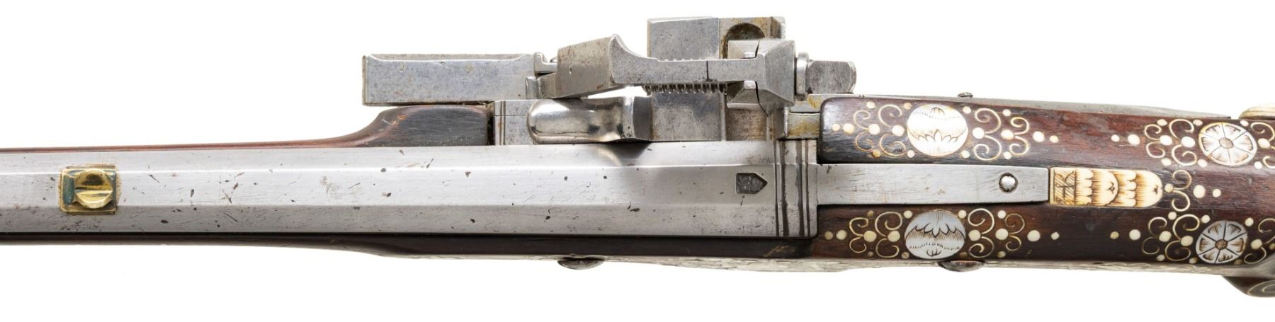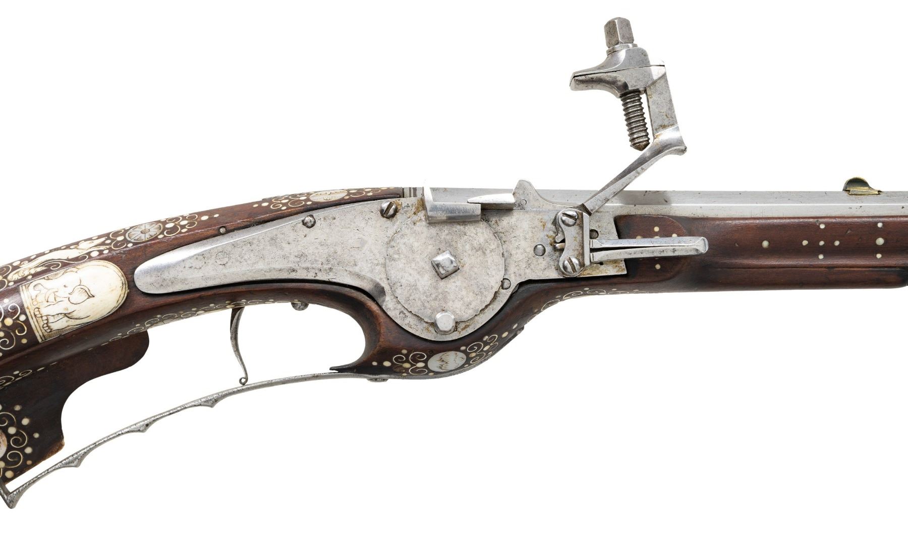 Cal. 60. S# NSN. Essentially a pistol/carbine the petronel was meant to be used while on horseback and fired with the short butt resting on one's chest. This example has 21" half round half octagon barrel with brass rear sight and poincon at breech with the initials "HS". Small size wheellock with sliding pan cover is undecorated. Newer European walnut stock extends to muzzle with scrimmed bone cap and is pinned to barrel. Down turned grip has bone buttplate and is built with small right hand cheekpiece. Stock is nicely embellished with intricate inlays of bone depicting mermaids, birds, griffins, dogs and an elephant surrounded by dots of decorated Mother of Pearl within small bone scroll background. A large inlay on face of cheekpiece depicts a knight on horseback slaying a dragon. A patchbox on right side has matching dovetailed cover. UNATTACHED ACCESSORIES: invoice for this piece dated 2013 including duty and shipping in the amount of about $24,000 Euros. CONDITION: good. Metal showing considerable cleaning to silver gray with some scattered pitting on barrel and overall pitting on lock. Stock retains nearly all of its original finish with artificial aging and staining. Inlays are beautifully done and nicely darkened. Bore is dark and pitted. It appears that lock is operable; not tested. (01-26936/MGM). ANTIQUE. $8,000-12,000.