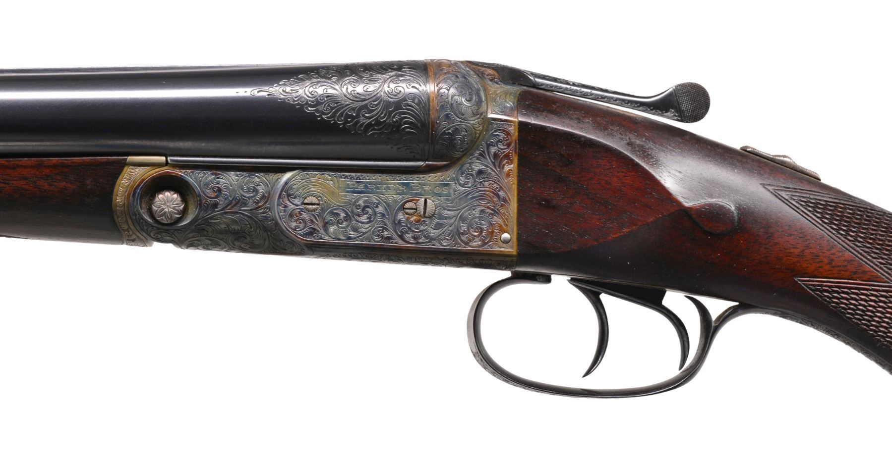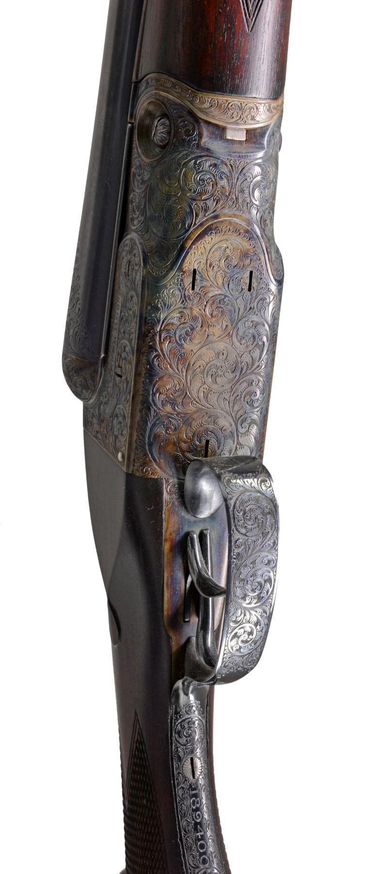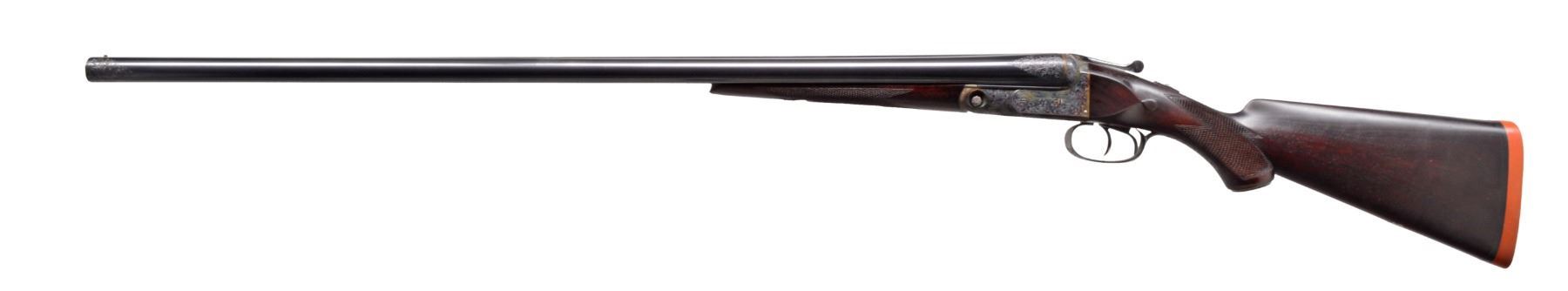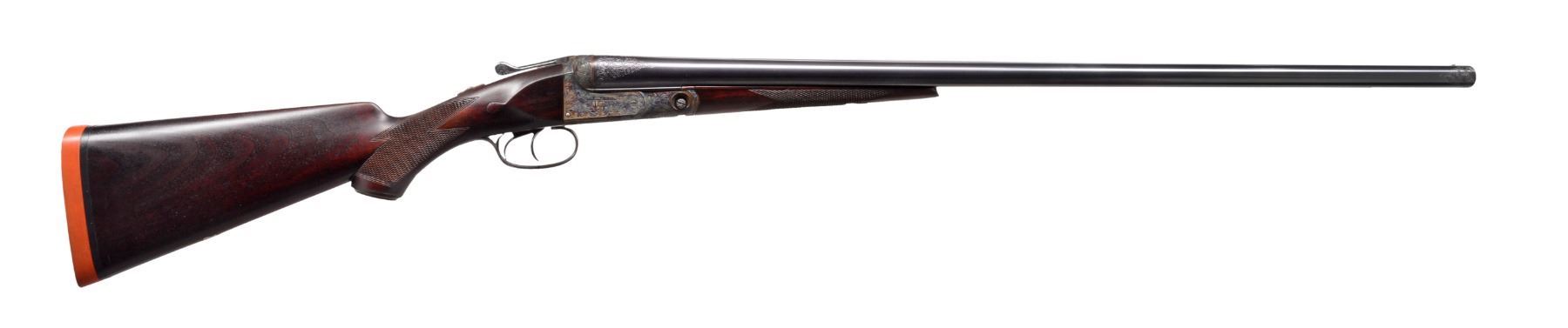 Cal.12 Ga. S# 189400. 1 1/2 Frame. Bbls. 30" "Vulcan" steel, Parker address on matted rib. There are 2" triangles of well cut open scroll at breech ends, w/ matching 1" triangles at muzzles. Casehardened action w/ automatic safety & dbl. triggers has been very finely re engraved w/ near full coverage lg. open shaded scroll, reminiscent of that found on Holland & Holland guns. This scroll extends to top lever & trigger guard, which are blued. S# is on trigger guard tang. Original American walnut buttstock appears to have side panels reshaped, giving English style drop points. Stock measures 14 1/8" over Silver type pad & features standard checkering, Parker grip cap, & German silver shield on toeline. Matching splinter forend has typical Parker release. Bore diameters: left - .737, choke .043 (extra full), right - .735, choke .041 (extra full). Wall thickness: left - .022, right - .029. DAC: 1 1/2". DAH: 2 3/8". Cast approx. 1/4" on. LOP: 14 1/8". WEIGHT: 7 lbs. 0 oz. CONDITION : very fine, as completely refurbished, retaining nearly all fine custom blue & excellent casehardening color on metal parts. Wood dark stained, checkering re cut. Bores are excellent, shiny, over 1 or 2 scattered pits. (19-5432/MGM19). CURIO. $1,200-2,000.