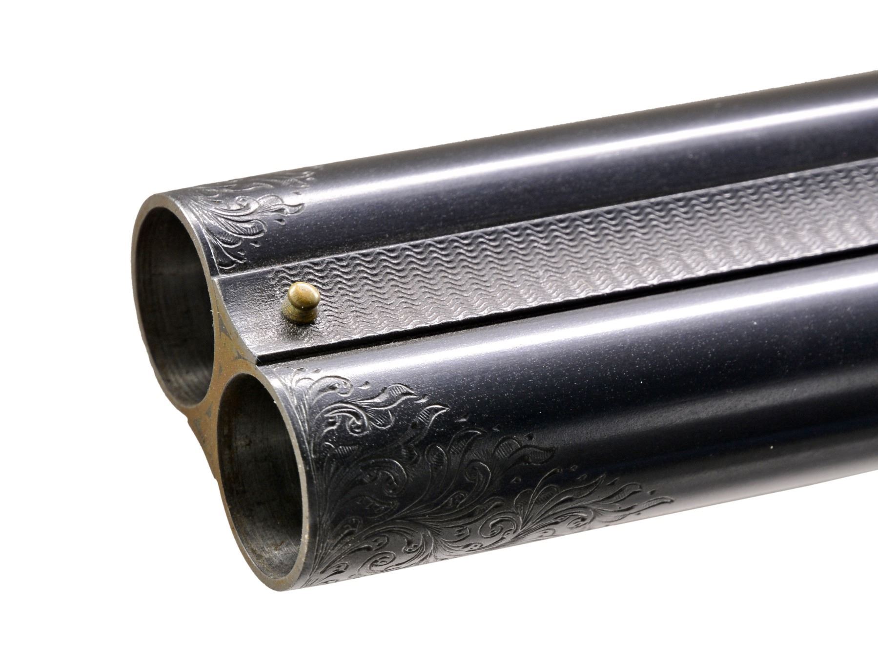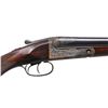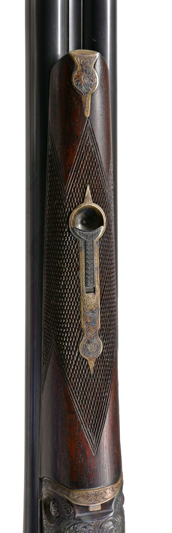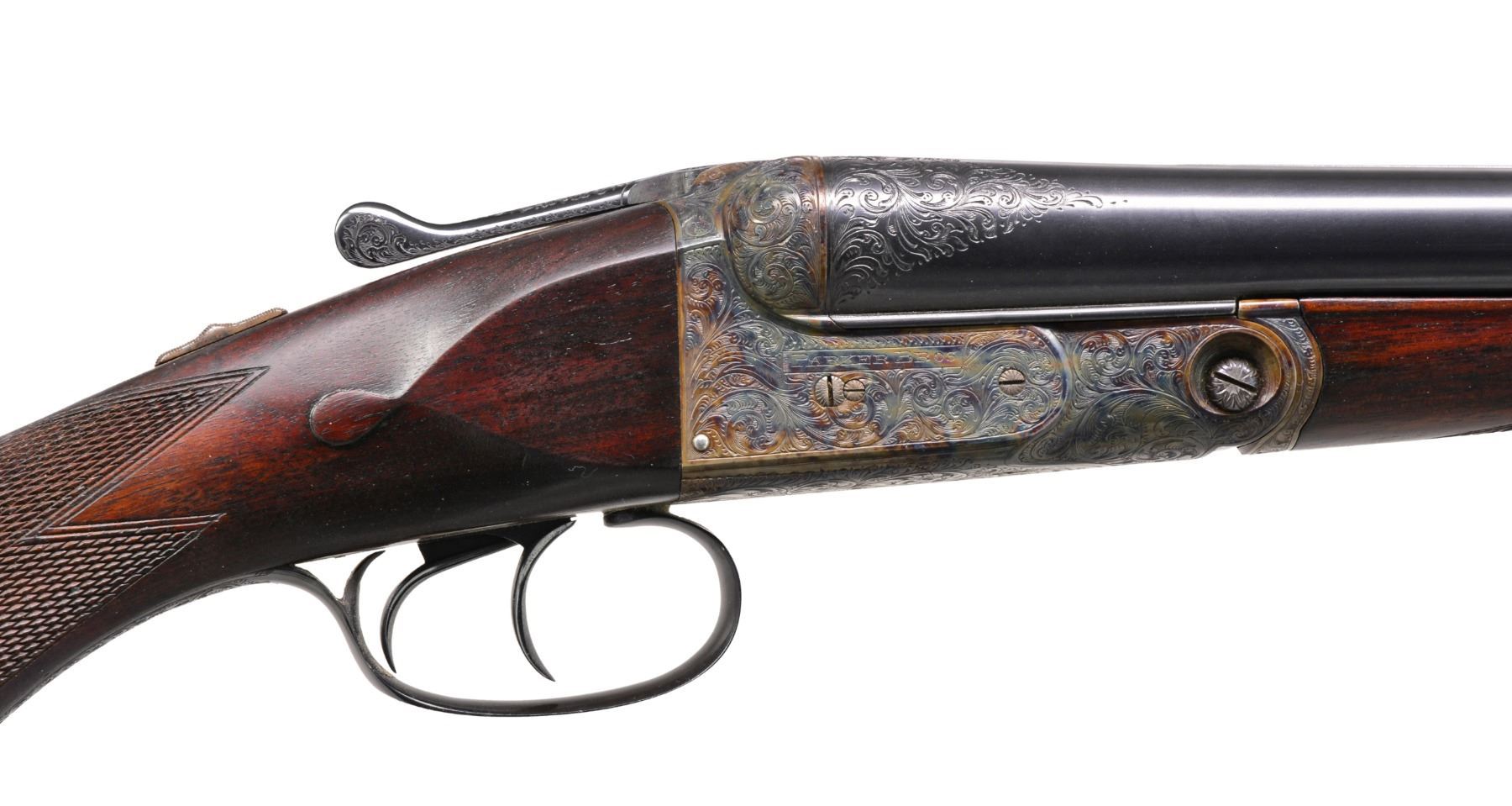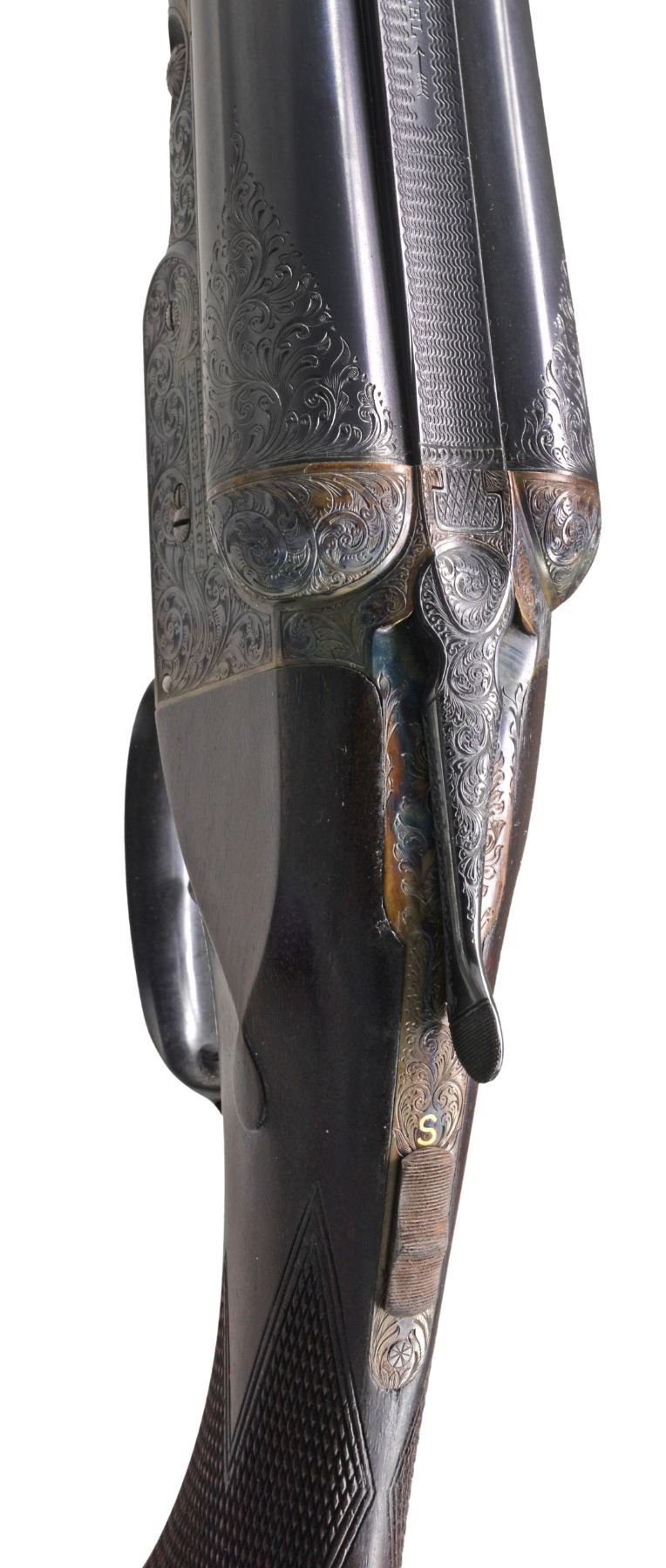 Cal.12 Ga. S# 189400. 1 1/2 Frame. Bbls. 30" "Vulcan" steel, Parker address on matted rib. There are 2" triangles of well cut open scroll at breech ends, w/ matching 1" triangles at muzzles. Casehardened action w/ automatic safety & dbl. triggers has been very finely re engraved w/ near full coverage lg. open shaded scroll, reminiscent of that found on Holland & Holland guns. This scroll extends to top lever & trigger guard, which are blued. S# is on trigger guard tang. Original American walnut buttstock appears to have side panels reshaped, giving English style drop points. Stock measures 14 1/8" over Silver type pad & features standard checkering, Parker grip cap, & German silver shield on toeline. Matching splinter forend has typical Parker release. Bore diameters: left - .737, choke .043 (extra full), right - .735, choke .041 (extra full). Wall thickness: left - .022, right - .029. DAC: 1 1/2". DAH: 2 3/8". Cast approx. 1/4" on. LOP: 14 1/8". WEIGHT: 7 lbs. 0 oz. CONDITION : very fine, as completely refurbished, retaining nearly all fine custom blue & excellent casehardening color on metal parts. Wood dark stained, checkering re cut. Bores are excellent, shiny, over 1 or 2 scattered pits. (19-5432/MGM19). CURIO. $1,200-2,000.