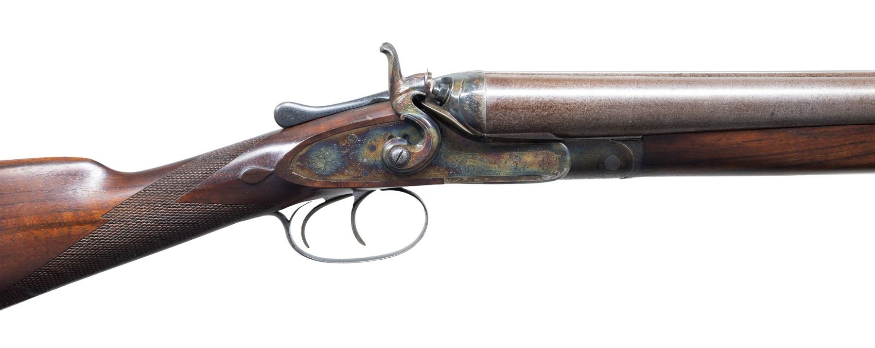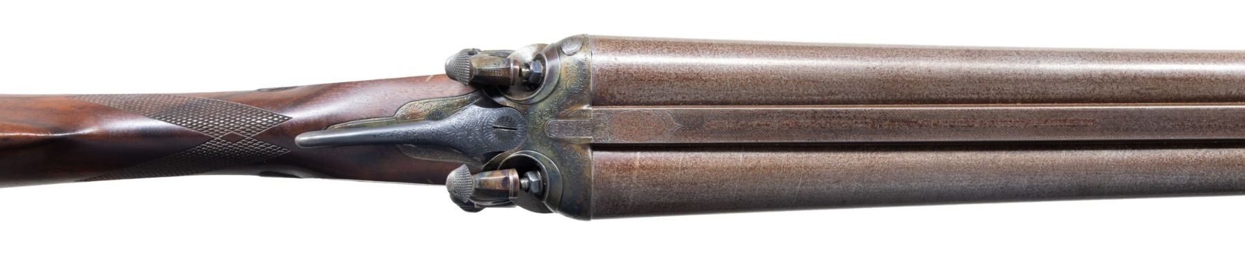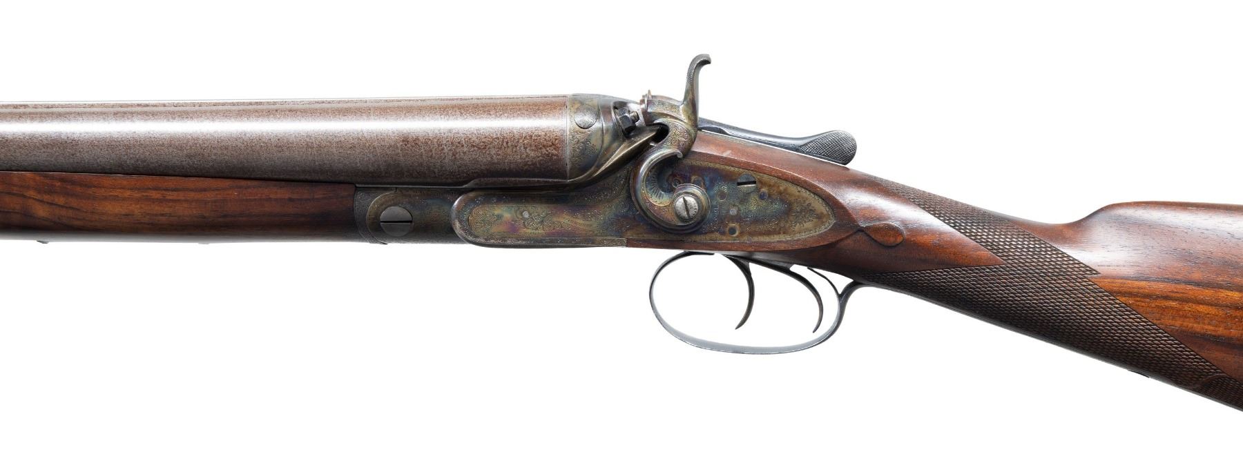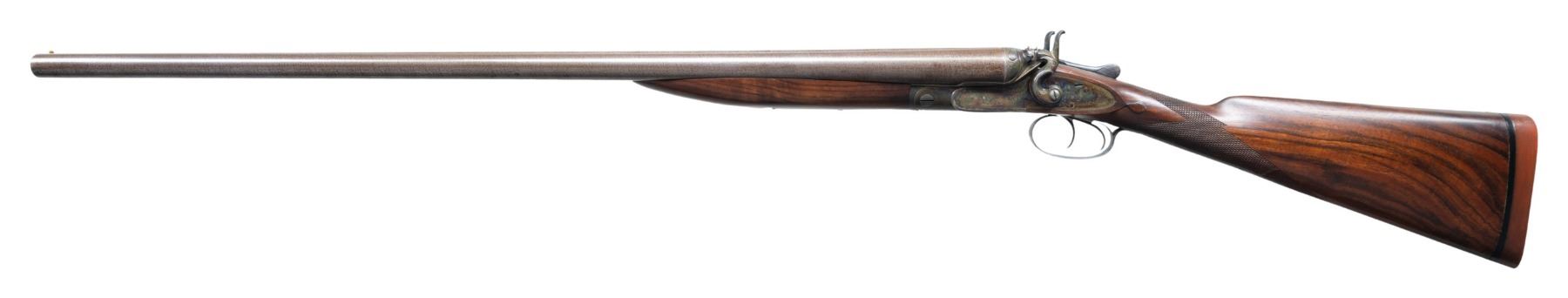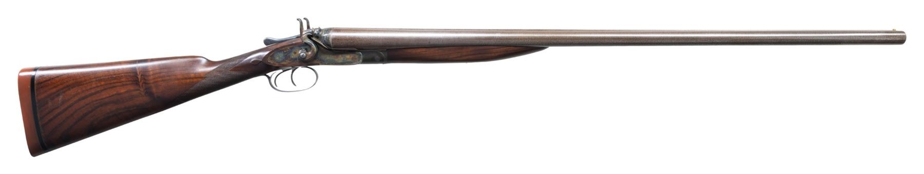 GUN. Cal. 12 Ga. 2-3/4". S# 19386 (Ca. 1878). The 30" fine damascus barrels are fitted with flat matted rib engraved "W.W. Greener 68 Haymarket London Winner of the London Gun Trials 1875 1877 & 1878" on unmatted portion of rib. Rear is engraved "Patent Treble" "No. 3081" "Wedge Fast". Barrel flats are stamped with 1977 Birmingham nitro reproofs for 2-3/4" chambers. Bottoms of barrels are stamped with pre-1890 Birmingham black powder proofs for 14M, 13B and "NOT FOR BALL". Case hardened action features crossbolt third fastener and double triggers. Front spring locks are fitted with nicely filed rebounding hammers. Action and lockplates are engraved with 80% coverage well cut small scroll. "W.W. Greener" is in banner on both lockplates. Action and hammers along with breech areas of barrels are filed in a manner similar to the Royal grade (50 Guineas); however Royal grade guns usually had hidden cross bolts. So this appears to be a 45 Guinea gun. Trigger guard, engraved with scroll on bow has S# on tang. High quality replacement straight grip buttstock of lightly figured and nicely veined European walnut measures 14-1/2" over Silver type pad and features well cut borderless flat top checkering at grip with ribbon toward toeline dividing an area of checkering that is more closely spaced. Stock is also made with semi-diamond hand and well shaped drop points. Matching full splinter forend is uncheckered and has Deeley release. MEASUREMENTS: BBLS: Bore Diameter: L .729. R .732. Restriction: L .026 (IMod). R .035 (Full). Wall thickness: L .032. R .023. STOCK: DAH: 2-3/16". DAC: 1-1/2"+. CAST: about 1/2" off. LOP: 14-1/2". WEIGHT: 8 lb. 9 oz. CONDITION: fine as completely refurbished. Barrels retaining nearly all of a good re-brown with fine definition to damascus pattern. Action retains nearly all of a best re-color hardening; engraving remaining clear. Newly made high quality stocks have a few minor handling marks in their original oil finish. Bores are bright and shiny without noted problems. Action is very tight with new hinge pin and crossbolt bushing. Locks are crisp. Mid bead is missing on barrel. A great old gun ready for another 100 years. (01-27279MGM). ANTIQUE. $2,250-3,500.