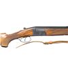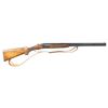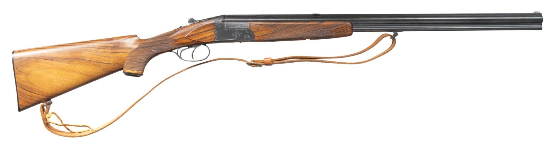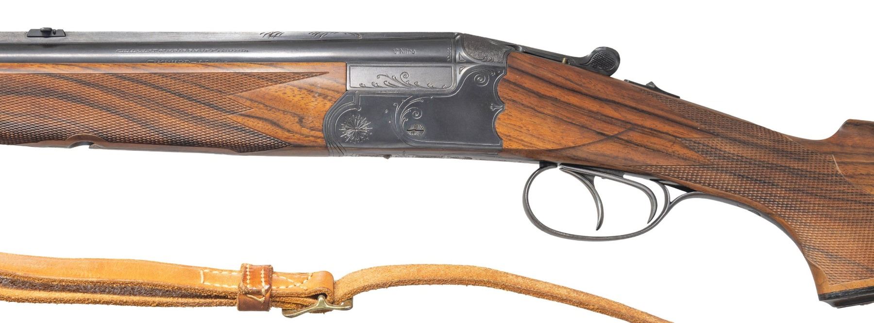 SEMPERT & KREIGOFF. Cal. 20 Ga. 2-5/8"/6.5x52 (25-35 Winchester) S# 13911. The 25-5/8" demi-bloc barrels are fitted with full length matted rib with dolls head extension holding flip-up rear and silver bead front sights. Left side of top barrel is engraved "SEMPERT & KREIGOFF, SUHL." Bottoms of barrels are stamped with November 1929 German nitro proofs for 20 gauge and 6.5x52 (25-35 Winchester drops into chamber). Blue, scallop backed, blitz, O/U action features safety on top tang along with pin cocking indicators and double triggers (front set). Action is engraved with line borders and sprays of scroll. Trigger guard is steel. Newly made capped pistol grip buttstock of nicely marbled European walnut measures 14-1/2" over checkered horn buttplate and features right hand cheekpiece, point pattern checkering and sling loop on toeline matching loop on bottom barrel. Matching one piece slim forend has Deeley release. Rifle is fitted with leather sling. MEASUREMENTS: BBLS: Bore Diameter: O .629. Restriction: O .011 (light mod). Wall thickness: O .020. STOCK: DAH: 2-3/4". DAC: 1-5/8". CAST: about 1/2" off. LOP: 14-1/2". WEIGHT: 5 lb. 10 oz. CONDITION: very fine as restored. Metal parts retaining nearly all of a professional re-black. Very finely made stocks retain all of their original oil finish with a few handling and assembly marks, most noticable a 1-1/4" shallow dent on left side of forend in front of action. Bores are fine. There are plugged scope mounting holes in top rib. Mechanically good except action has a hint of looseness. Trigger will set. PROVENANCE: Estate of Lloyd Robinson. (25-6667/MGM). CURIO. $2,500-3,500.