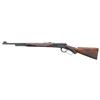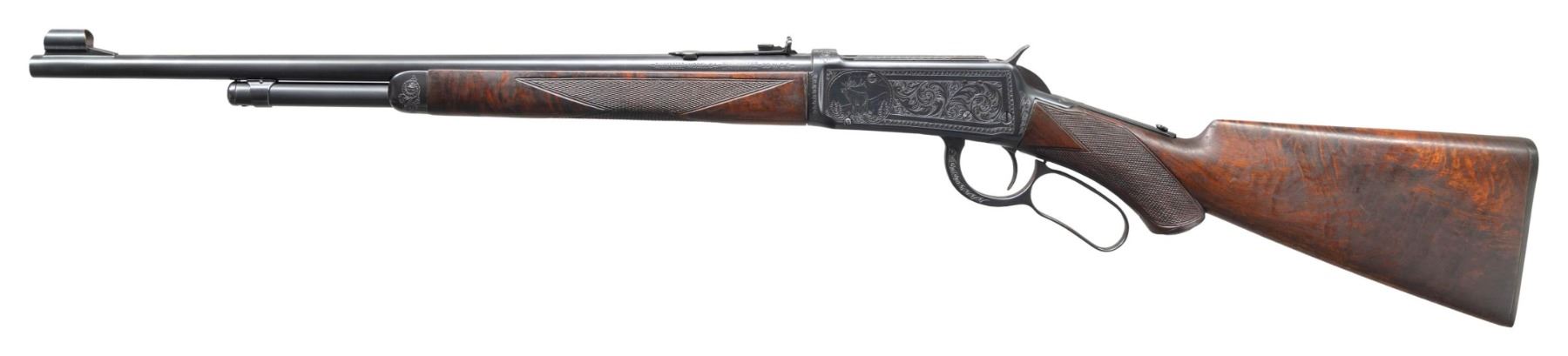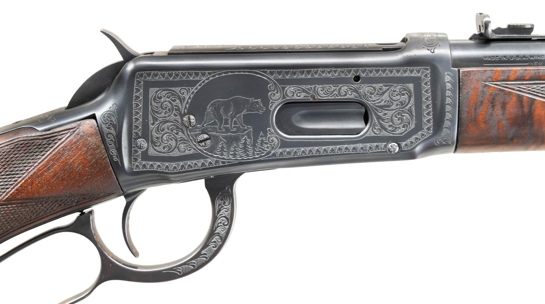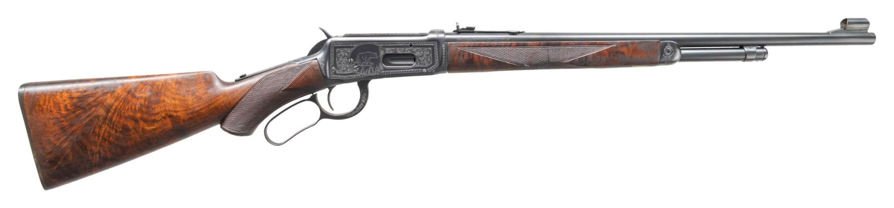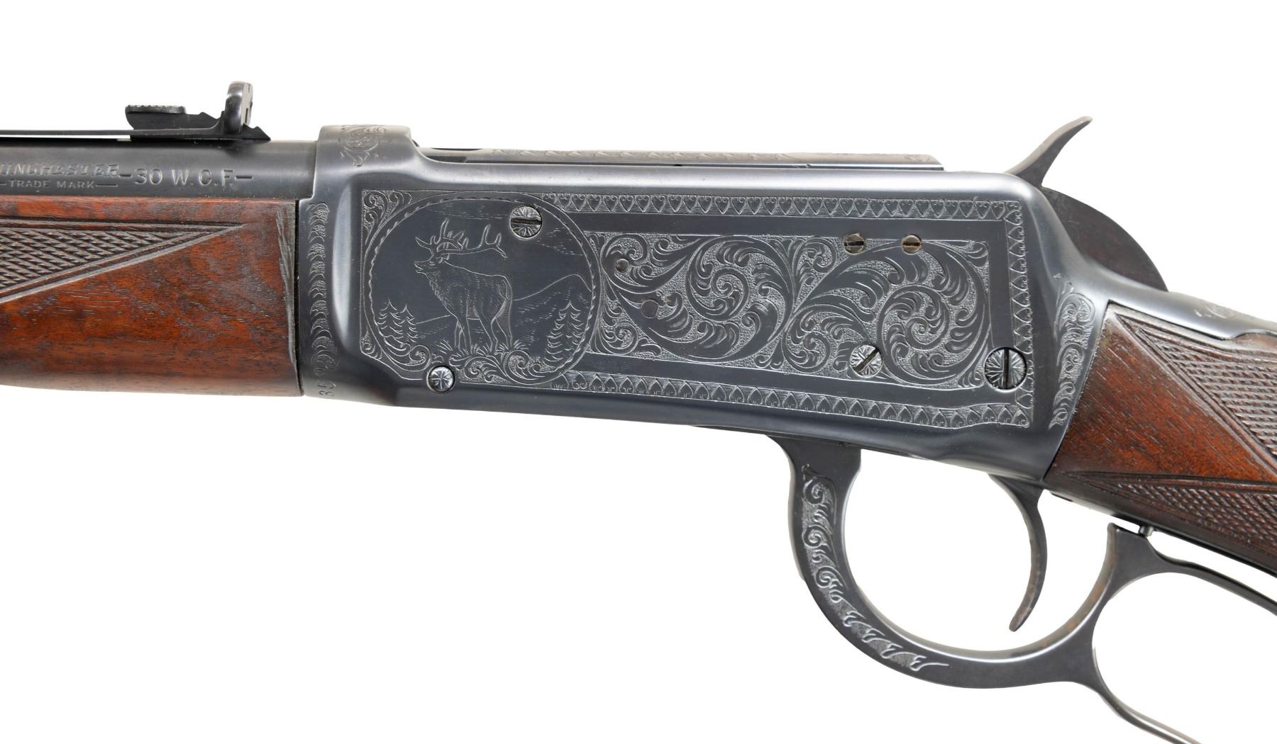 LEVER ACTION RIFLE. Cal. 30 WCF. S# 1147835. Bbl. 20". Model 64 lever action rifle mfg. by Winchester in 1938. Left side of the bbl. is marked with the model and cal. designations, with Winchester's mfg. information marked on the right. Upper receiver tang is marked with the Winchester trademark logo above "-TRADE MARK-/ MADE IN U.S.A." markings, which have been partially enhanced via hand engraving of some of the letters. Sides of receiver feature custom engraving by Nick Kusmit consisting of heart shaped borders and panels of scrollwork at the center on punch dot backgrounds. Left side of the receiver is engraved with a vignette scene of an elk (signed "NK" at bottom right of portrait), with a vignette scene of a bear engraved on the right. Complimentary scrollwork extends to the top of the receiver, top of the bolt, sides of the lever, as well as on the upper receiver tang. Sides of forearm nose cap feature engraved floral motifs around the screw slots, with light scrollwork on finely stippled backgrounds. Metal components exhibit a reapplied blue finish overall. High grade wood forearm and brown hard rubber capped pistol grip buttstock with checkered brown hard rubber Winchester buttplate. Wood furniture has been sanded and refinished at one time, with the checkering either having been significantly enhanced or added. Left side of lower receiver tang is marked with assembly # "5007", followed by wood grade marking "XXX" and "RB". Assembly # "5007" is present in the top tang channel of the stock. Ramped, hooded, and brass beaded blade front sight with dovetailed U-notch rear sight. CONDITION: metal components retain virtually all of their reapplied blue finish overall, exhibiting some scattered spots of light surface oxidation. Interior of lever loop shows some light to mild wear that is fading to brown patina. Near mirror bore, exhibiting what appears to be a few areas of very light pitting, while retaining well defined rifling throughout. Proper manual mechanics. Wood furniture shows some superficial marks and impressions from handling and storage, with scattered mildew spots. Left side of buttstock exhibits a large area of apparent finish loss, with the buttstock fit being notably poor at the upper receiver tang. (25-1347/MLW). CURIO. $1,000-1,500.