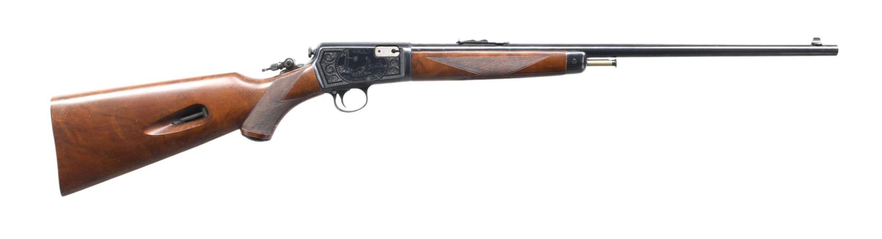 LOADING CARBINE. Cal. 22 LR. S# 4262. Bbl. early 20" round. Marbles no. 3 bead front sight w/ original sporting rear sight & tang sight. Custom aftermarket hand engraving by former Winchester master engraver Nick Kusmit. Right side vignette features 2 rabbits. Left side features 2 squirrels. Scenes are surrounded by arabesque scroll & fancy borders that continue to upper & lower receiver areas. Trigger guard bow is engraved "DUCK". Bottom of right side vignette has an engraver's signature "NK". Custom forearm & hard rubber capped pistol grip stock of fancy walnut w/ hand checkering. Tubular mag. inserts through steel buttplate & loads through right side. CONDITION: metal retains 98% custom blue. Wood finish shows cracking & crazing. Very good bore. PROVENANCE: The estate collection of Don "Duck" Combs. (24-2434/DS). CURIO. $2,500-4,000.