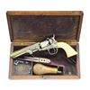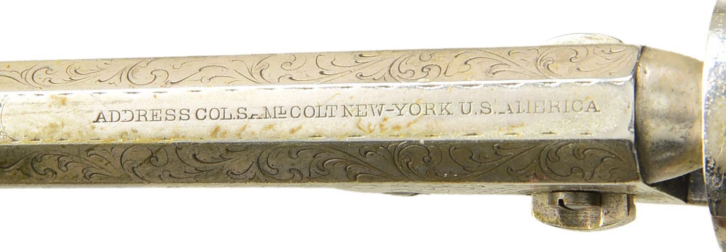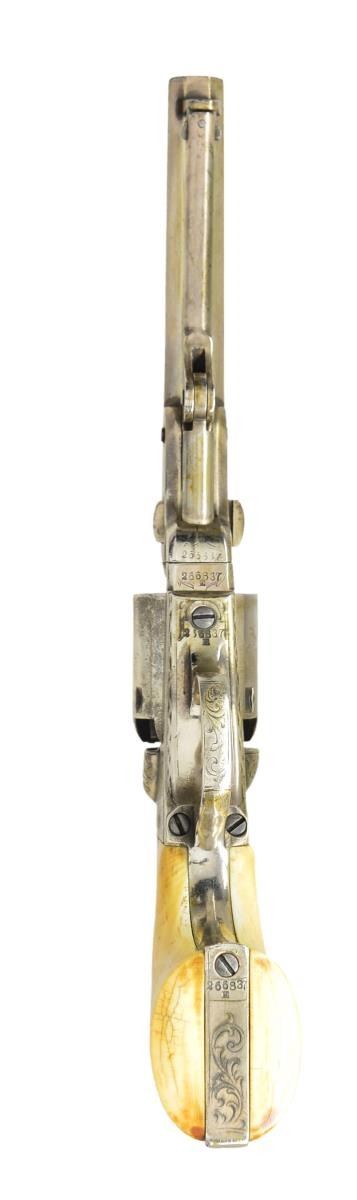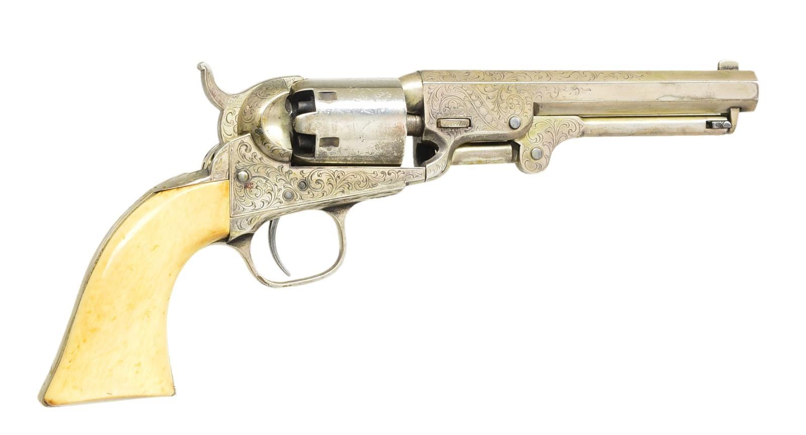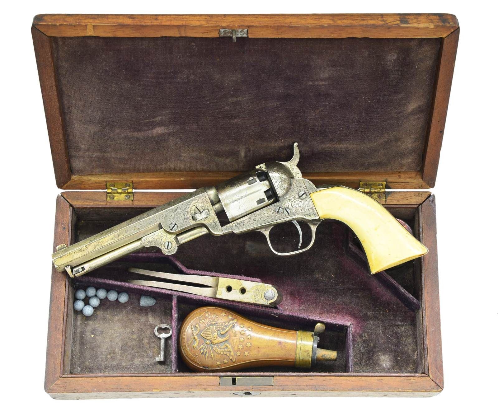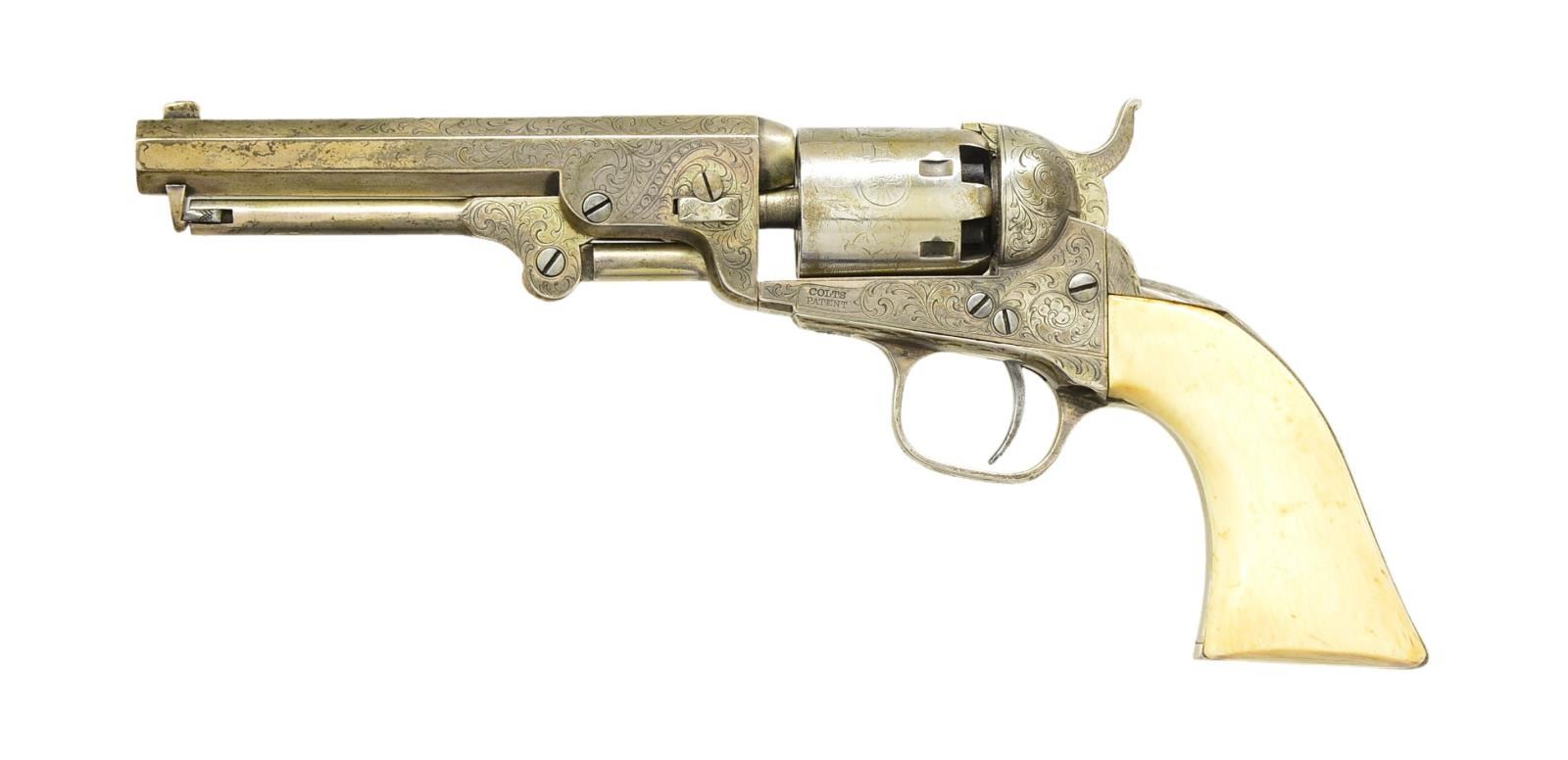 REVOLVER WITH CASE. Cal. 31. S# 266837. Bbl. 5", has Colt US America address on top. "Colt's Patent" is on right side of frame. Cal marking is on rear of trigger guard. Bbl., frame & grip straps are factory engraved in late vine style & revolver is fitted w/ 1 piece ivory grips. All numbers match including loading lever & bbl. wedge. UNATTACHED ACCESSORIES: housed in walnut case lined in purple velvet & contains sm. 4 1/2" copper bodied eagle flask, "Colt's Patent" marked brass bullet mold, Eley cap tin & a key. CONDITION: all metal parts w/ nickel replate have engraving softened. Scene on cyl. considerably softened. Ivory grips don't fit well; under metal at top & above at bottom have mellow aged appearance. Fair to good bore. Mechanically good. Safety pins mashed. Case retains most of what appears to be it's original varnish w/ scattered marks & soiling. Interior cloth faded to grayish purple. Partitions are good. Flask w/ toned body, mold w/ flaked plating. PROVENANCE: The Estate Collection of Gary Parietti. (01-19800/MGM). ANTIQUE. $2,000-3,000.