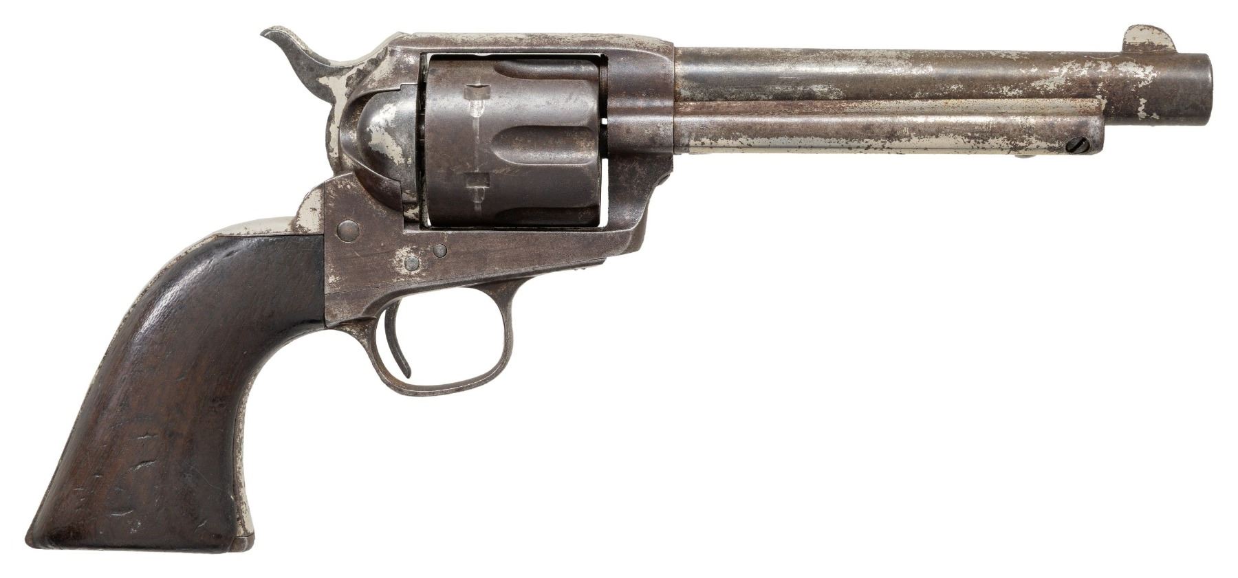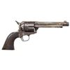 COLT SINGLE ACTION ARMY REVOLVER. Cal. 45 LC. S# 113251. Bbl. 5 3/4". Single Action Army revolver mfg. by Colt in 1884. Top of the bbl. is marked with Colt's single line address. Left side of the frame is marked with Colt's 3-line patent information, with "45 CAL" marked on the left side of the forward trigger guard web. Cyl. is unnumbered, exhibiting a U.S. "D.F.C." (David F. Clark) inspector proof. Metal components exhibit a nickel plated finish. Frame is mounted with a 1-piece plain wood grip. Standard SAA pattern blade front sight and frame notched rear sight. Matching numbers are present on the frame, trigger guard, and rear grip strap. Trigger guard and rear grip strap S# is stamped above a "G" proof. CONDITION: metal components retain fair amounts of their original factory nickel plated finish, exhibiting flaking overall that shows through to a dark patina and consistent light to mild pitting overall. Bore is relatively bright, exhibiting scattered spots and patches of light to moderate pitting, while retaining strong rifling throughout. Proper manual mechanics with tight lock up. Grip shows heavy wear, as well as scattered superficial marks and impressions, but otherwise remains sound. (01-28194/MLW). ANTIQUE. $1,200-1,800.