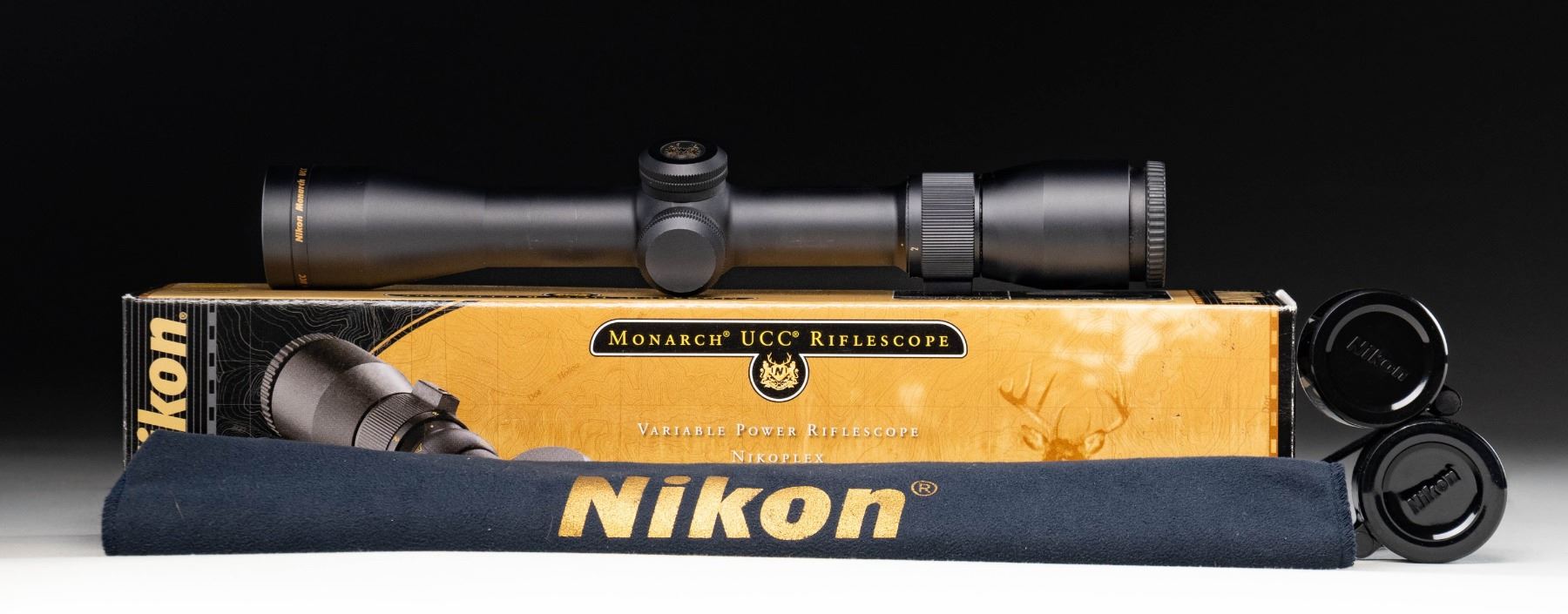 WITH FACTORY BOX. Monarch UCC 2-7x32mm (Item #: 6515) rifle scope mfg. by Nikon. Scope exhibits standard factory markings with a matte black finish. Complete with lens covers. UNATTACHED ACCESSORIES: factory box containing factory paperwork. CONDITION: excellent, with some light exterior wear on the tube from previous installation. Scope retains a clear and sharp optic. Box shows some light exterior wear, but otherwise remains sound. (02-25962/MLW). NON-GUN. $50-100.