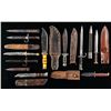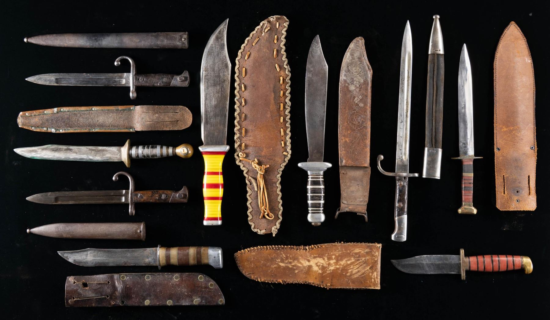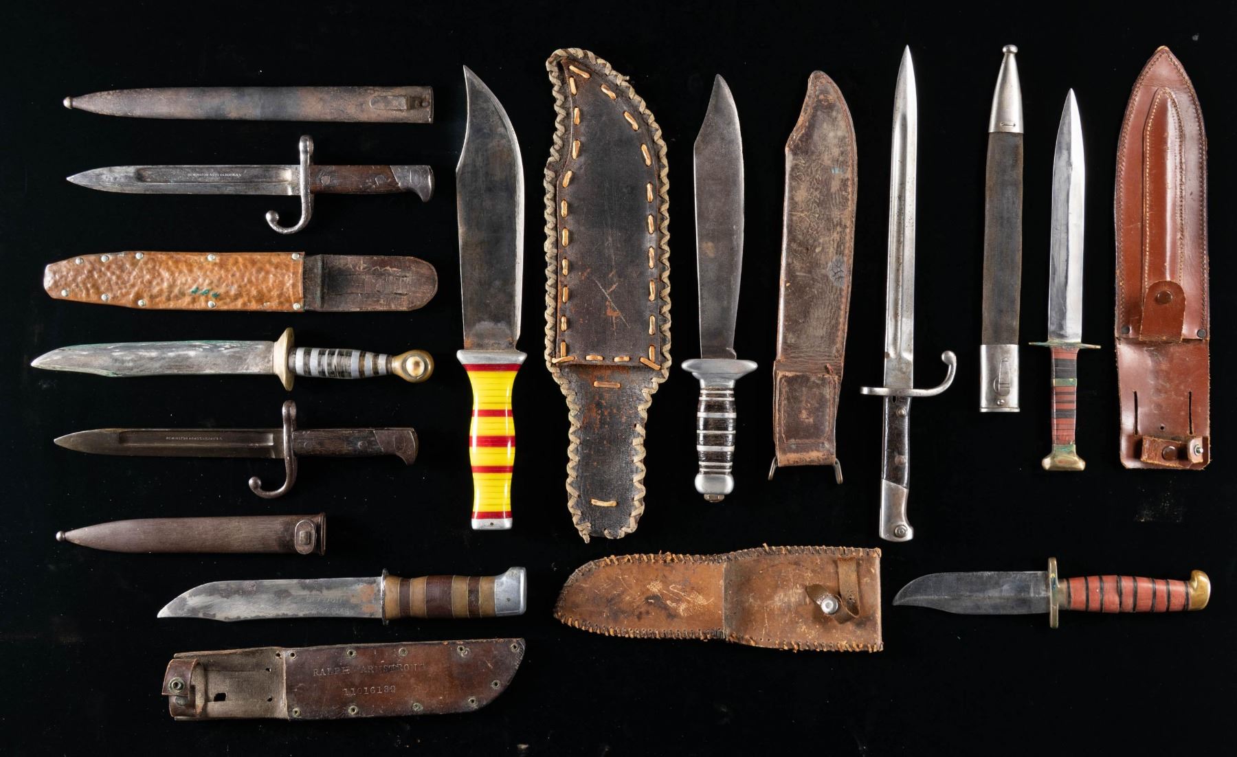1) WW2 theater made, stacked red & yellow plastic spacer grip, aluminum bolsters, big 10" clip point blade, buck stitched leather sheath. 2) WW2 theater made, stacked composite brown & black squared washers, cast brass cross guard & pommel, 8.75" dagger point blade, leather sheath with unique 7.5" steel spike that screws into pommel. 3) WW2 theater made, stacked brown & black brass shimmed washer grip, 5.25 heavy wide clip point blade, leather sheath, rawhide sewn edges. 4) WW2 theater made, stacked leather & aluminum washers, aluminum cross guard & pommel, 9.75" clip point blade, tooled leather sheath with web belt hook. 5) WW2 theater made, stacked composite brass shimmed washers, steel cross guard, aluminum pommel, 8" clip point blade, brown leather sheath, "RALPH ARMSTRONG / 11016139" etched on blade and stamped of sheath. 6) WW2 theater made, stacked aluminum & clear plastic washer grip, cast brass pommel & cross guard, 8.5" clip point blade, leather sheath with textured sheet copper cover riveted in place. 7-9) 3 different bayonets with sheaths; 2 are marked Remington Arms. CONDITION: good to very good overall, few washers in grips loose, one bayonet has incorrect misfit scabbard. PROVENANCE: Estate Collection of Compton LaBauve Jr. (02-26470/JS). NON-GUN. $1,000-1,500.