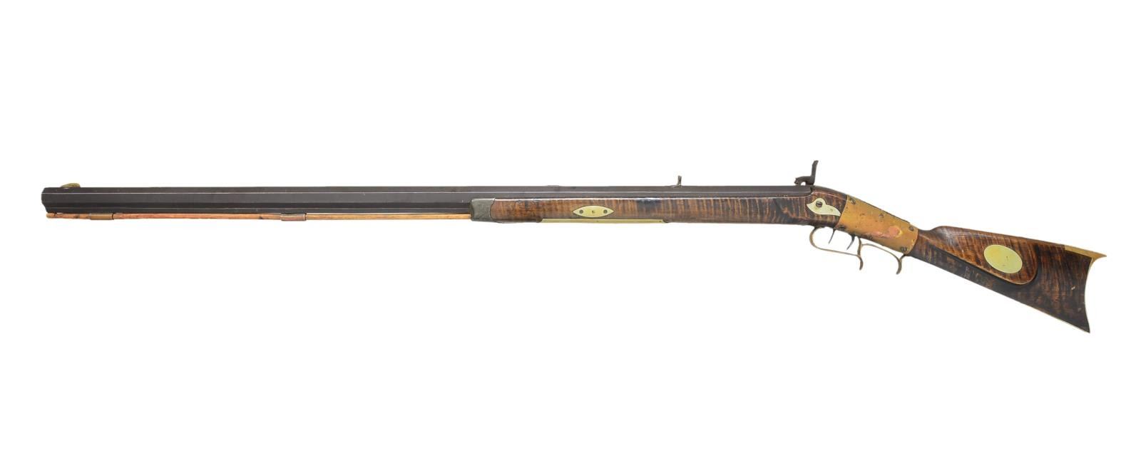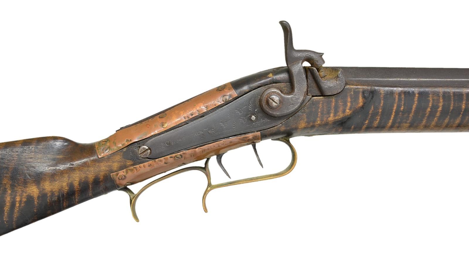 Cal. 45. NSN. Bbl. 36 3/4" oct. measuring 1" across the flats. Top flat engraved "N. N. RALPH". American Gunsmiths by Frank Sellers offers the following listing "RALPH, NEAL N., Addison, Ohio, 1859d-1868d, Gallipolis, Ohio, 1871d-1890d. Percussion fullstock". German silver blade front sight , fixed V notch rear sight & filler in forward dovetail. Back action engraved trade lock marked "JOSH GOLCHER". Dbl. set triggers. Pin fastened half length curly maple cheekpiece stock w/ pewter nose cap. Right side of stock has a German silver patchbox w/ circular iron lid. Cheekpiece on left side of stock has 2" German silver oval. Other German silver fittings include crescent buttplate, toe plate, finger curl trigger guard, forearm plate, key escutcheons & sideplate escutcheons. Replacement hardwood ramrod held on iron under rib by 2 brass pipes. CONDITION: metal has a heavy dark patina appearance w/ pitting becoming heaviest in breech area. Stock shows added finish over wear & handling marks. Wrist is broken w/ screw attached brass plates making the repair. Hammer will not hold in cocked position unless triggers are set. Dark bore w/ general pitting retains deep intact rifling. (01-19832/DS). ANTIQUE. $300-500.