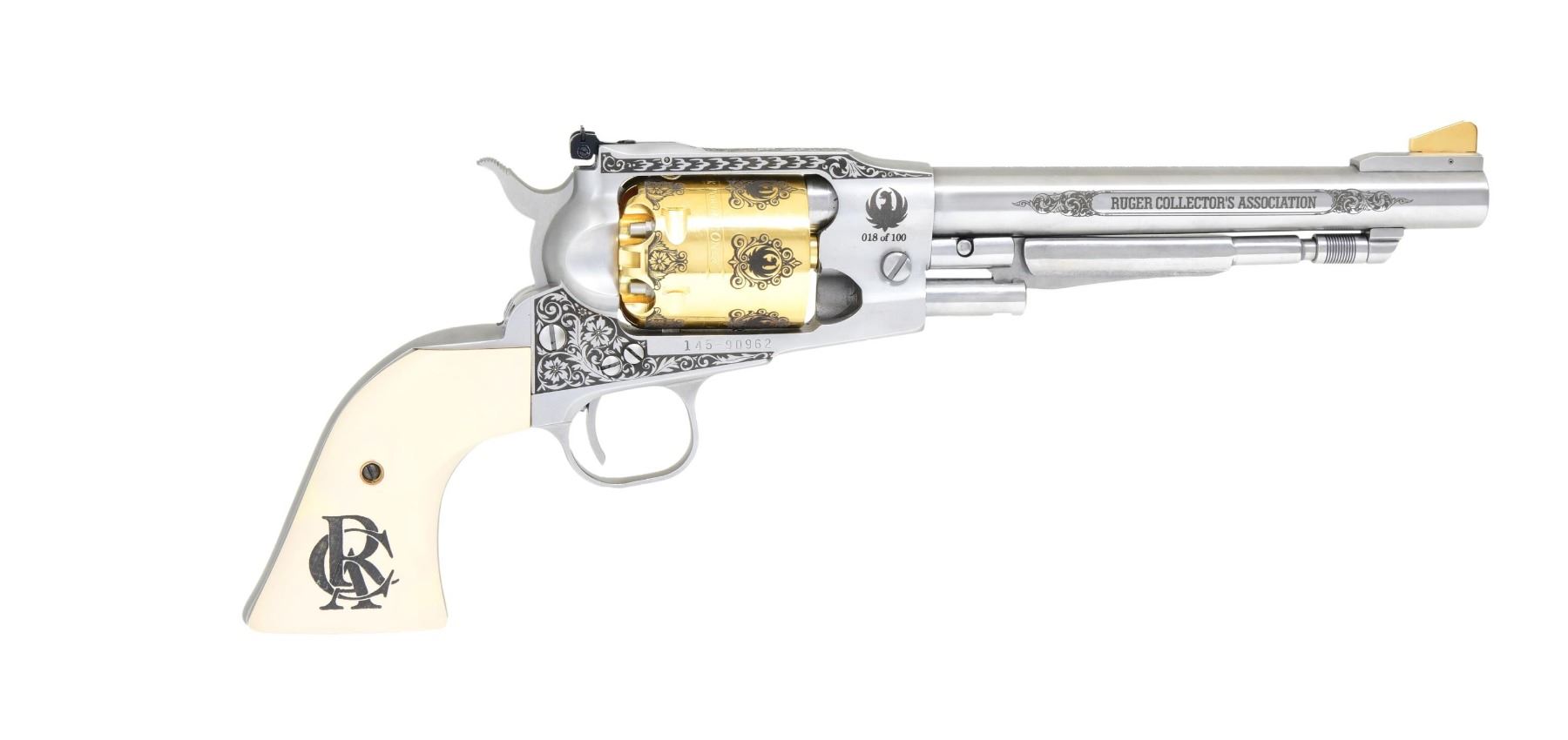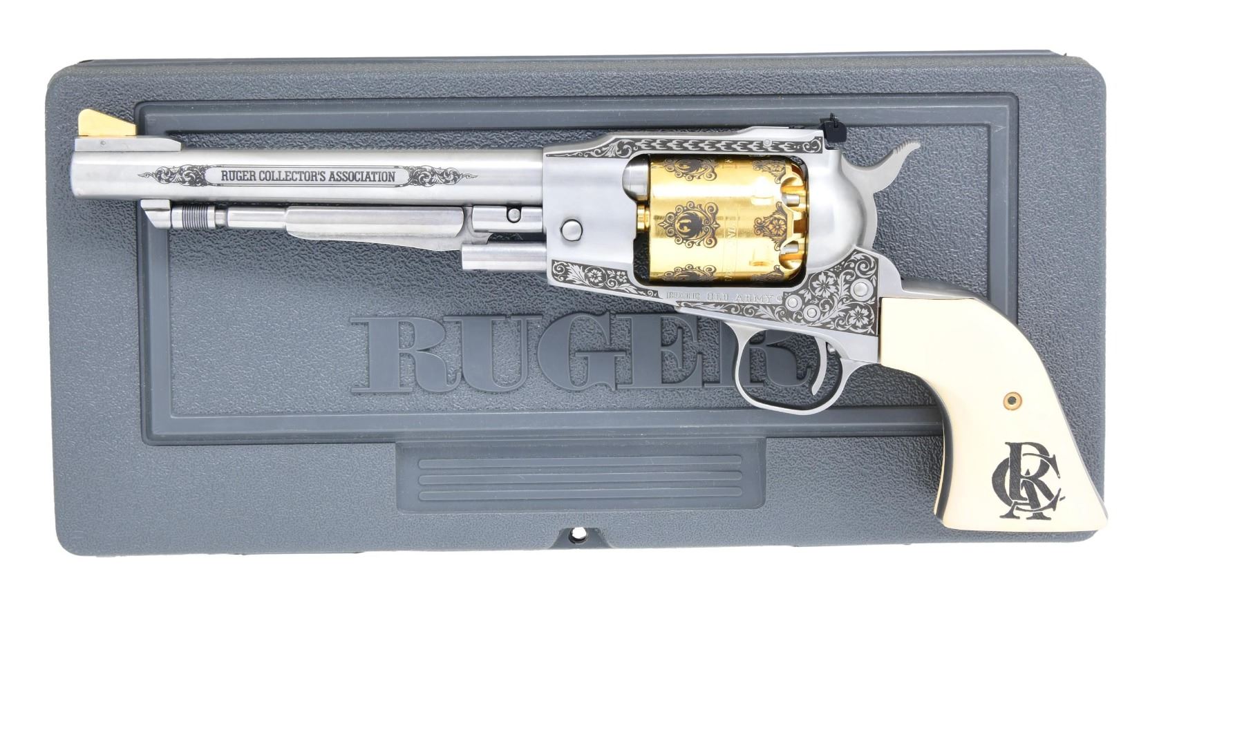 ASSOCIATION MODEL 01404 SA WITH REVOLVER MATCHING FACTORY BOX. CAL. 45. S# 145-90962. Catalog No. KBP-7 This revolver features a stainless steel finish with gold trim and decorative scrollwork on the cylinder. The barrel measures 7.5 inches, with a fixed front sight and an adjustable rear sight. The trigger is a standard single action with a hammer. The frame is a classic Ruger design with a non-fluted cylinder holding six rounds. The grips are smooth ivory polymer with the Ruger Collector's Association logo. UNATTACHED ACCESSORIES: Factory box. CONDITION: The revolver is in near excellent overall condition with approximately 98% of the original finish remaining on the barrel and frame. The grips are in near excellent condition. The bore is bright and sharp. (01-90962/MD). ANTIQUE $800-$1200