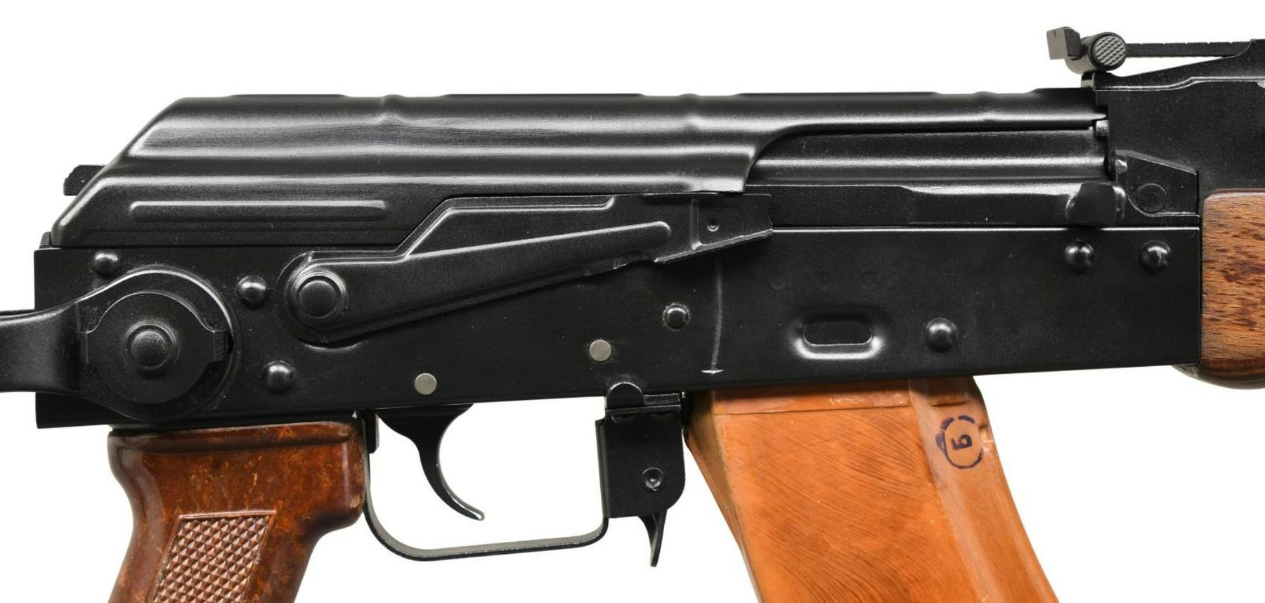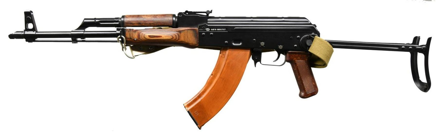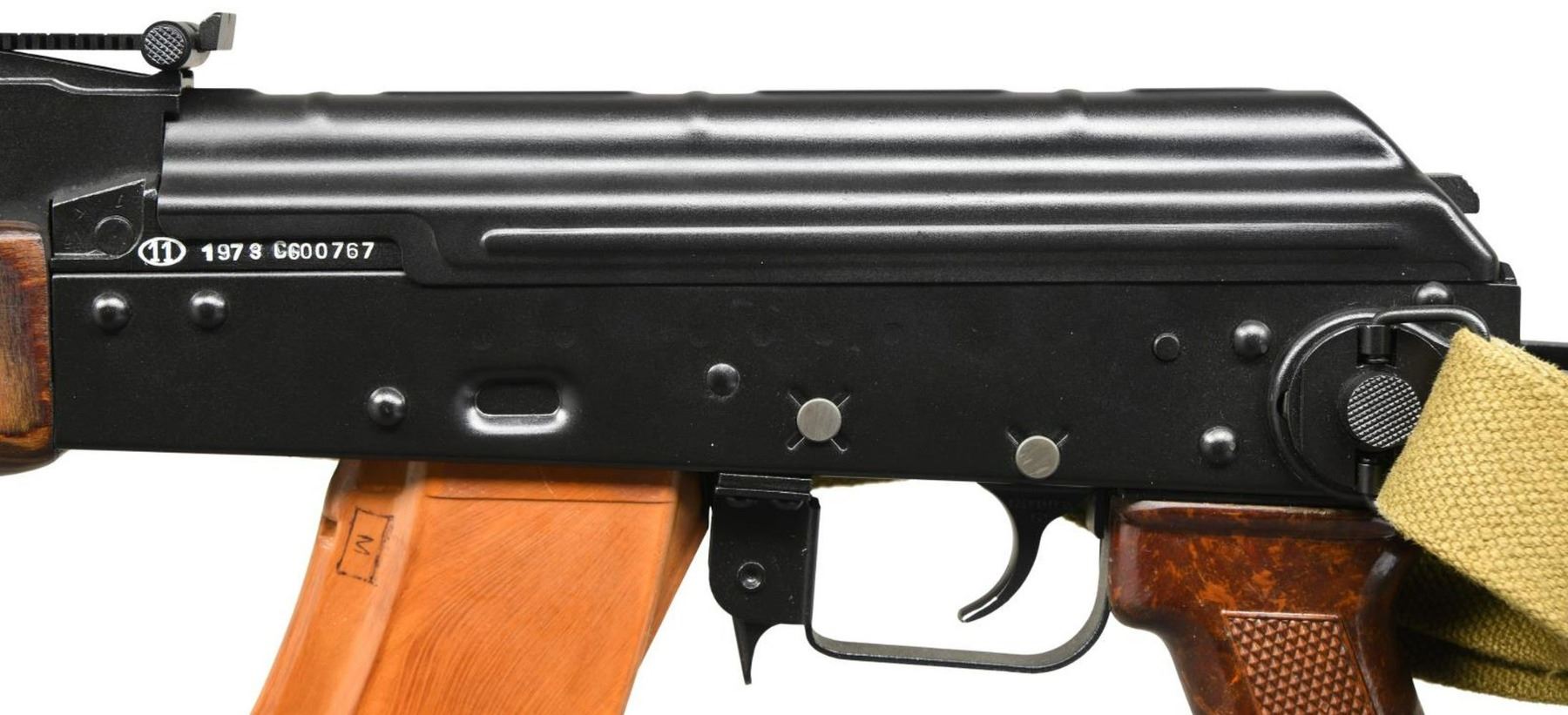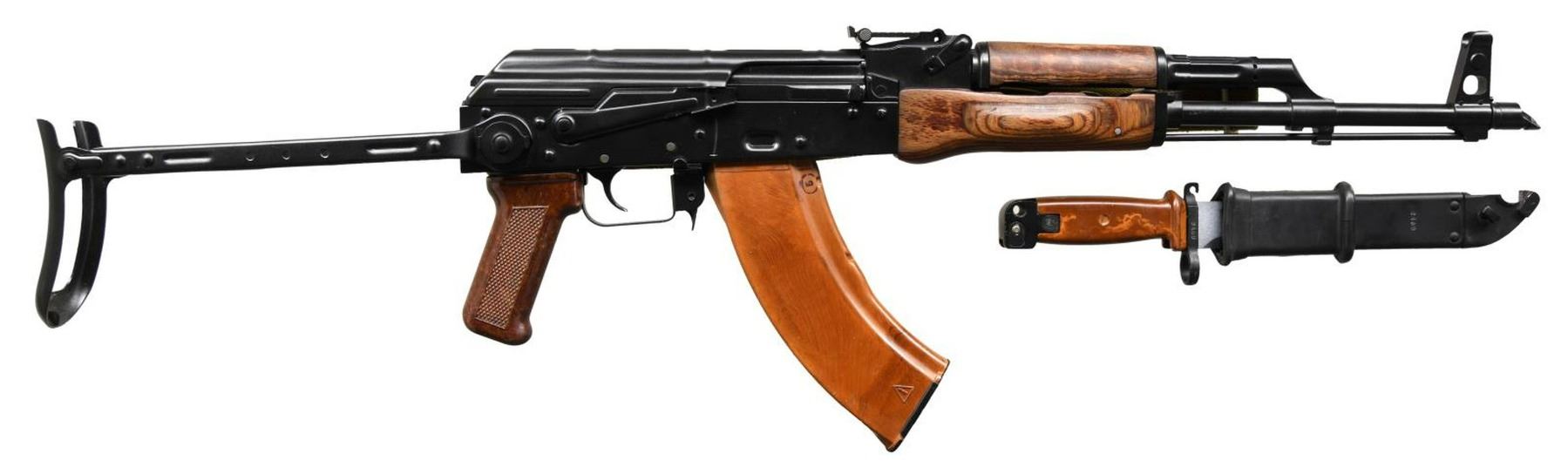 Cal. 7.62x39mm. S# G002067. Bbl 16 1/4". NDS-1P semi-automatic rifle manufactured by Nodak Spud. Underside of receiver bears markings stipulating the model and caliber designations, as well as the manufacturer information and serial number. Left side of trunnion exhibits a Polish "11" within a circle followed by "1973" as well as a former serial number. Blued finish, with under-folding buttstock, checkered red bakelite grip, as well as a laminated wood upper and lower handguard. Standard AK pattern sights with AKM pattern slant brake. Original ComBloc canvas web sling and non-serrated bayonet with matching scabbard. MAGS: 1 Izhmash marked 30 rnd bakelite magazine. CONDITION: excellent, with metal components retaining the vast majority of their factory blue finish, exhibiting few minor superficial marks from handling and storage. Brilliant mirror bore, exhibiting well defined rifling throughout. Bakelite and laminated wood furniture show a few scattered marks from handling and storage, but are otherwise very good overall. (23-2603/MLW). MODERN. $500-800.
