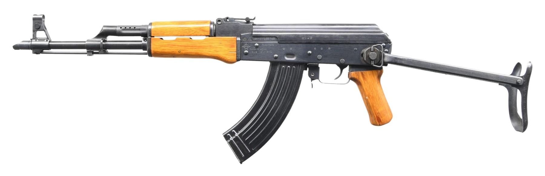 Cal. 7.62x39. S# 520743. Bbl. 16 1/2' with slant muzzle brake. Post front sight with hood. Pre-Ban Norinco Type 56/AKMS-style rifle with Siles import marking. Trunnion has arsenal "66" marking. Tangent rear sight graduated to 800m. Blued finish. Underfolding stock. Asian hardoowd pistol grip and handguards. Cleaning rod present. MAGS: one 30rd. CONDITION: forend and pistol grip show a couple moderate gouges and some handling marks. Metal retains 93% original blue, with some wear on the stock and scattered, light handling & edge wear. Action functions properly when hand-cycled. Bright, near excellent bore. PROVENANCE: the lifelong collection of Terrence McCarty. (24-474/MJC). MODERN. $1,000-1,500.