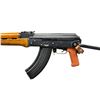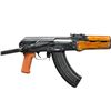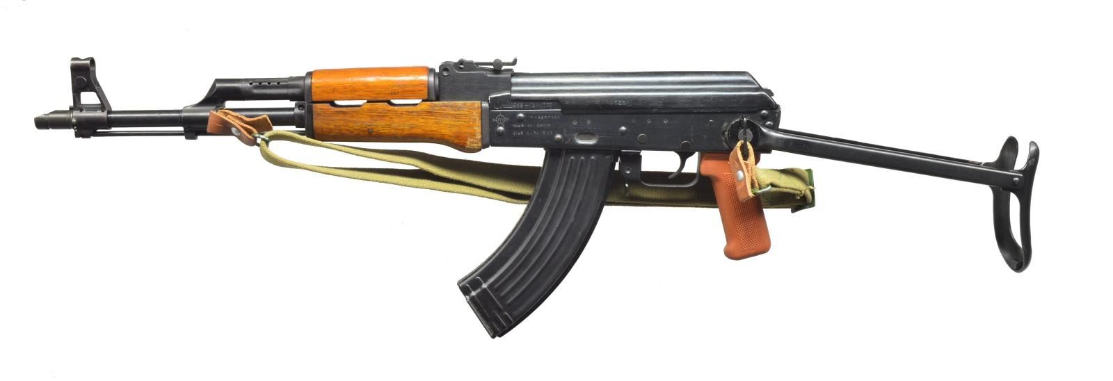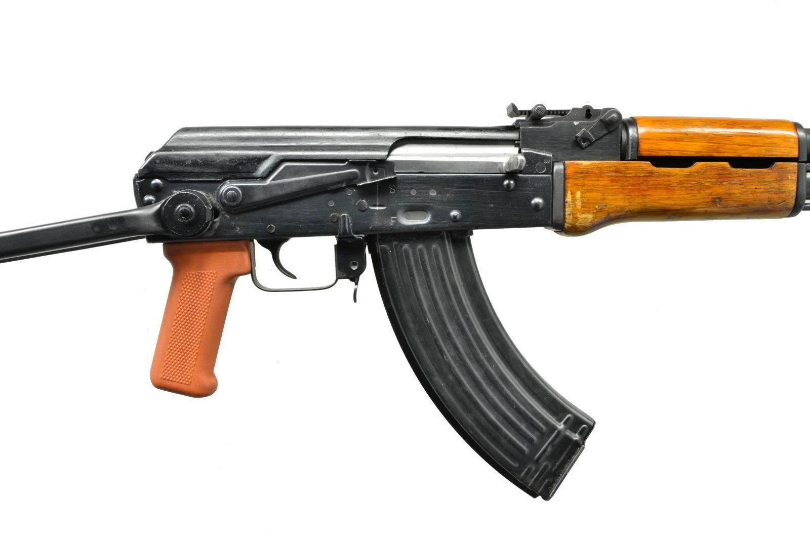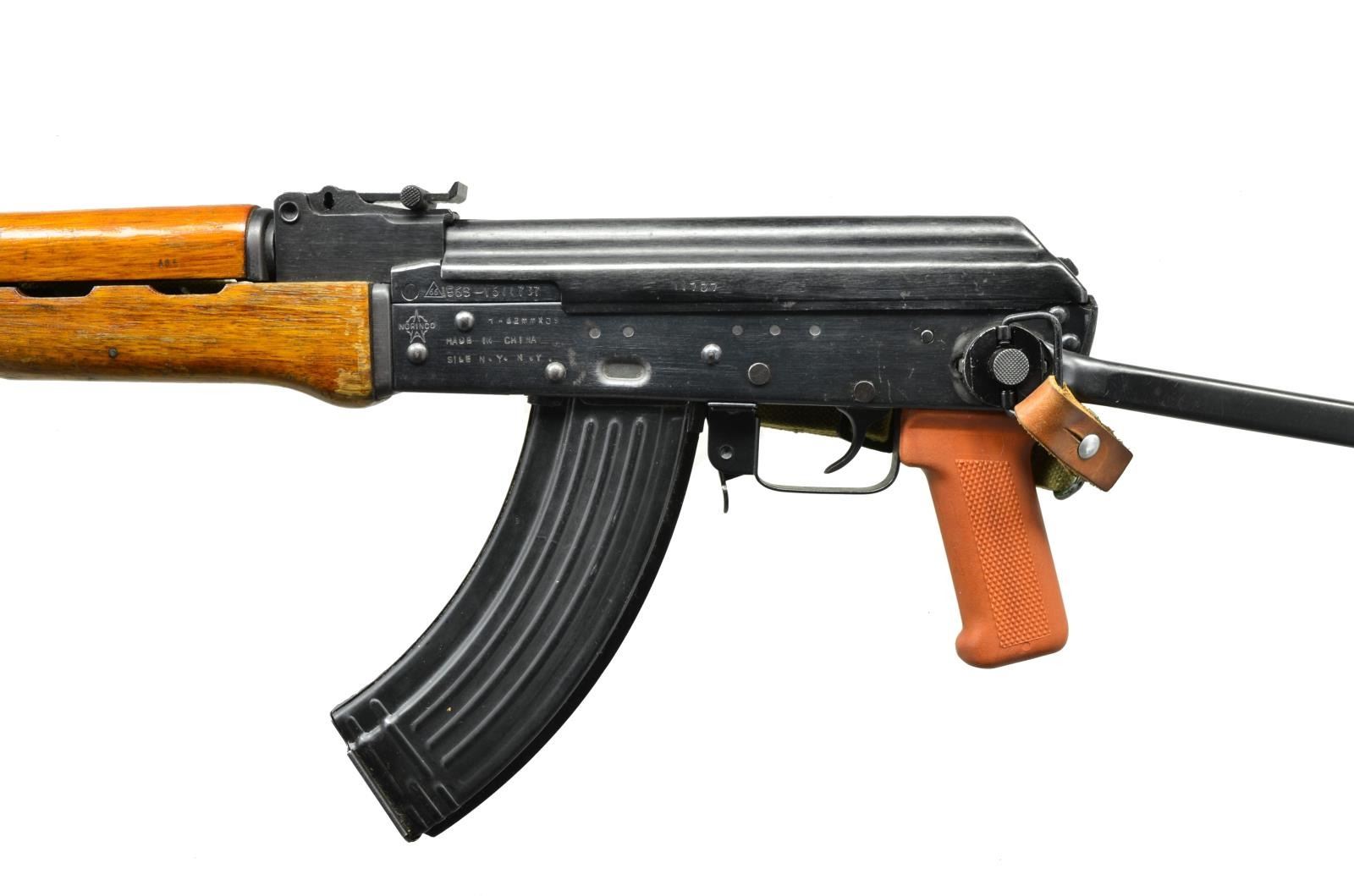 Cal. 7.62X39. S# 1611737. Bbl. 16". A very early semi-auto under folding AK-47 variant imported from Norinco, China through SILE NY, NY. Blued finish on exposed metal surfaces. Front trunnion marked "156S" along w/ the triangle 66 Arsenal mark. Import markings on left side of receiver. "MADE IN CHINA"/ "SILE N.Y. N.Y." w/ familiar Norinco logo. Correct yellow/red tinted wooden furniture & plastic pistol grip w/ under folding stock. Reinforced stamped receiver. Proper slant muzzle break in front of hooded post front sight. Gas block/ bayonet lug play host to on board cleaning rod. Tangent rear sight marked to 800 meters. Right side controls. Matching numbers on several sm. parts & receiver. Left side mounted faded green canvas sling. MAGS: 1 metal 30 rd. CONDITION: exterior surfaces still retain the vast majority of their original finish. Some areas of thinning in receiver & handguard wear due to mechanical intervention w/ stock. Front sight block has a few sm. spots of weld, possibly separated earlier from the now correct functioning break. Shiny bore w/ strong rifling. Fire control mechanism appears to function correctly when cycled by hand. Folding stock locks tightly in opened position, though does not engage the lock in the folded position. (21-1949/JZ). MODERN. $1,000-1,500.