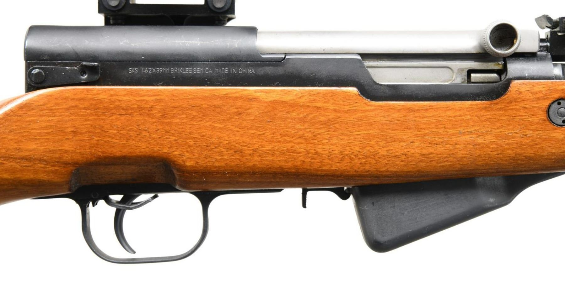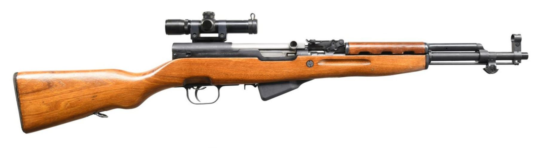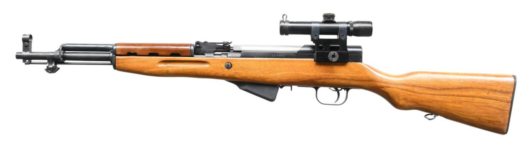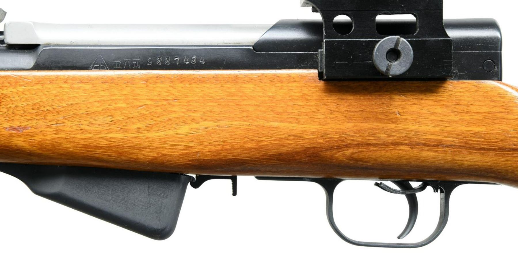 WITH SCOPE. Cal.7.62x39. S# 9227434. All visible numbers match. Bbl. 16 1/2". Import marked on right side of receiver. Tangent rear sight graduated to 1,000 meters. Post front sight w/ protective hood. Left rear of receiver fitted w/ dovetailed scope mt. having a telescopic sight marked only "4X20". Duplex reticle. Receiver is marked on left side w/ triangle "26". Rifle mfg. in 1965. Bayonet is not present. Cleaning rod under bbl. Sling swivels on side of gas cyl. & bottom of buttstock. Ambidextrous safety. UNATTACHED ACCESSORIES: matching cardboard shipping box. Accessory kit in butt trap. Clamp on flash suppressor, green web sling, instruction manual, scope covers, oil bottle, & fired case all in red plastic pouch. CONDITION: wood & metal in very good condition retaining most of finish w/ scattered handling marks. Lower end has missing chip between front of mag. & bayonet recess. Scope optics appear clear & serviceable. Bolt hold open device does not engage bolt. Very good shiny bore. PROVENANCE: The Collection of Gun Sport Ltd owned by Jon R. Thomas. (23-3656/RW). CURIO. $400-600.