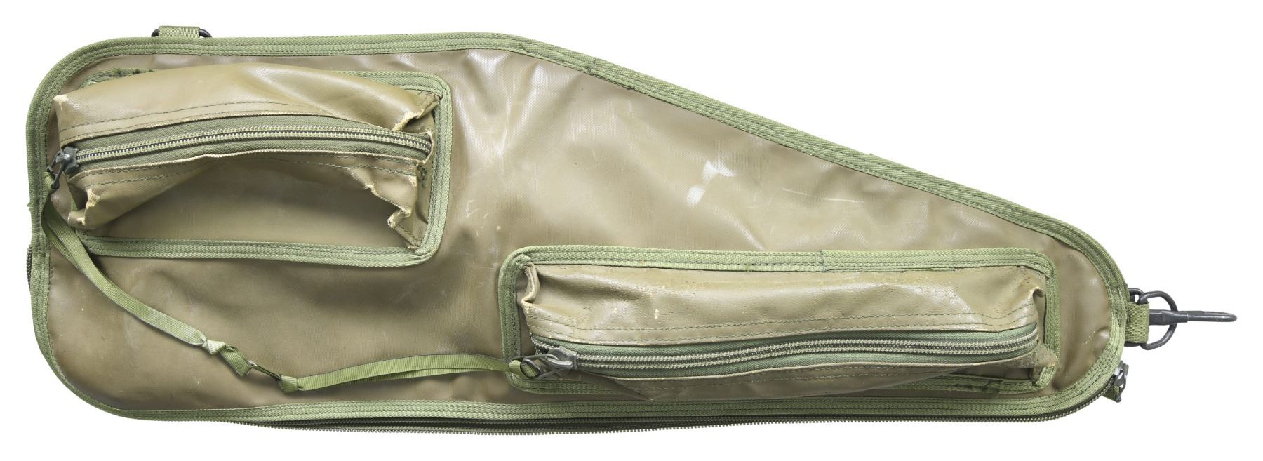 Cal.7.62x39mm. S# 407323. Bbl. 16.25". A classic Type 56S-1 carbine from Norinco w/ the desirable under folding shoulder stock. Hooded post front sight. Tangent style rear sight marked from CQB to 800 Meters. Flush thread protector. Bayonet lug hosts onboard cleaning rod. Orange / red forearm & heat shield. Checkered wooden pistol grip. Trunnion marked w/ the Triangle 66 arsenal mark & "56S-1" w/ serial number. Left side receiver marked: "NORINCO BCI/USA / MADE IN CHINA. Metal exterior surfaces appear to have been painted in a subdued black & brown camo pattern. MAGS: 1 steel 30 rd. UNATTACHED ACCESSORIES: green rubber barrel bag. CONDITION: home finish fairly complete w/ some drag lines on high spots & in areas of mechanical intervention. Stock locks correctly in open & folded configurations. Bore is bright w/ strong rifling. Fire control mechanism appears to function correctly when cycled by hand. (25-3026/JZ). MODERN. $500-900.