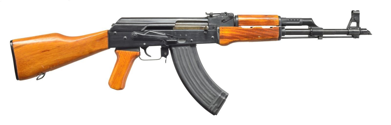 Cal. 7.62x39. S# 300496. Bbl. 16". A very early semi-auto AK-47 variant imported from China through Import Arms Company Sacramento, CA. Blued finish on exposed metal surfaces. Front trunnion marked "56S" along w/ the triangle 66 Arsenal mark. Import markings on bottom of receiver "IA CO SAC CA"/ PRC 7.62 NORINCO". Correct yellow/red tinted wooden furniture & reinforced stamped receiver. Proper slant muzzle break in front of hooded post front sight. Gas block/ bayonet lug play host to on board cleaning rod. Tangent rear sight marked to 800 meters. Right side controls. Trap door butt stock includes cleaning kit remainder. Matching numbers on several sm. parts & receiver. Front handguard slotted to accept folding bayonet. MAGS:1 metal 30 rd. CONDITION: exterior surfaces still retain the vast majority of their original finish. The only exception is in the area of receiver & selector where a fine line wears almost immediately to due mechanical intervention. Bright bore w/ aggressive rifling. Fire control mechanism appears to function correctly when cycled by hand. (21-1450/JZ). MODERN. $800-1,200.