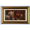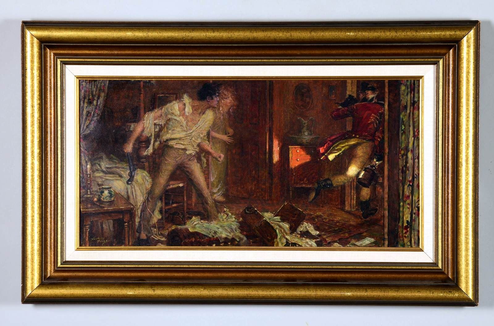 INTRUDER". Oil on artist board interior bedroom scene with a nightstand beside a bed with a pipe, candlestick, humidor and a cordial glass on top. A man stands with tattered clothes, clenched fist and a revolver in his right hand looking like he is ready to fight. His wife peers from what looks like a closet door with lawmen escorting out an intruder with a glowing lantern to light the way. The floor in the bedroom shows signs of a struggle with clothes turned out of a suitcase and thrown around on the floor. Signed lower left "Norman Price". Housed in a molded gold frame with fabric liner. SIZE: overall 21" x 33", sight 15" x 27 1/2". CONDITION: surface all original with no sign of in-painting or restoration. Very good. PROVENANCE: from a Private Florida Collection. (05-936/TG). $2,000-3,000.