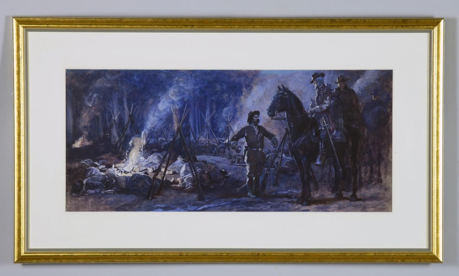 ENCAMPMENT. Illustration depicts soldiers asleep in the night; General Lee on horseback with other officers conversing with the night watchmen. Signed lower right "Norman Price". Housed in a molded gold and gilt frame, matted under glass. SIZE: overall 21 1/2" x 37 1/2", sight 12 1/2" x 28 1/2". CONDITION: surfaces appear untouched, very good overall. PROVENANCE: from a Private Florida Collection. (05-902/TG). $2,500-3,500.