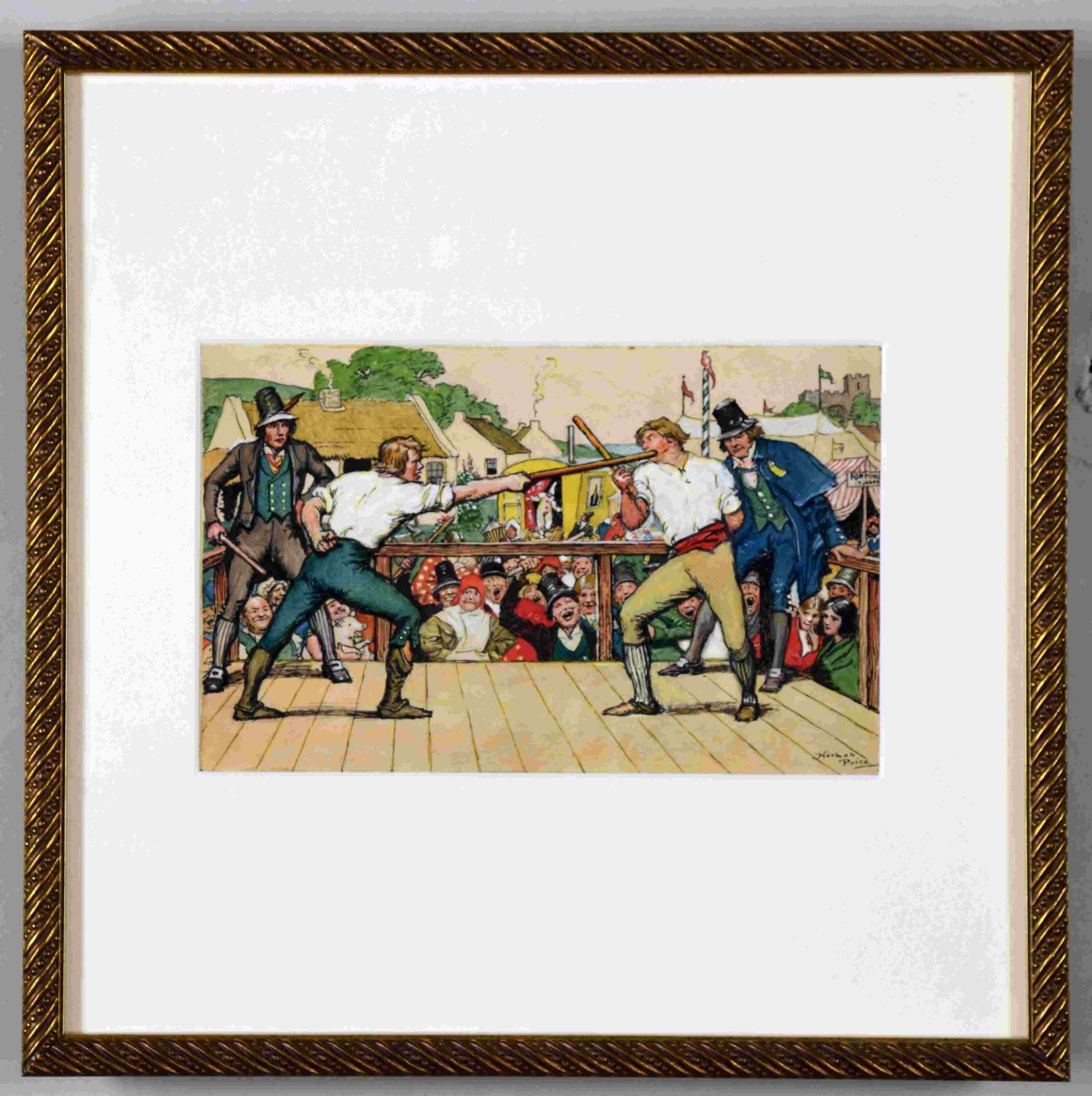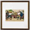 CARNIVAL FIGHT FROM OLDEN TIMES". Pen, ink and gouache illustration depicting a fight with batons in the town square, a crowd looking on. Signed lower left. Housed in a gilt rope twist frame, matted under glass. SIZE: overall 13 1/2" x 13 1/2", sight 6" x 9 1/4". CONDITION: very good original condition with good color. PROVENANCE: from a Private Florida Collection. (05-894/TG). $500-700.