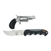 ACTION REVOLVER WITH CRKT KNIFE & MATCHING FACTORY CASE. Cal. 22 Mag. S# TTT0052. Bbl. 1 5/8". Model NAA-22M-CRKT single action revolver mfg. by North American Arms. Right side of frame is marked with NAA's mfg. information above the cal. designation, with the S# present on the underside of the frame. Metal components exhibit an unpolished stainless steel finish. Frame is mounted with a 1-piece textured rubber grip. Half-moon front sight with frame square notch rear sight. UNATTACHED ACCESSORIES matching factory case with sleeve containing a matching CRKT Kommer Free Range clip point knife. knife and scabbard with integral holster. CONDITION: metal components exhibit few marks from handling and storage, with a dragline present around the cyl. Bright bore, exhibiting strong rifling throughout. Grip is very good overall. Knife is very good overall. Case sleeve shows some mild wear, but otherwise remains sturdy and serviceable. PROVENANCE: The Collection of Gun Sport Ltd owned by Jon R. Thomas (23-4453/MLW). MODERN. $275-400.