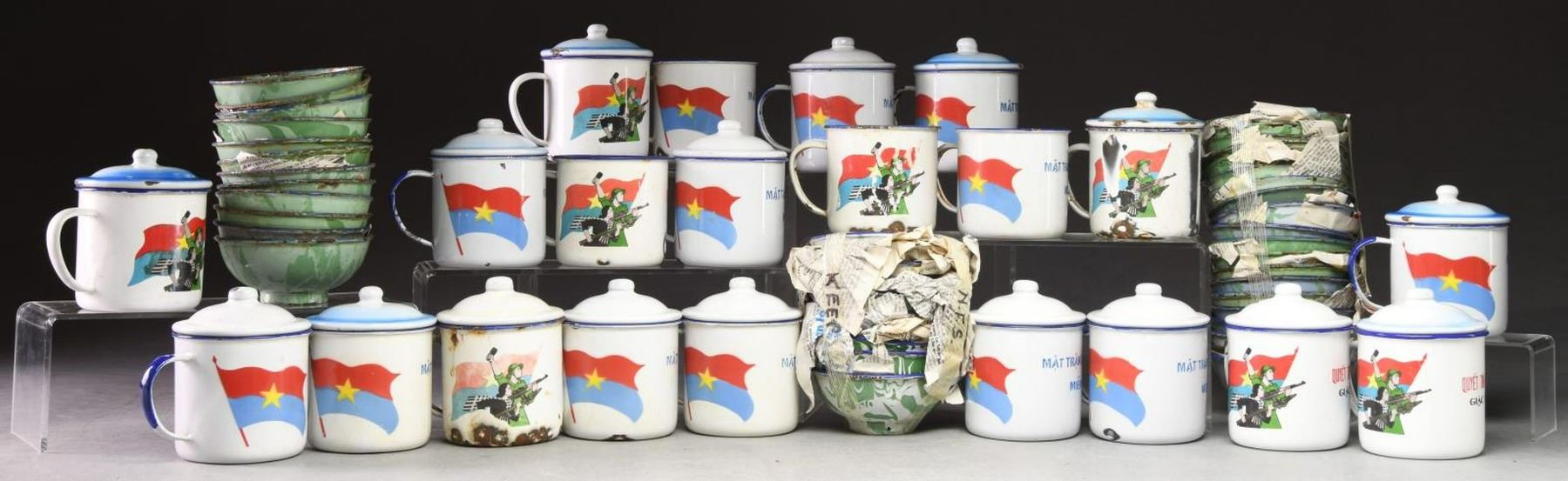 This lot consists of 21 North Vietnamese patriotic enamelware cups. Most cups have a North Vietnamese flag on one side with words on the opposite side. Some cups have male & female North Vietnamese Soldiers superimposed over the flag. The base of some cups is dated “1968”. / 18 Enamelware lids for the above patriotic cups. / 42 Green marbleized enamelware rice bowls. CONDITION: the cups generally show light wear, as do the lids. The rice bowls show moderate wear with some oxidation where the enamel is worn. PROVENANCE: from the Lifelong Collection of Glen E. Mattox. (02-18684/BF). $400-700.