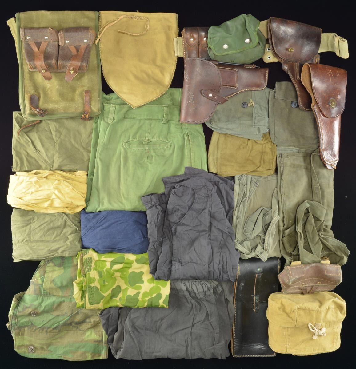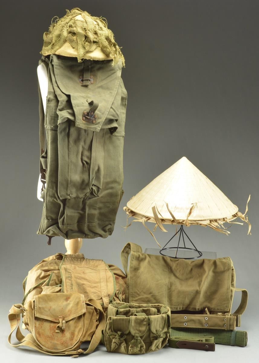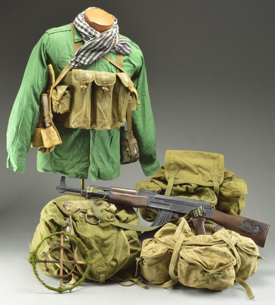 This large and varied group of North Vietnamese field equipment & related militaria includes 11 military belts and buckles, most with 5 pointed stars on the buckles / 1 Viet Cong crossbow / 1 NVA pair of binoculars / 1 Drum magazine carrying pouch / 1 Plain aluminum mess kit / 2 Aluminum engraved & decorated mess kits / 1 Dark khaki cotton canvas over the shoulder bag / 2 Conical grass hats / 1 Green cotton canvas bandolier / 1 Camouflage pouch / 2 Cotton belts with star buckles / 2 Leather pistol holsters / 1 Leather 2 clip pouch / 1 Cotton canvas belt with star buckle having a leather holster, rubberized canvas pouch & leather clip pouch attached / 1 NVA black pajama type uniform / 1 Pair of green cotton pants / 1 Khaki cotton sash / 2 Green cotton sashes / 1 Blue cotton sash / 1 Camouflage nylon piece of cloth / 1 Black leather map case / 6 Assorted pouches & bags / 1 Large notebook containing photographs showing NVA troops in the field / 1 NVA pith helmet with khaki cotton & burlap cover / 1 NVA green cotton uniform shirt on mannequin with canteen on strap, 4 pocket stick grenade pouch with grenades, bandolier with 3 large pockets & 2 small pockets likely for automatic weapon clips, and black & white cotton neck scarf / 1 Hard plastic display copy of an AK-47 rifle / 1 Large green cotton canvas knapsack / 1 Medium sized khaki cotton knapsack / 1 Medium sized green cotton canvas knapsack / 1 Medium sized khaki cotton knapsack with green trim / 1 Dark green cotton canvas backpack for carrying rockets. CONDITION: items vary widely in condition, most show some degree of field use. Most items are still functional and reasonably complete with all associated parts. (02-16428-4/BF). $800-1,200.
