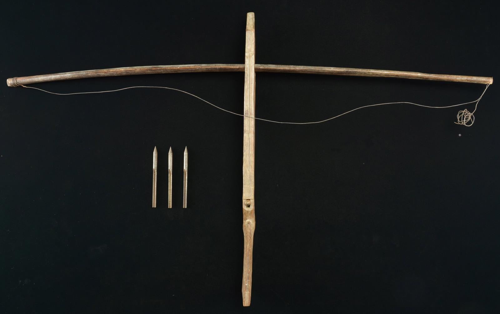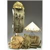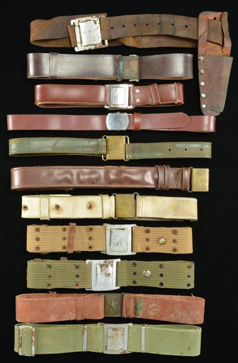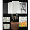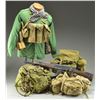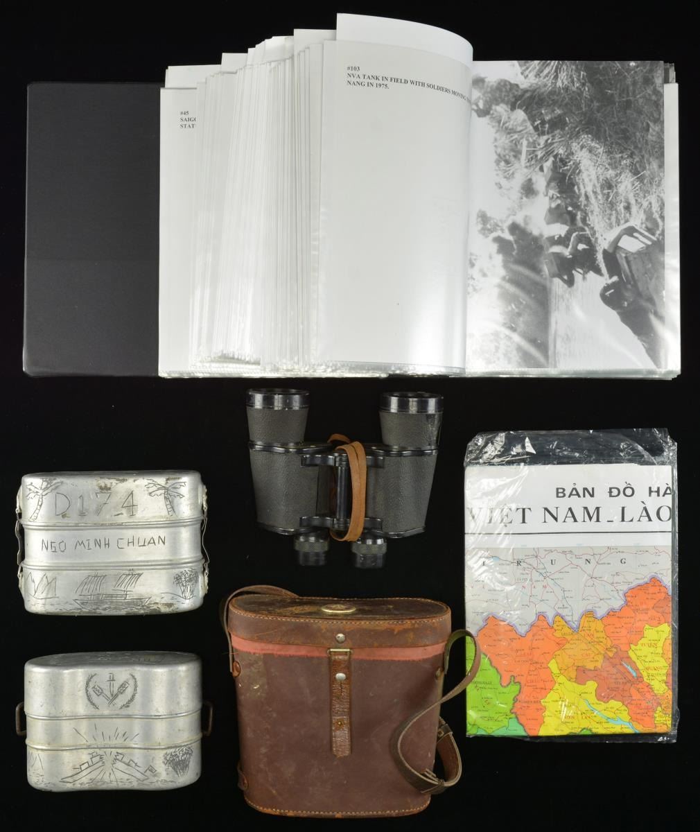 This large and varied group of North Vietnamese field equipment & related militaria includes 11 military belts and buckles, most with 5 pointed stars on the buckles / 1 Viet Cong crossbow / 1 NVA pair of binoculars / 1 Drum magazine carrying pouch / 1 Plain aluminum mess kit / 2 Aluminum engraved & decorated mess kits / 1 Dark khaki cotton canvas over the shoulder bag / 2 Conical grass hats / 1 Green cotton canvas bandolier / 1 Camouflage pouch / 2 Cotton belts with star buckles / 2 Leather pistol holsters / 1 Leather 2 clip pouch / 1 Cotton canvas belt with star buckle having a leather holster, rubberized canvas pouch & leather clip pouch attached / 1 NVA black pajama type uniform / 1 Pair of green cotton pants / 1 Khaki cotton sash / 2 Green cotton sashes / 1 Blue cotton sash / 1 Camouflage nylon piece of cloth / 1 Black leather map case / 6 Assorted pouches & bags / 1 Large notebook containing photographs showing NVA troops in the field / 1 NVA pith helmet with khaki cotton & burlap cover / 1 NVA green cotton uniform shirt on mannequin with canteen on strap, 4 pocket stick grenade pouch with grenades, bandolier with 3 large pockets & 2 small pockets likely for automatic weapon clips, and black & white cotton neck scarf / 1 Hard plastic display copy of an AK-47 rifle / 1 Large green cotton canvas knapsack / 1 Medium sized khaki cotton knapsack / 1 Medium sized green cotton canvas knapsack / 1 Medium sized khaki cotton knapsack with green trim / 1 Dark green cotton canvas backpack for carrying rockets. CONDITION: items vary widely in condition, most show some degree of field use. Most items are still functional and reasonably complete with all associated parts. (02-16428-4/BF). $800-1,200.