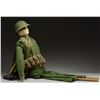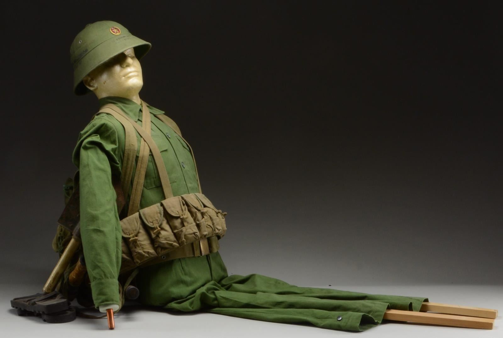 This lot, displayed on a partial mannequin, includes uniform pants & shirt with regulation green canvas belt & buckle. The soldier wears a backpack with entrenching tool, a 4 pocket grenade pouch with NVA Dewat grenades, & a 10 pocket cartridge belt with shoulder sling. The soldier has a canteen on his belt with appropriate cotton canvas sling. Completing the uniform is a green pith helmet with red star badge on the front, and a pair of Ho Chi Minh “tire tread” sandals. CONDITION: uniform appears unissued, but equipment shows light to moderate wear, as do the hat & sandals. PROVENANCE: From the Lifelong Collection of Glen E. Mattox. (02-18626/BF). $400-600.