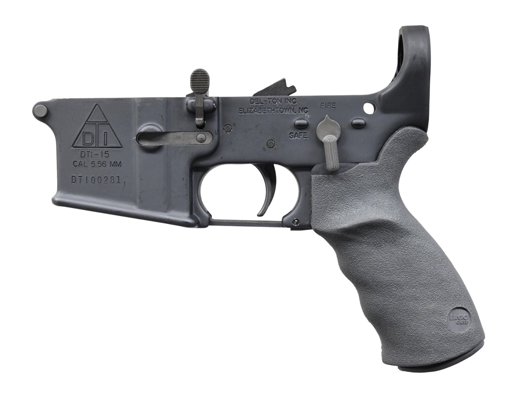 BARRELED RIFLE LOWER RECEIVER. Cal. 5.56mm. S# DT100281. DTI-15 receiver originally mfg. by Del-Ton Inc. and later registered as an SBR by Northern Maine Tactical Supply. Left side of the receiver exhibits standard Del-Ton mfg. markings, with "NMTS/ FT FAIRFIELD ME" engraved on the right. Receiver features a black anodized finish, and is fitted with a textured black rubber Ergo Grip. CONDITION: very good, with scattered light superficial marks from handling and storage, as well as some light scratches overall. Grip shows some light wear, but otherwise is very good overall. PROVENANCE: From the Estate of Ivan Lee Shapiro. NATIONAL FIREARMS ACT SHORT BARRELED RIFLE REQUIRING BATF TRANSFER BEFORE TAKING POSSESSION. FULLY TRANSFERABLE. (03/1776/MLW). MODERN CLASS III. $300-400.