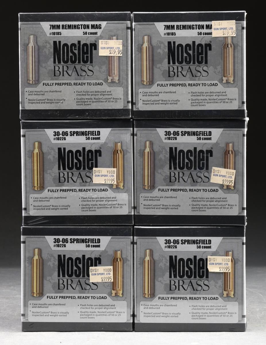 Lot includes 4 boxes (200 pieces) Nosler brass, fully prepped, ready to load, 30-06 & 2 boxes (100 pieces) Nosler brass, 7mm Rem Mag. CONDITION: All are in sealed factory packaging, as new. PROVENANCE: The Collection of Gun Sport Ltd owned by Jon R. Thomas. (02-20854-4/JZ) $500-650.