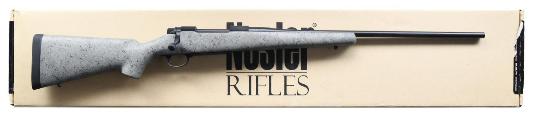 FACTORY BOX. Cal. 270 Win. S# N02542. Bbl 24 1/2". M48 Patriot bolt action rifle mfg. by Nosler. Cal. designation on right side of bbl. at breech, with "Nosler M48" followed by "BEND, OR" on left side of receiver. Matte black Cerakote finish, with aramid fiber reinforced composite buttstock. UNATTACHED ACCESSORIES: matching factory box. CONDITION: near new, with metal components retaining virtually all of their original factory finishes overall. Mirror bore, exhibiting well defined rifling throughout. Stock is excellent. Box shows some mild exterior wear, but otherwise remains sturdy and serviceable. PROVENANCE: The Collection of Gun Sport Ltd owned by Jon R. Thomas. (23-3713/MLW). MODERN. $800-1,200.