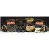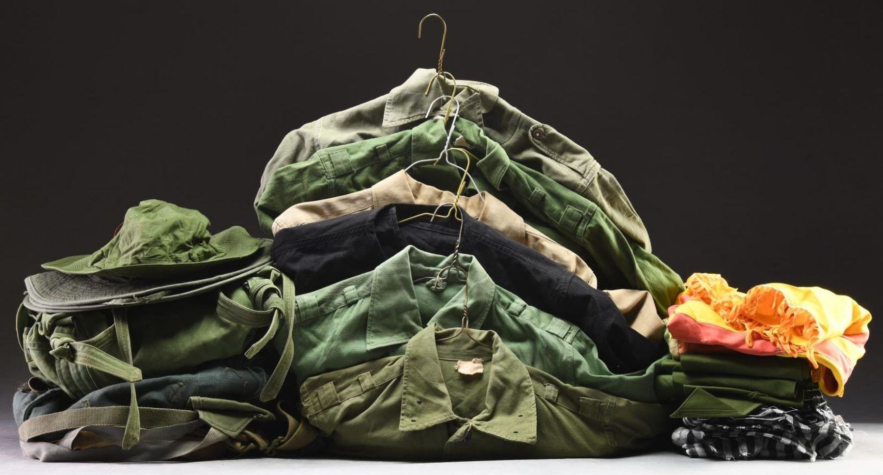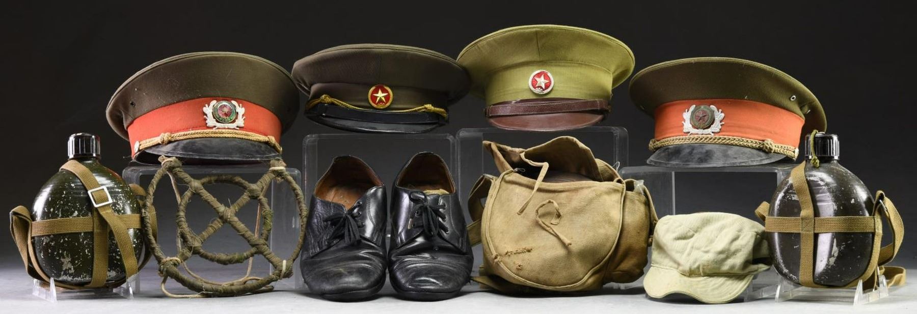 This lot includes, but is not limited to, 7 shirts, mostly OD green & black. / 3 Backpacks containing rubber sandals. / 3 Boonie caps. / 3 Canteens. / 2 Bandoleers. / 4 Caps; two appear to be Army Dept. of Logistics. / 1 Drum for RPD style rifle with tan carrying case. CONDITION: items have a wide range of condition, but balance appears good, showing wear & staining. Oxidation on metal parts. PROVENANCE: from the Lifelong Collection of Glen E. Mattox. (02-18637/MD). $200-400.