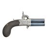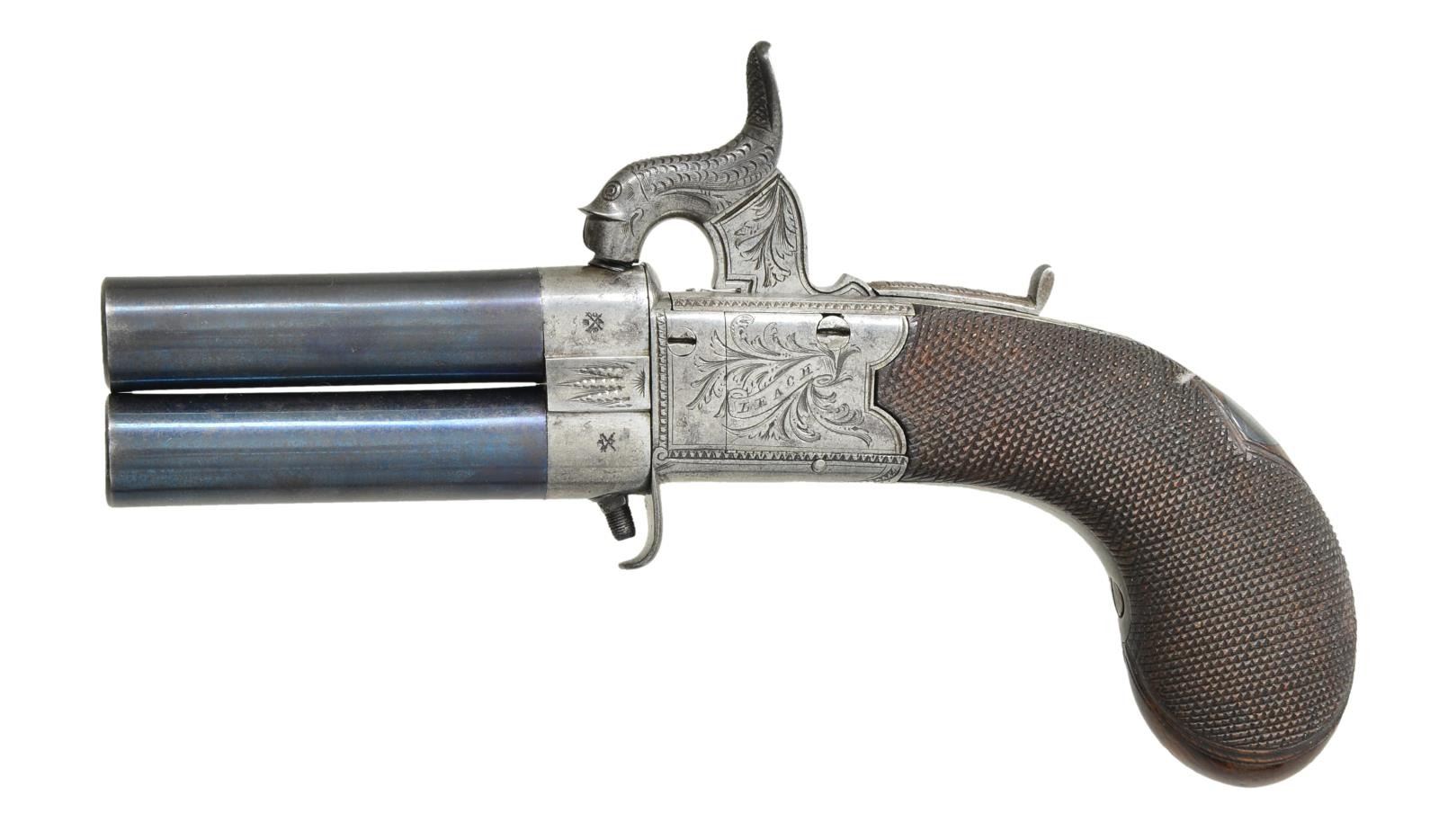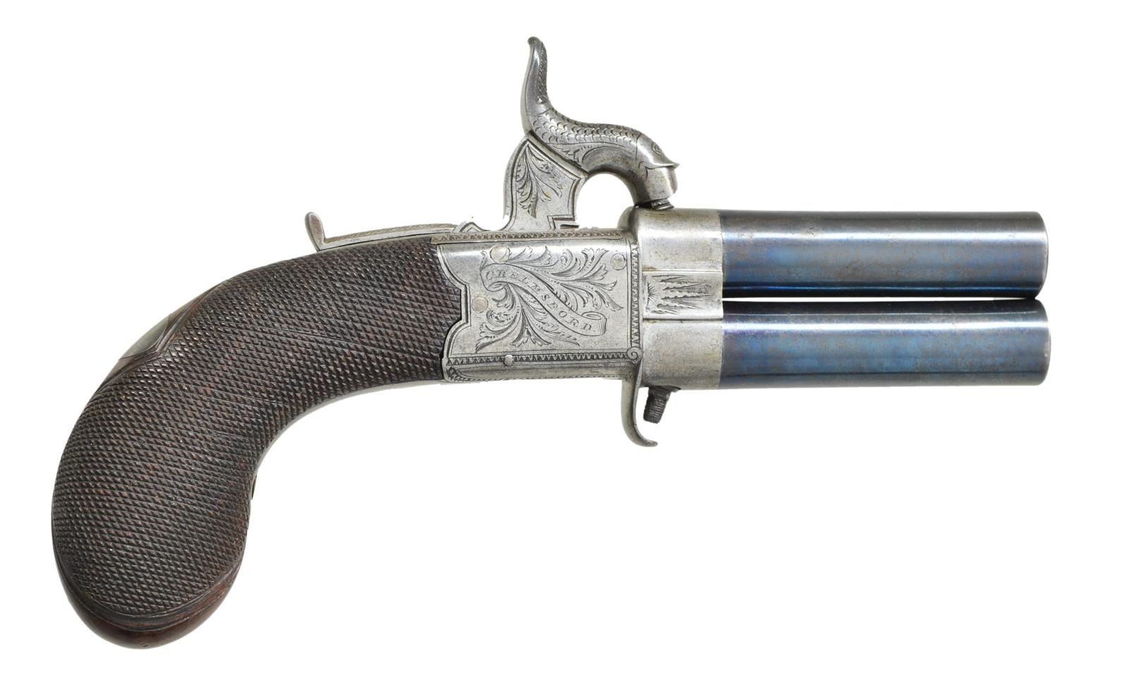 POCKET PISTOL BY LEACH OF CHELMSFORD. Cal. 44. NSN. Blued turnoff smooth bore bbls. have stars at muzzles for wrench. Pivoting breech stamped with Birmingham proofs. Steel boxlock action with tall hammer having stylized dolphin head, has sliding safety at rear. Action and hammer are engraved with open acanthus within geometric borders. "LEACH" is engraved on ribbon on left side of action. "CHELMSFORD" is on right (working 1839-69). Folding trigger extends when pistol is cocked. Walnut bag grip is near fully checkered and has silver oval at top rear. CONDITION: very good. Bbl. with old temper reblue. Action is mostly silver to gray patina. Grip with most of its original oil finish, shows little wear. Bores are shiny. Mechanically good. PROVENANCE: Estate Collection of Kenneth Horn (Grandson of JC Higgins). (01-20620/MGM). ANTIQUE. $600-1,000.